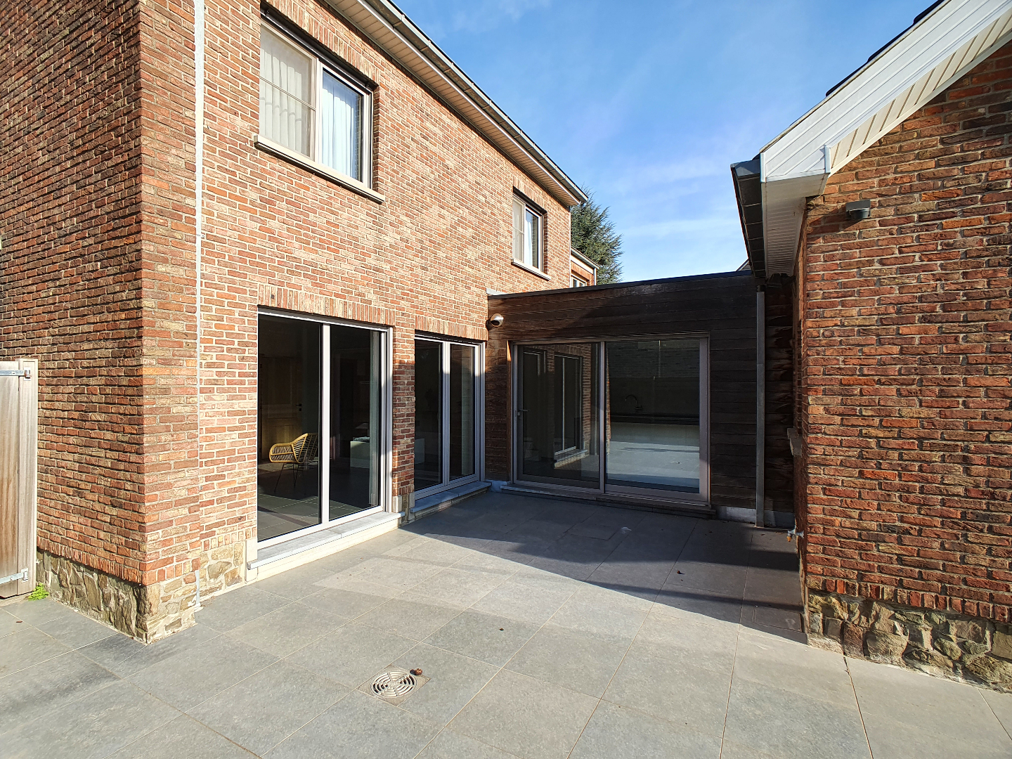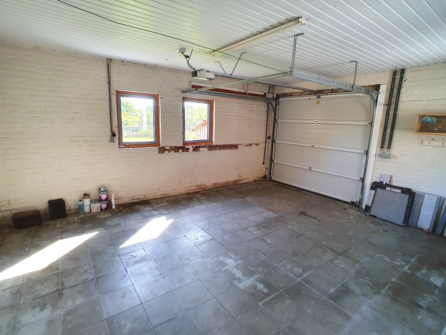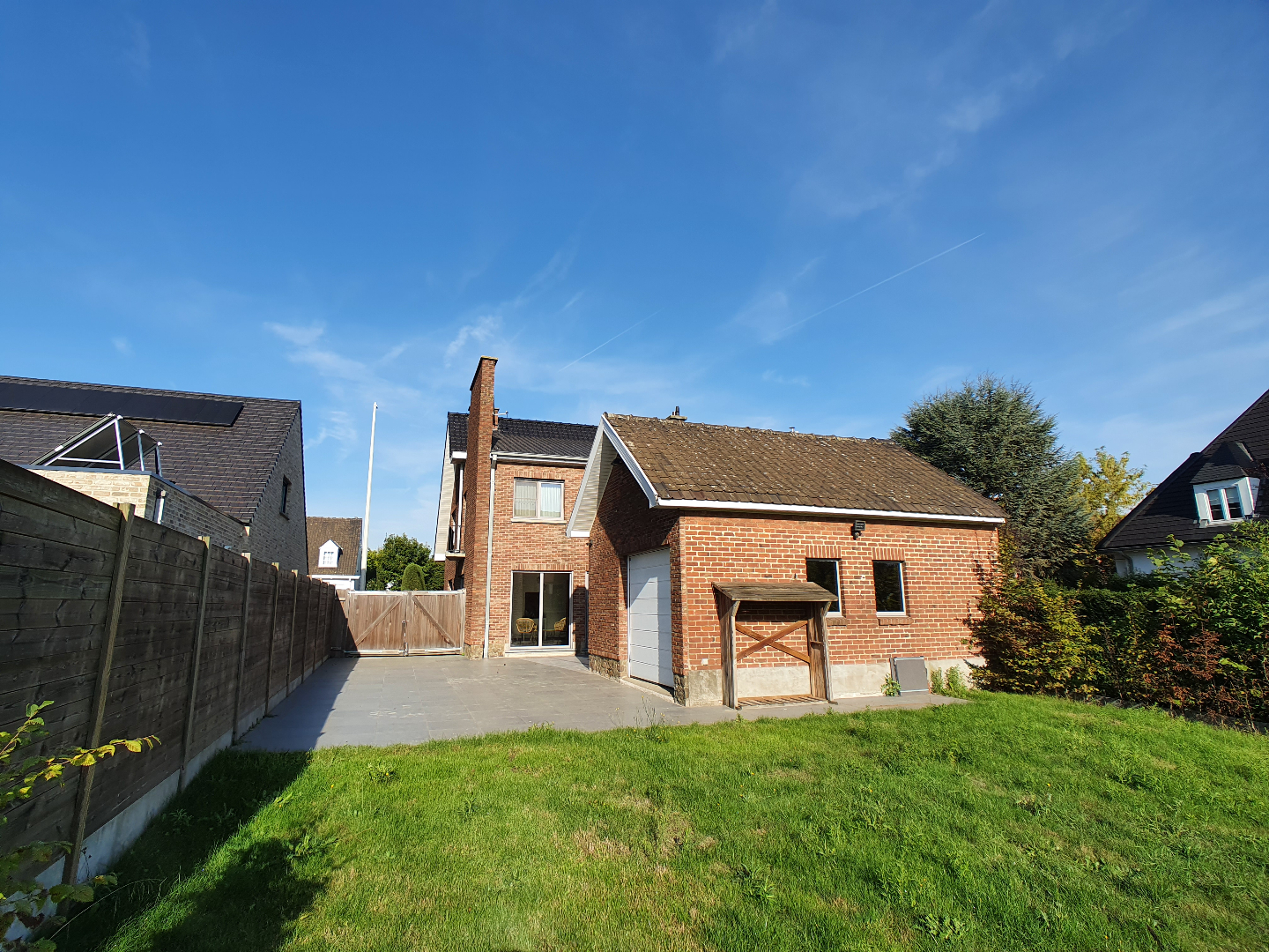 De grote tuin beschikt over een zeer ruim terras en via de lange oprit met poort kunnen we naar de achterliggende garage.