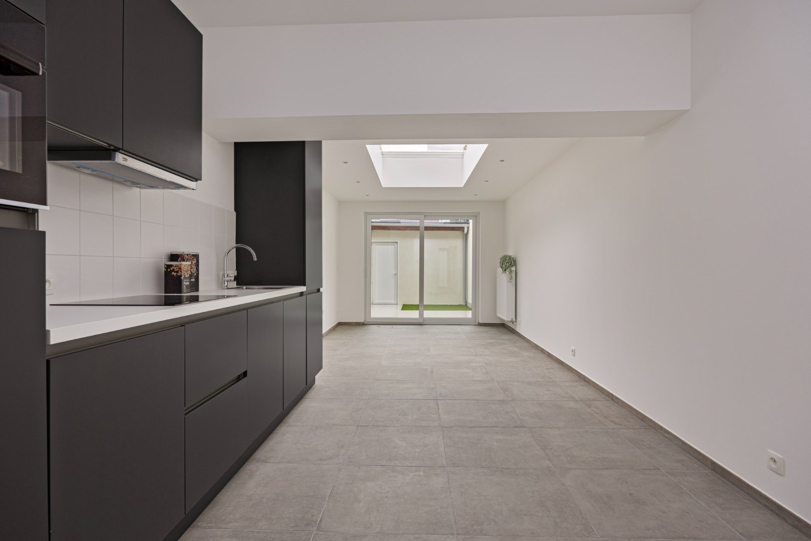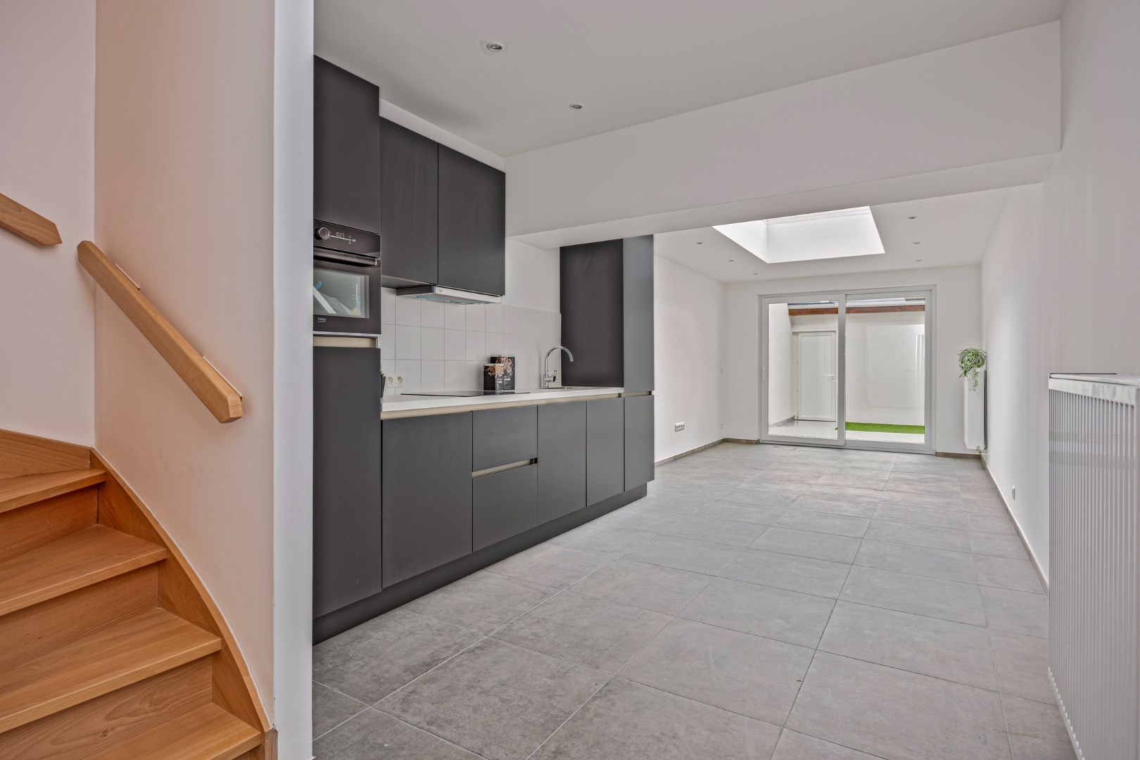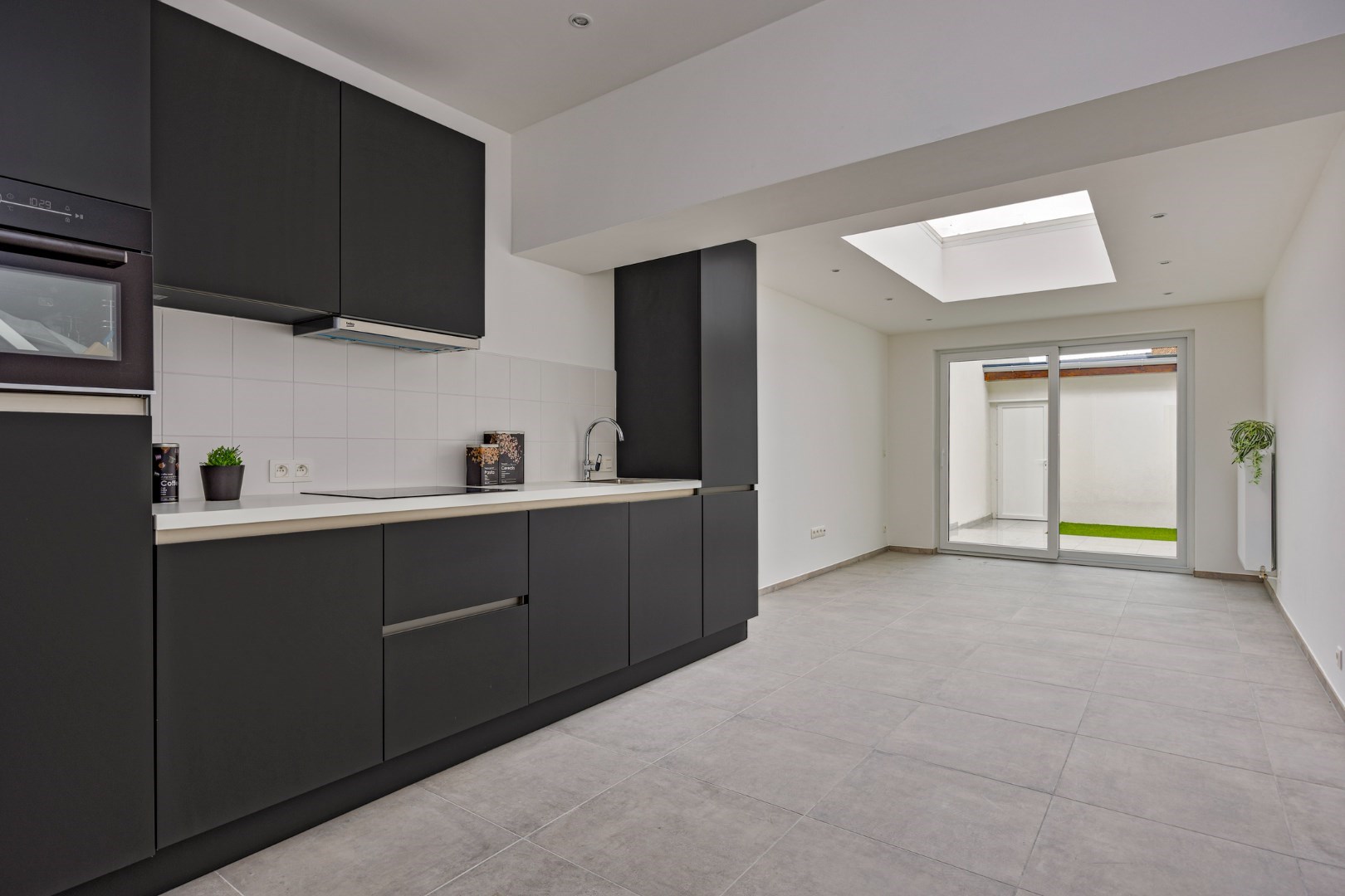 Door de lichtkoepel en het grote schuifraam is in de leefruimte heel lichtrijk. Er is ook zicht op de kleine maar leuke stadstuin.