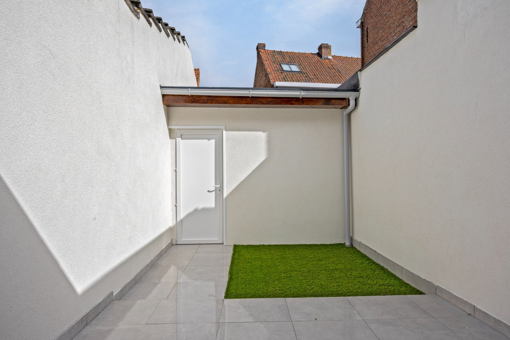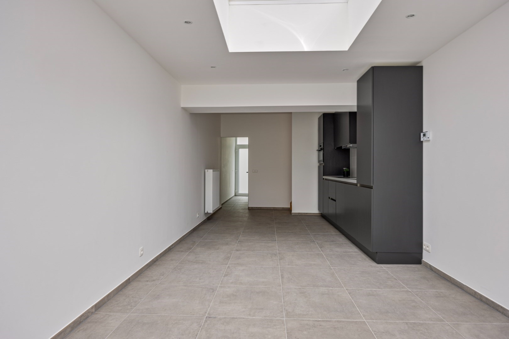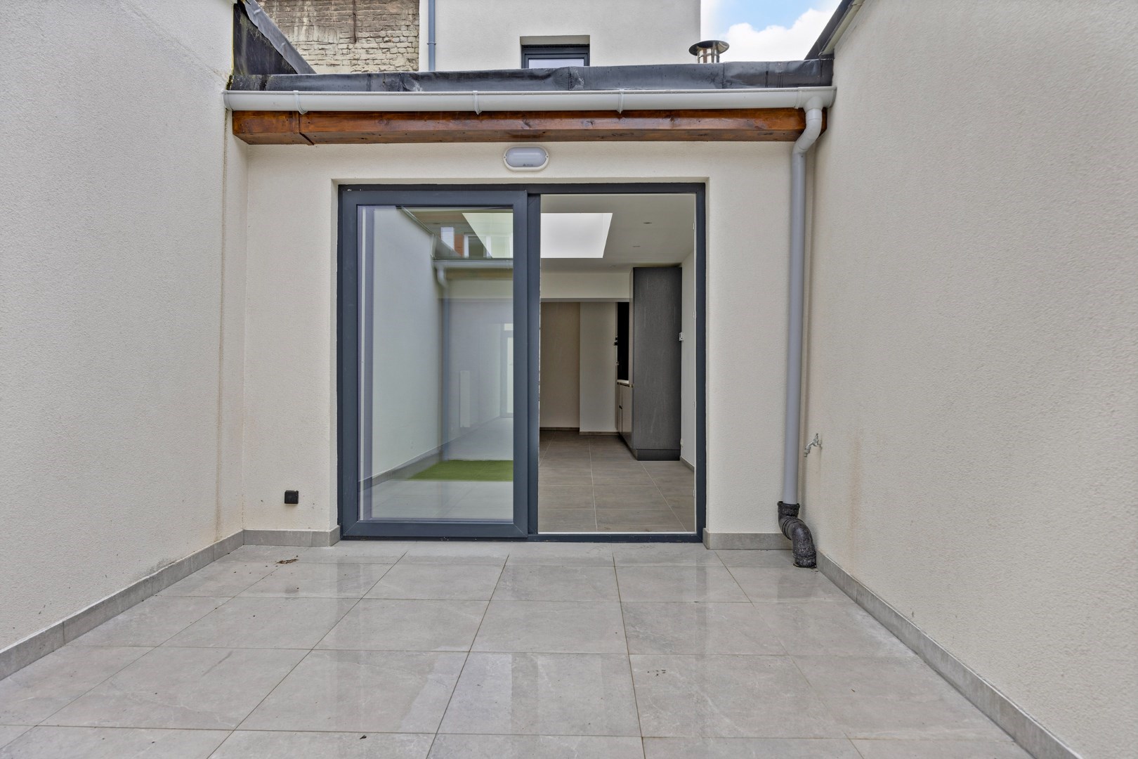 Door de lichtkoepel en het grote schuifraam is in de leefruimte heel lichtrijk. Er is ook zicht op de kleine maar leuke stadstuin.