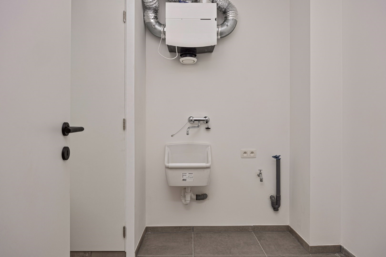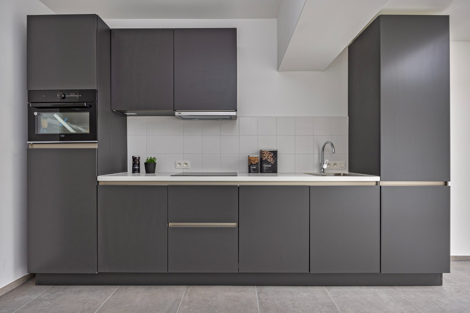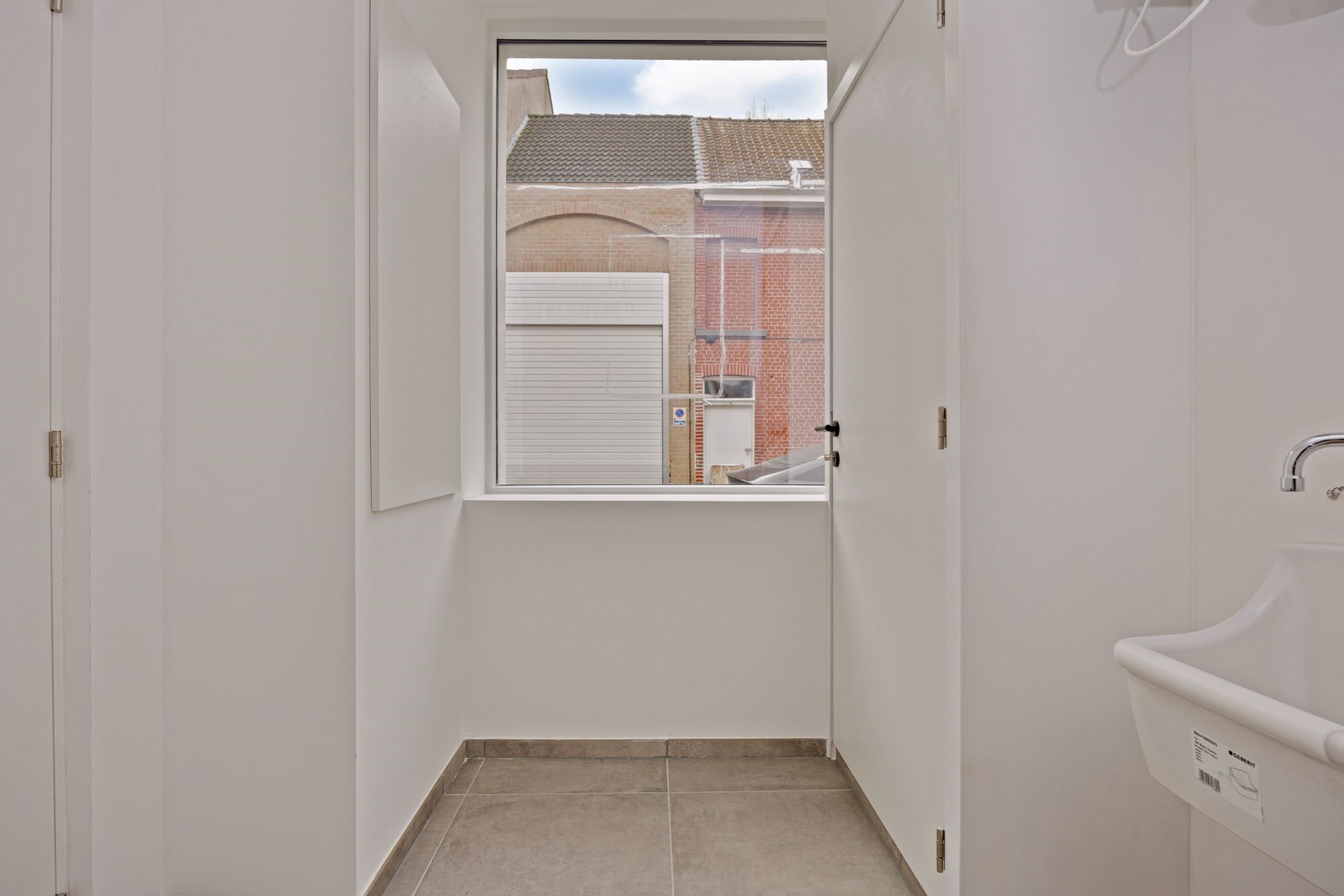 We komen de woning binnen in de inkomhal en vinden er toegang tot de technische ruimte langs de voorzijde van de woning. Naast een uitgietbak is er hier plaats voor een wasmachine, droogkast, diepvriezer, …. Verder is er op de gang een gastentoilet. Vervolgens stappen we naar de leefruimte met open keuken. De keuken is uitgerust met een oven, koelkast, kookplaat, dampkap en vaatwasmachine.