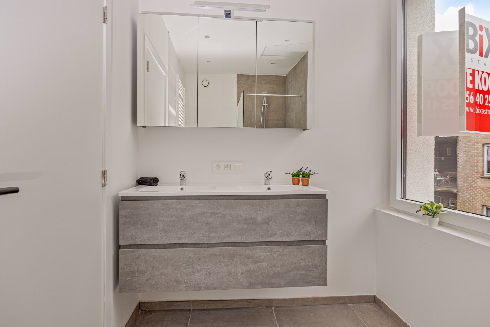 Op de eerste verdieping is er een mooie, grote slaapkamer en de badkamer. De badkamer heeft een dubbele lavabo, douche en toilet.
