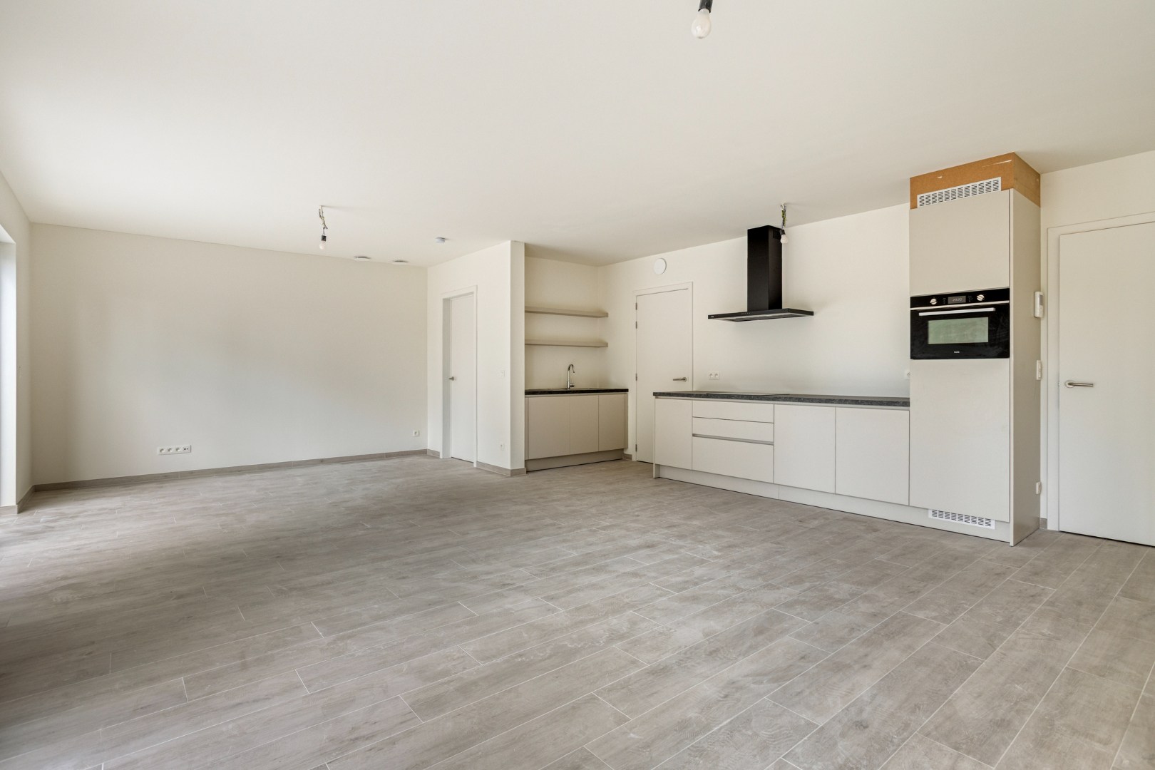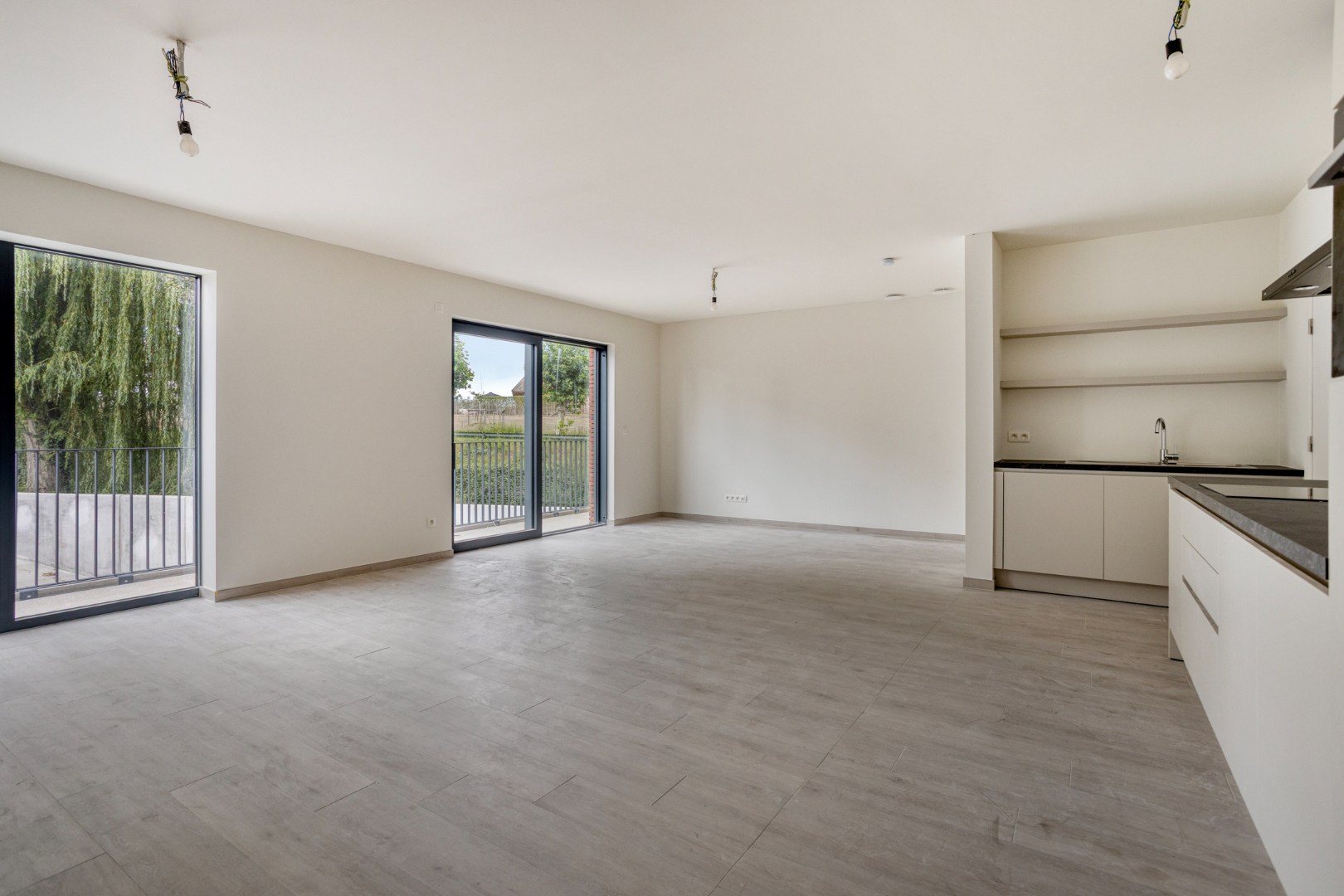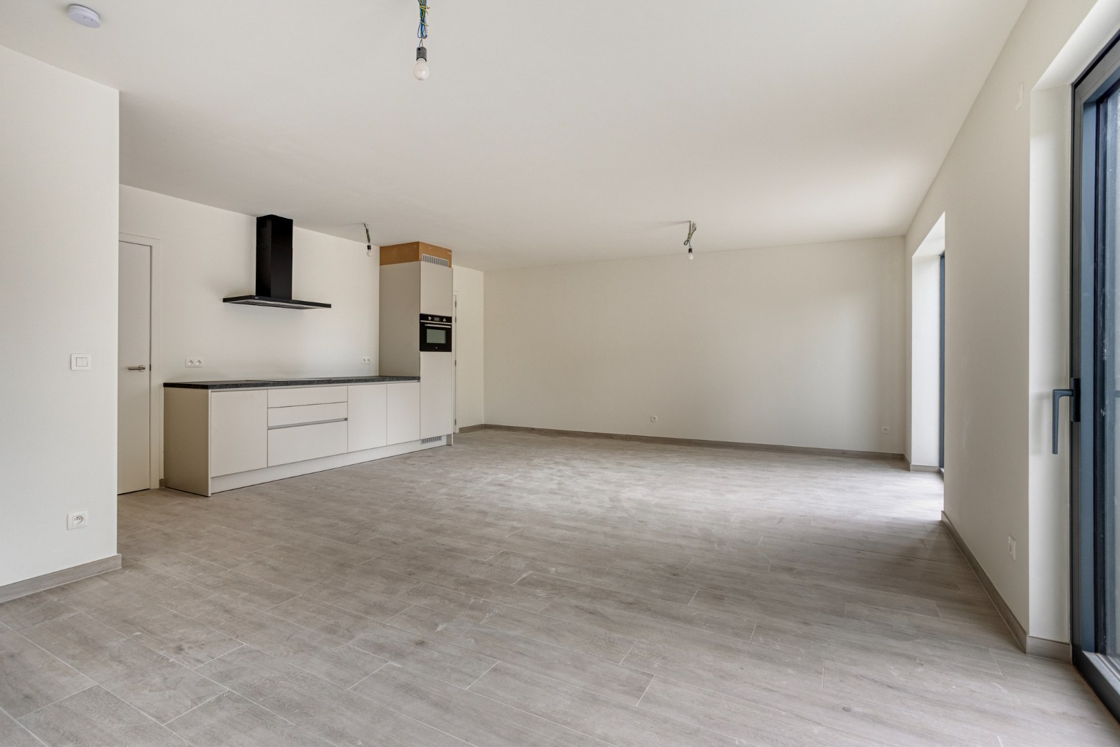 We komen in de hal met apart gastentoilet om verder te gaan naar de leefruimte. Hier komt zeer veel licht binnen door de grote schuiframen en de open keuken is voorzien van alle toestellen. Aansluitend hebben we een ruime berging.