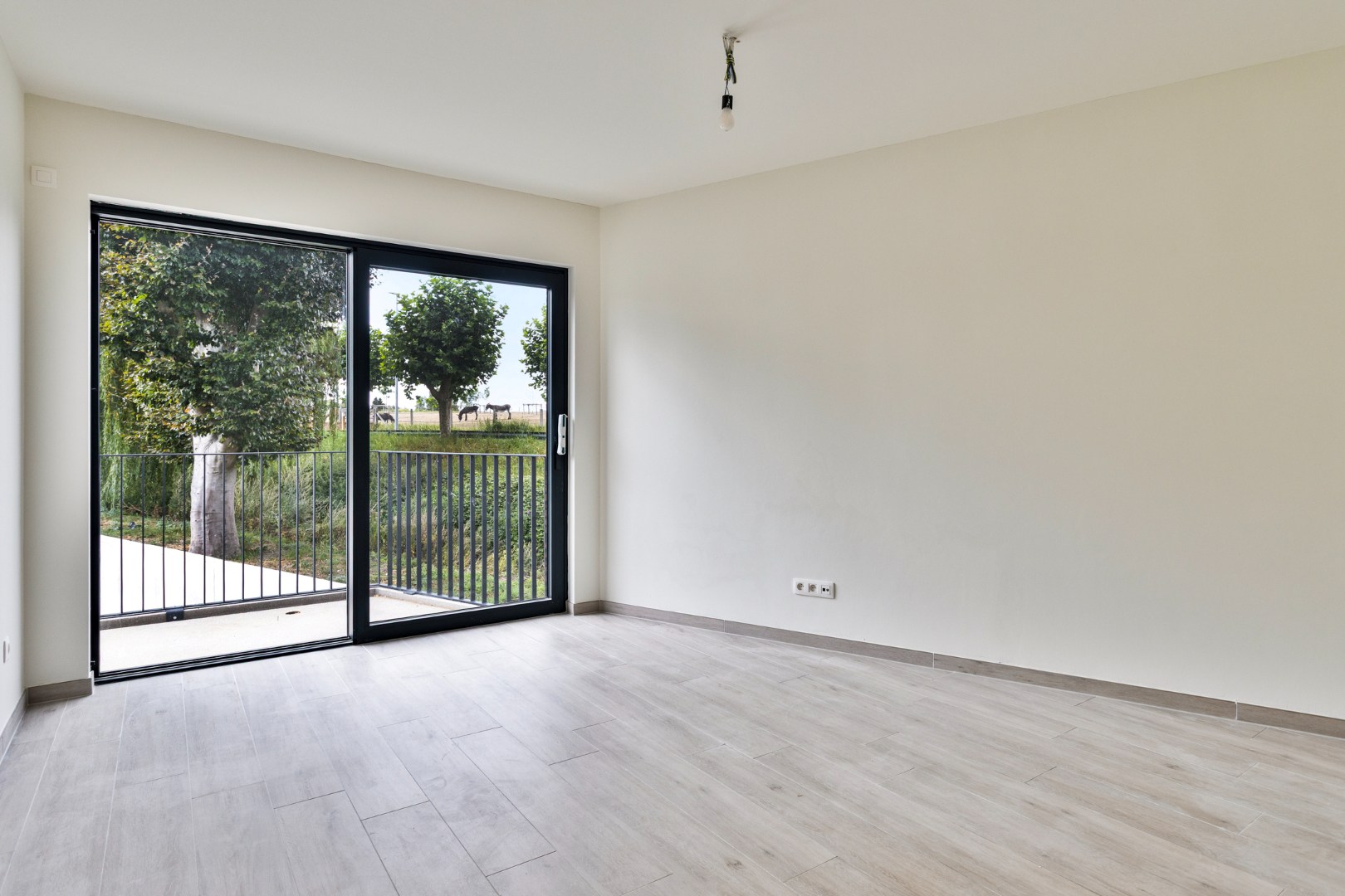 Via de living kunnen we naar het grote terras met een ideale west-oriëntatie. Van hieruit hebben we een zicht op de prachtige groene omgeving!