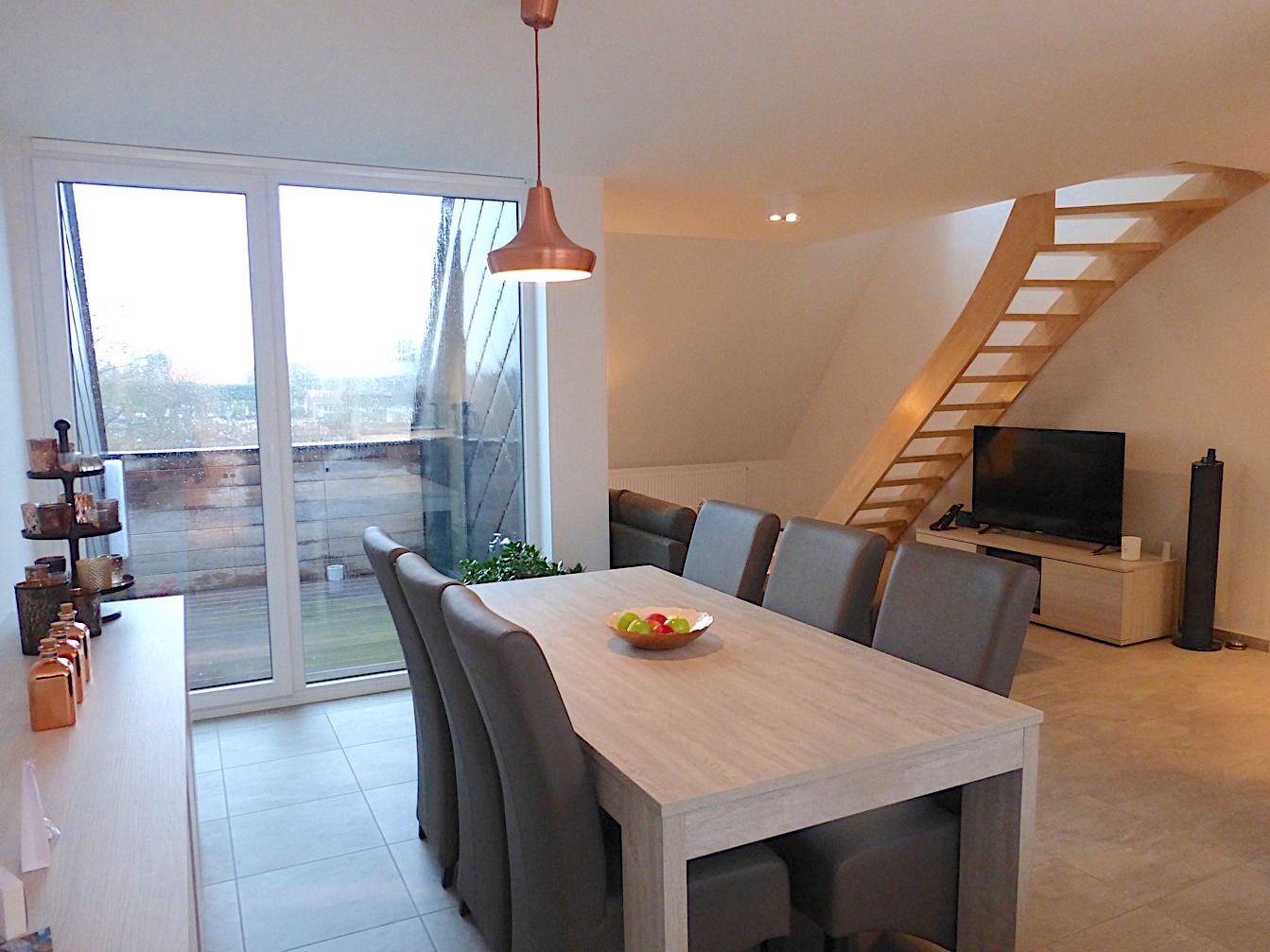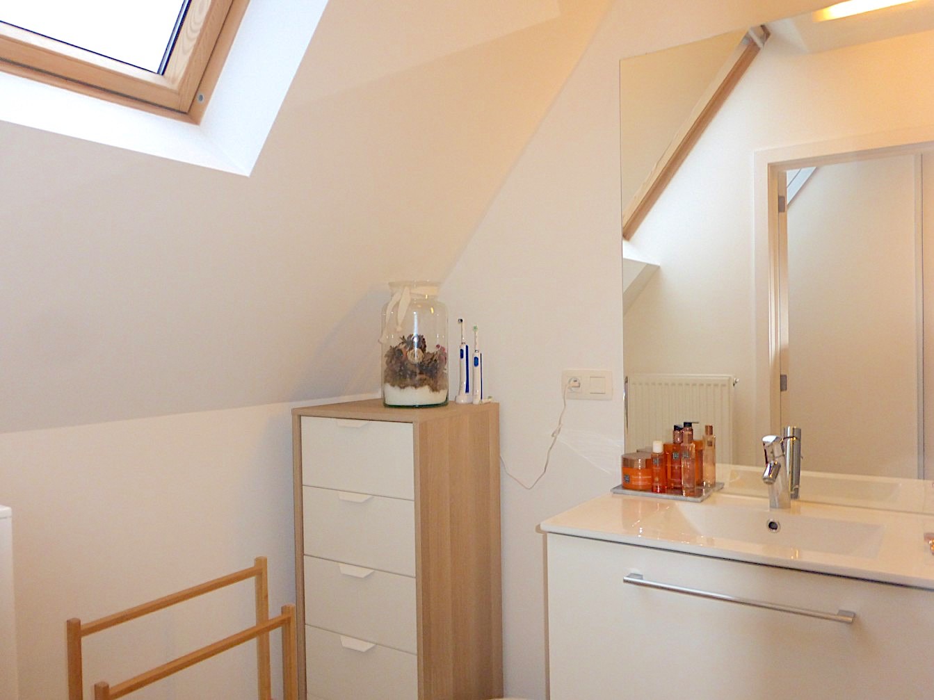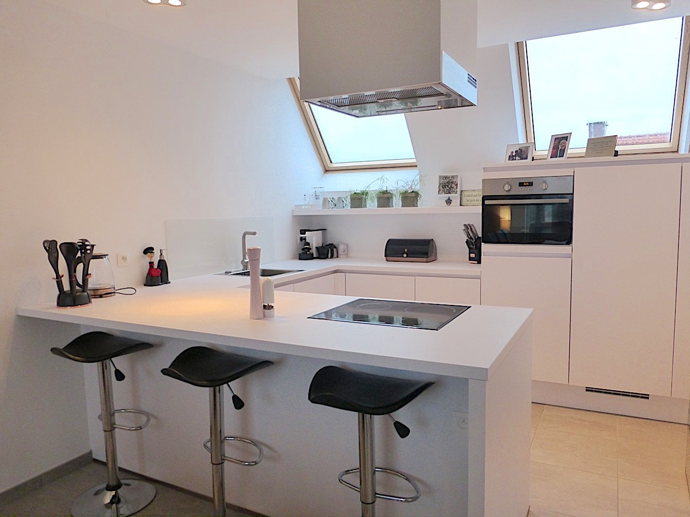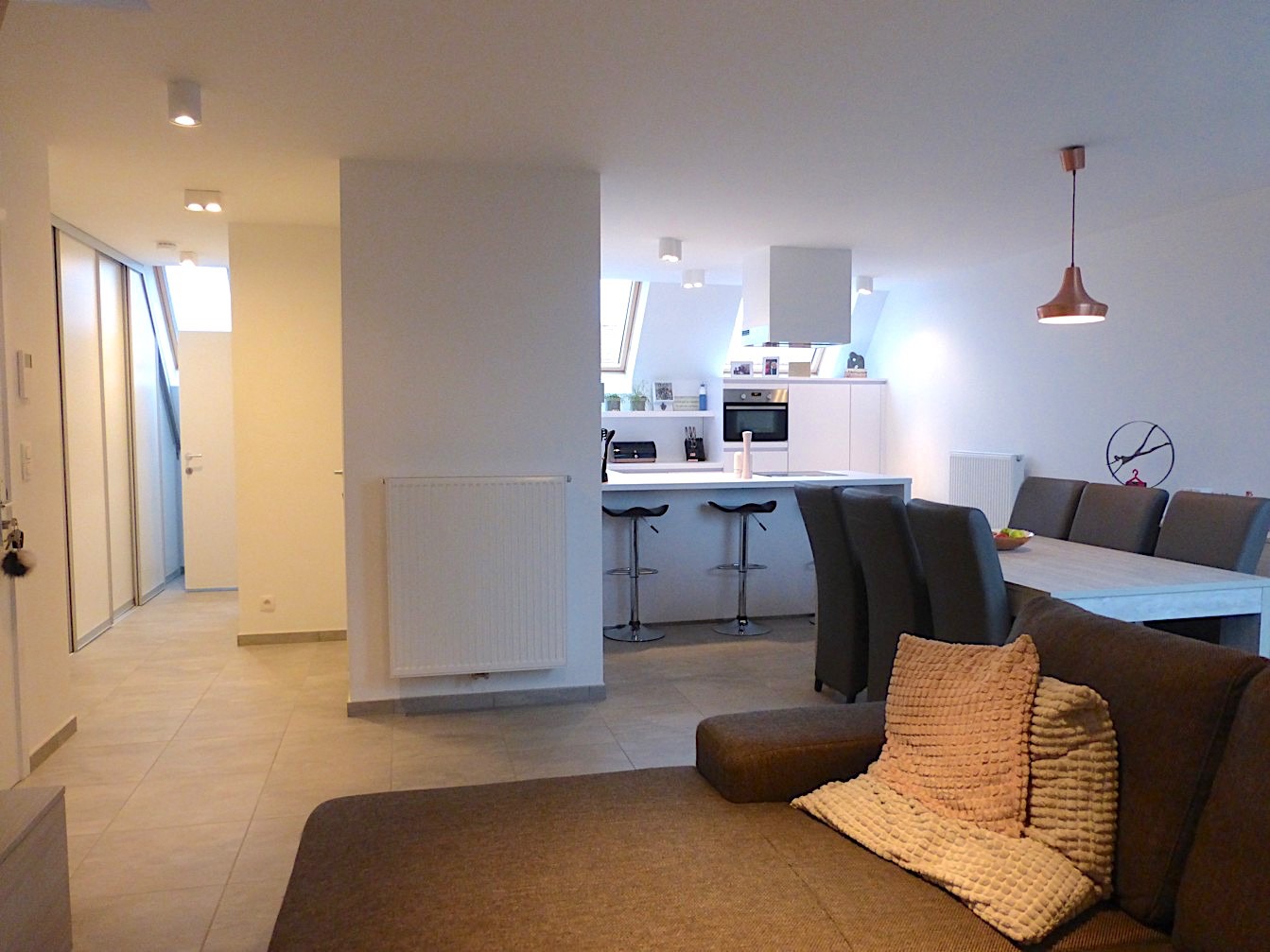 In de kleine residentie "Thierry" vinden we dit super leuk appartement op de 2e verdieping. Bij het binnenkomen van het gebouw merken we meteen dat het over een degelijk en eigentijds gebouw gaat. Via de lift gaan we naar het appartement. Door de trendy architectuur is deze duplex apart in haar soort! De living is open met de keuken en de open trap versterkt het "loftgevoel". De keuken is voorzien van alle toestellen en op maat gemaakt. Verder is er een zeer grote ingemaakte bergkast, een apart toilet en badkamer met lavabomeubel en inloopdouche.