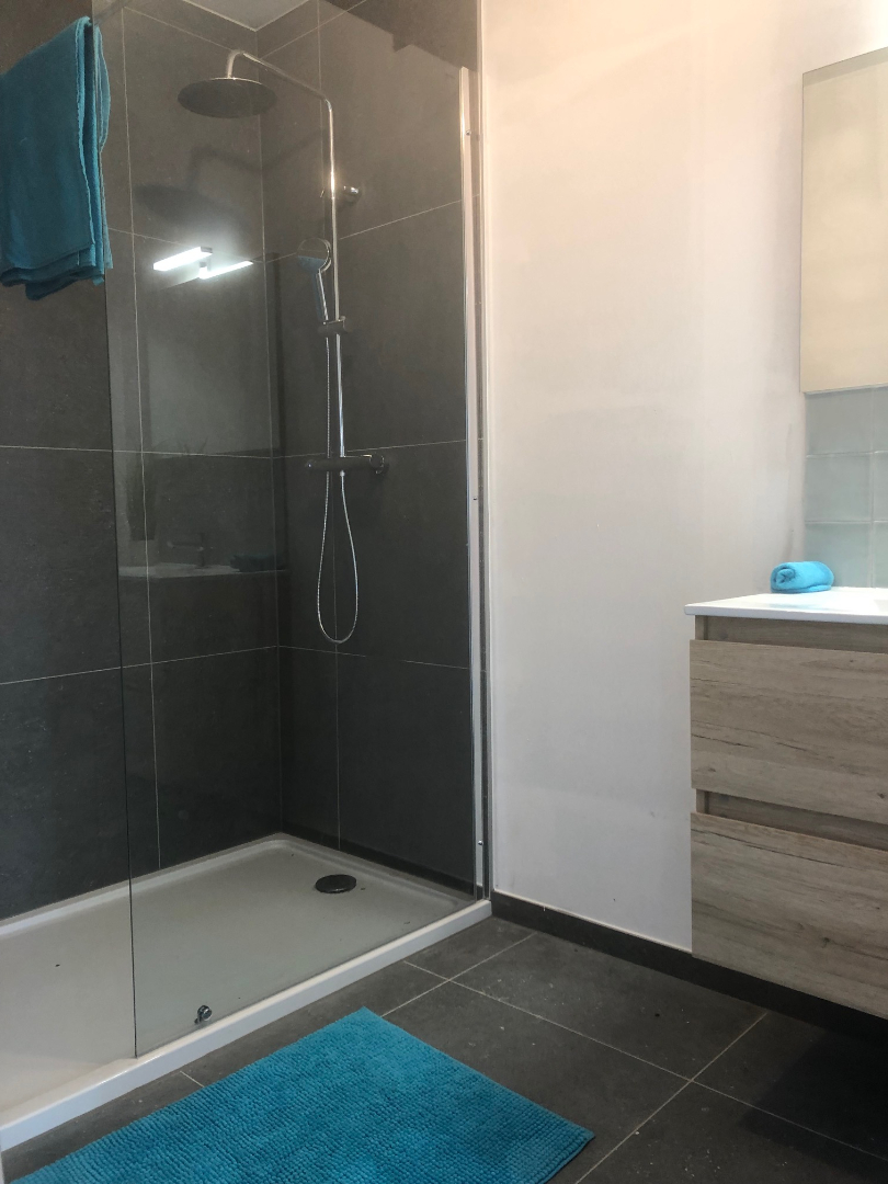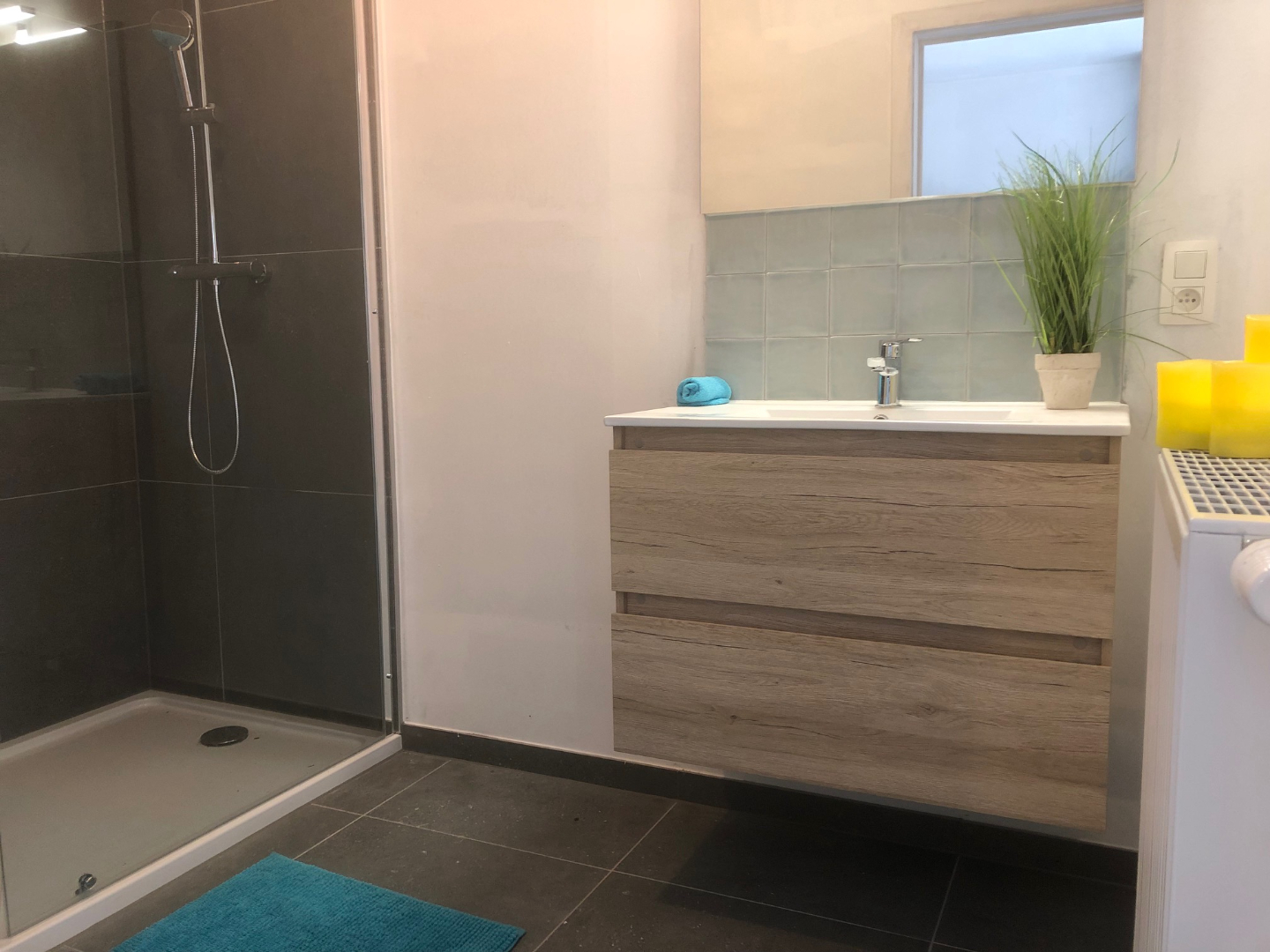 Op het gelijkvloers is eveneens een nieuwe badkamer met badkamermeubel en inloopdouche aanwezig.