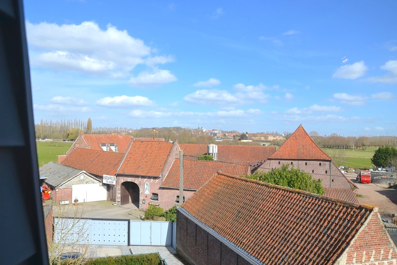 Onder de kerktoren van Rollegem met een verzicht tot in Bellegem...