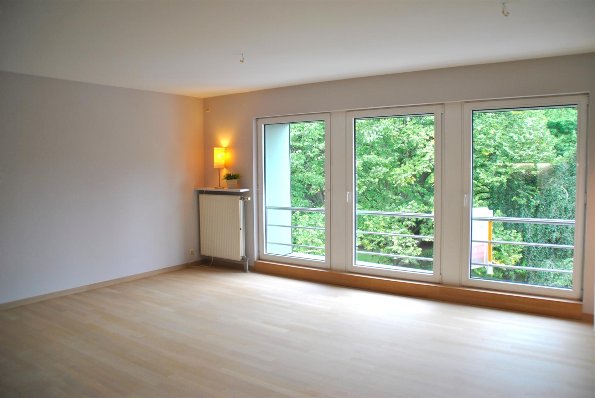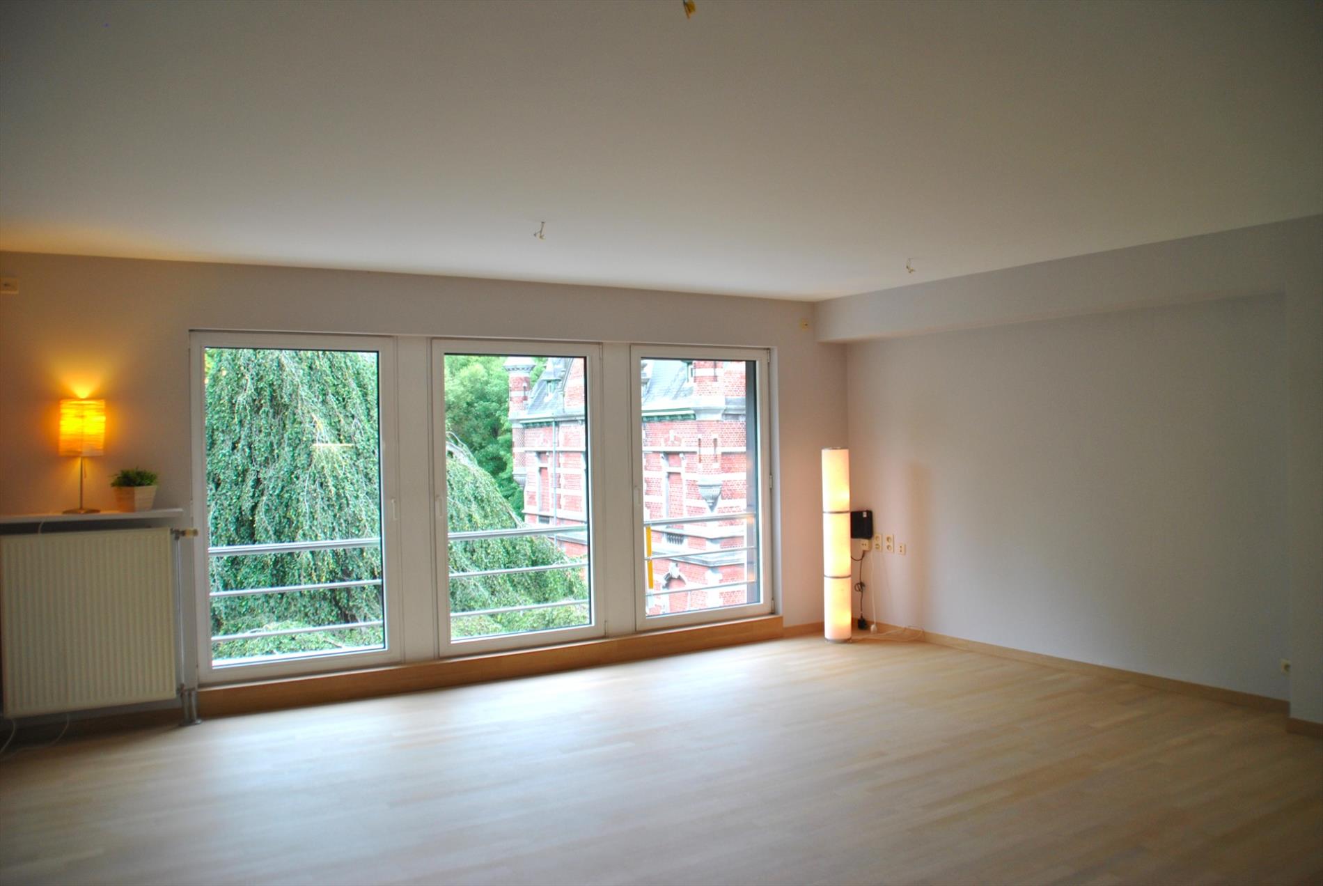 Vanuit de hal stappen we de grote leefruimte binnen. De ramen die de volledige voorgevel beslaan zorgen voor een zee aan licht. Het licht in combinatie met het massief parket en de frisse look van het schilderwerk zorgen ervoor dat het hier een hemeltje is. Het zicht op het park en het mooie gemeentehuis maken het plaatje af. De keuken paalt aan de living en vormt er als het ware één geheel mee.