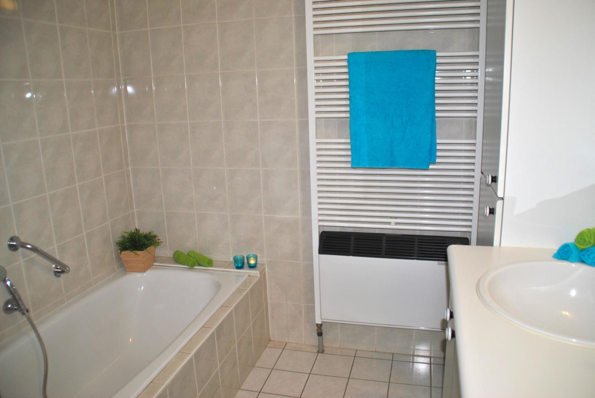 In de hal vinden we ook de toegang tot een apart toilet, een bergruimte, de badkamer en 2 slaapkamers terug. In de badkamer is er een dubbele lavabo, bad én aparte douche. De slaapkamers liggen langs de achterkant en zijn rustig en lichtrijk. Vanuit beide kamers kunnen we op het zuidgerichte terras. Hier is het in het herfstzonnetje heerlijk vertoeven.