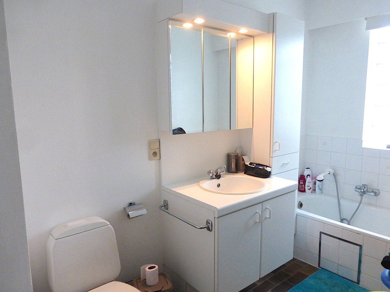 Via de trap gaan we naar de 1e verdieping. We komen het appartement binnen in de living met open keuken. Verder is er 1 slaapkamer en een badkamer met lavabomeubel, toilet en ligbad.