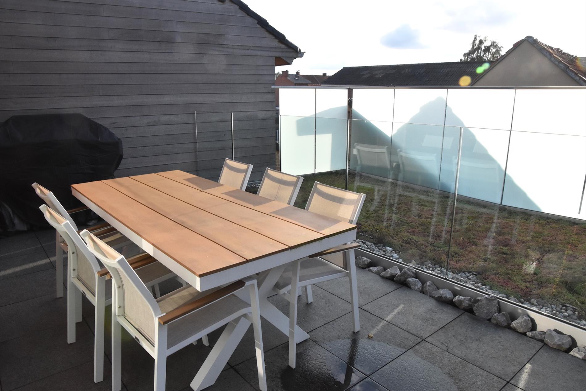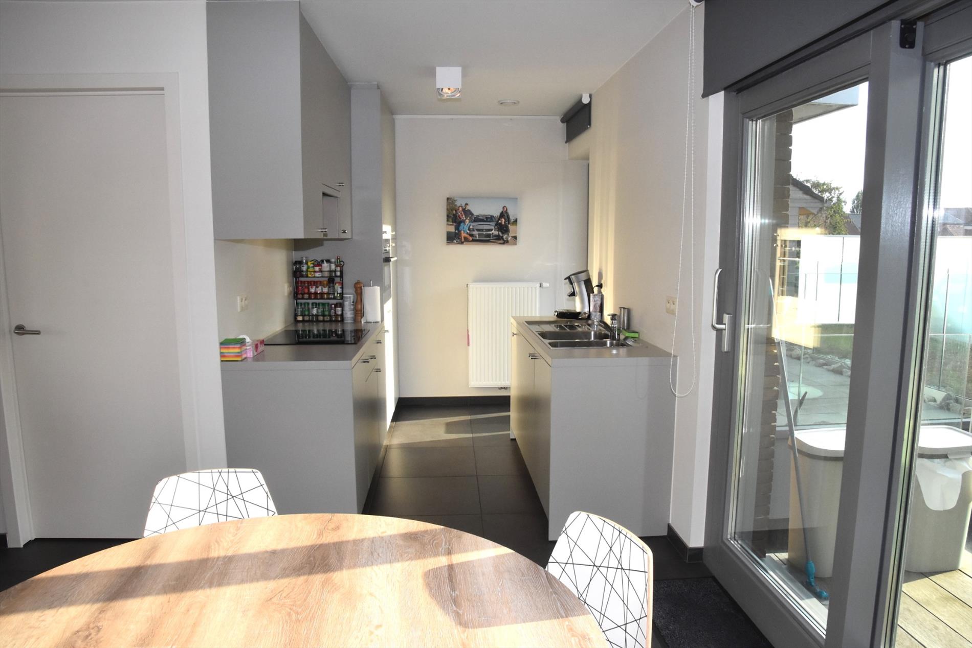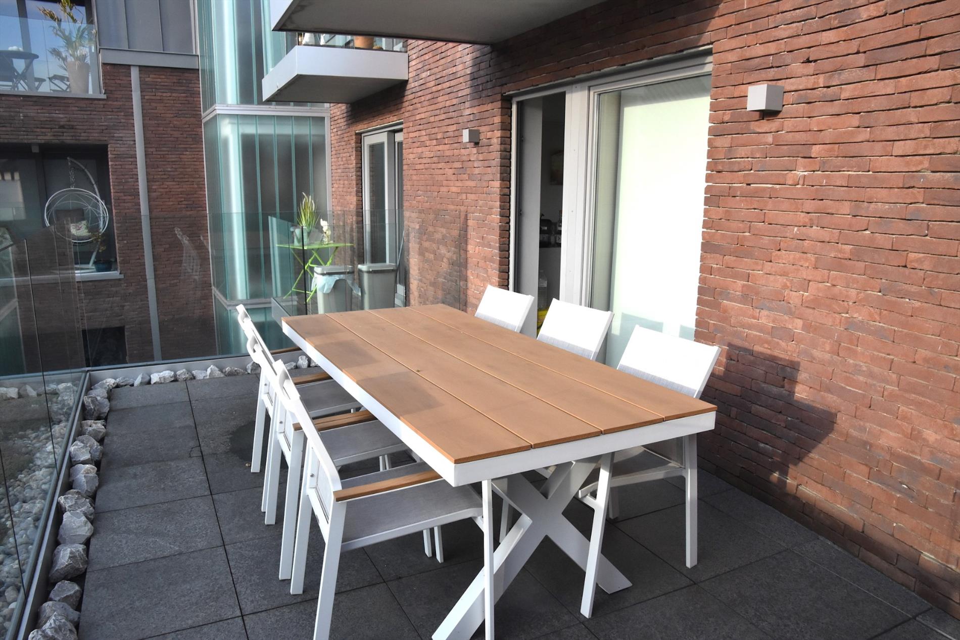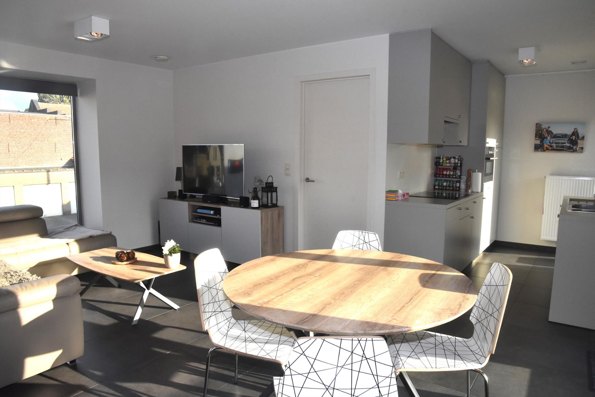 Via de hal komen we met de lift op de 1e verdieping. We betreden het appartement en meteen valt de enorme lichtinval op. De grote ramen zorgen voor een gevoel van openheid. De open keuken is modern en smaakvol ingericht (kookplaat, dampkamp, warmeluchtoven, ijskast en vaatwasmachine). Bij de keuken en de living is er een balkon en heel groot terras. Door de zuidwest-oriëntatie is het er steeds genieten in het zonnetje!