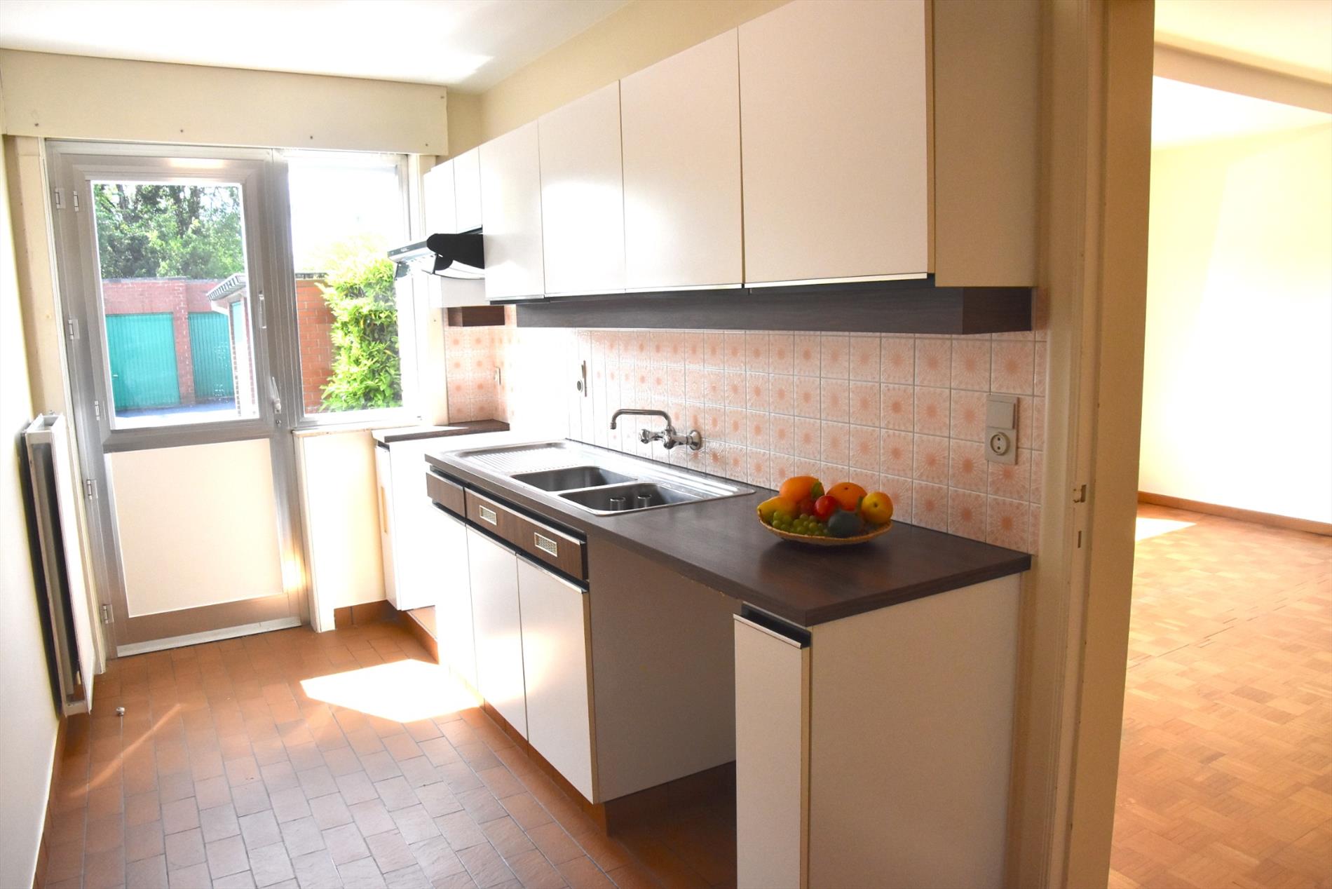 De inkomhal in massief parket straalt direct ruimte uit. Van hieruit kunnen we naar de lichtrijke living, de slaapkamers, het aparte toilet of de badkamer. Ook in de leefruimte vinden we hetzelfde parket terug. Aansluitend is er een ruime keuken. Verpozen kan op het zuidgerichte terras met klein tuintje. Terug in de inkomhal gekomen, stappen we vervolgens één van de ruime kamers binnen. De kleinere kamer heeft ook een lavabo. Er is vervolgens nog een grotere slaapkamer. In de badkamer is er een bad en lavabo.