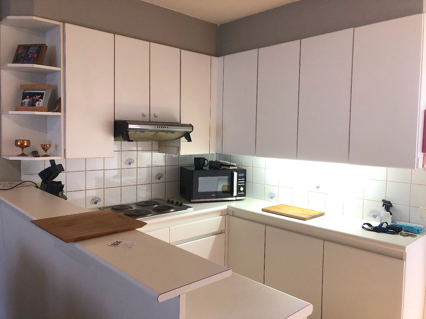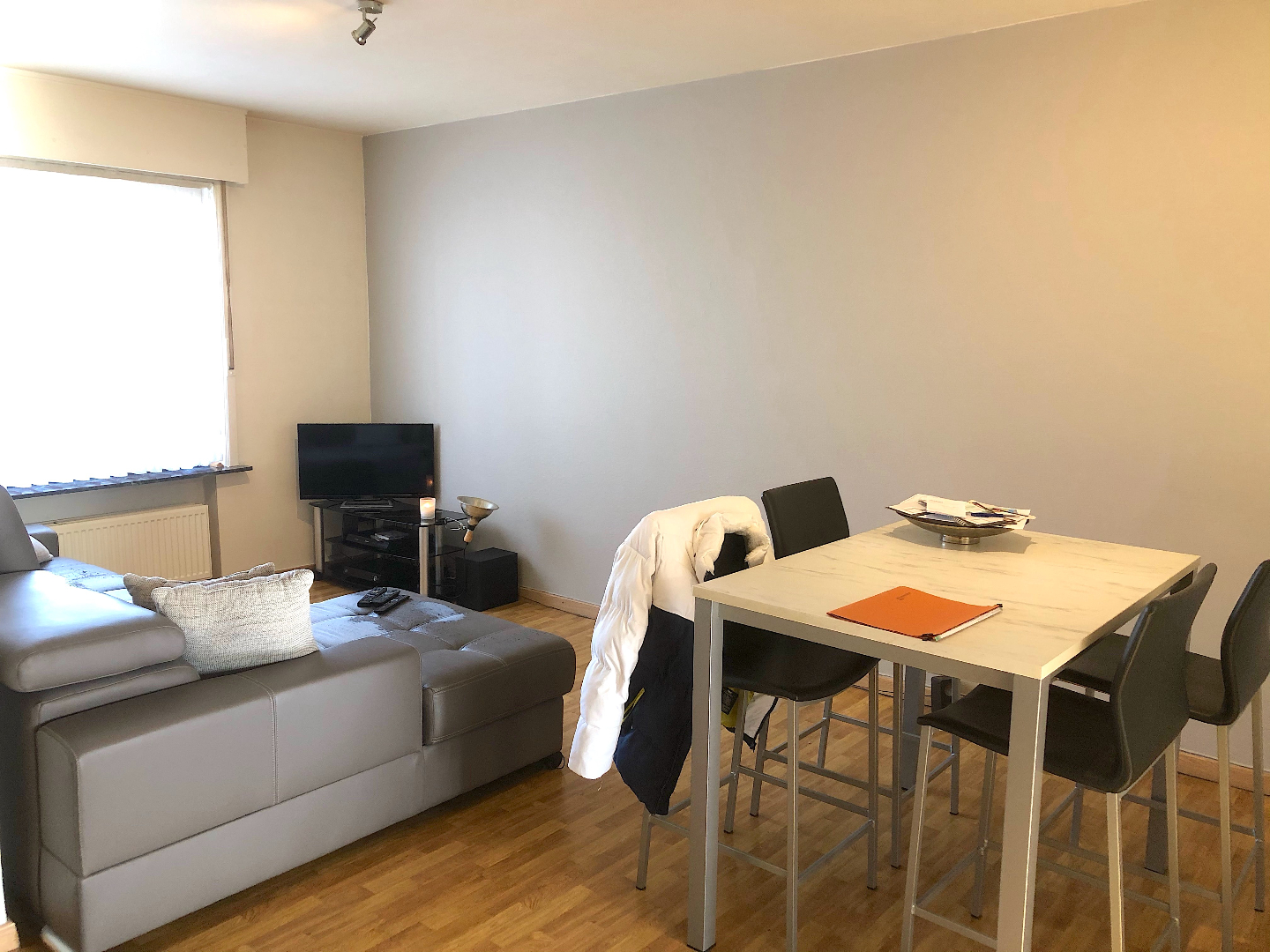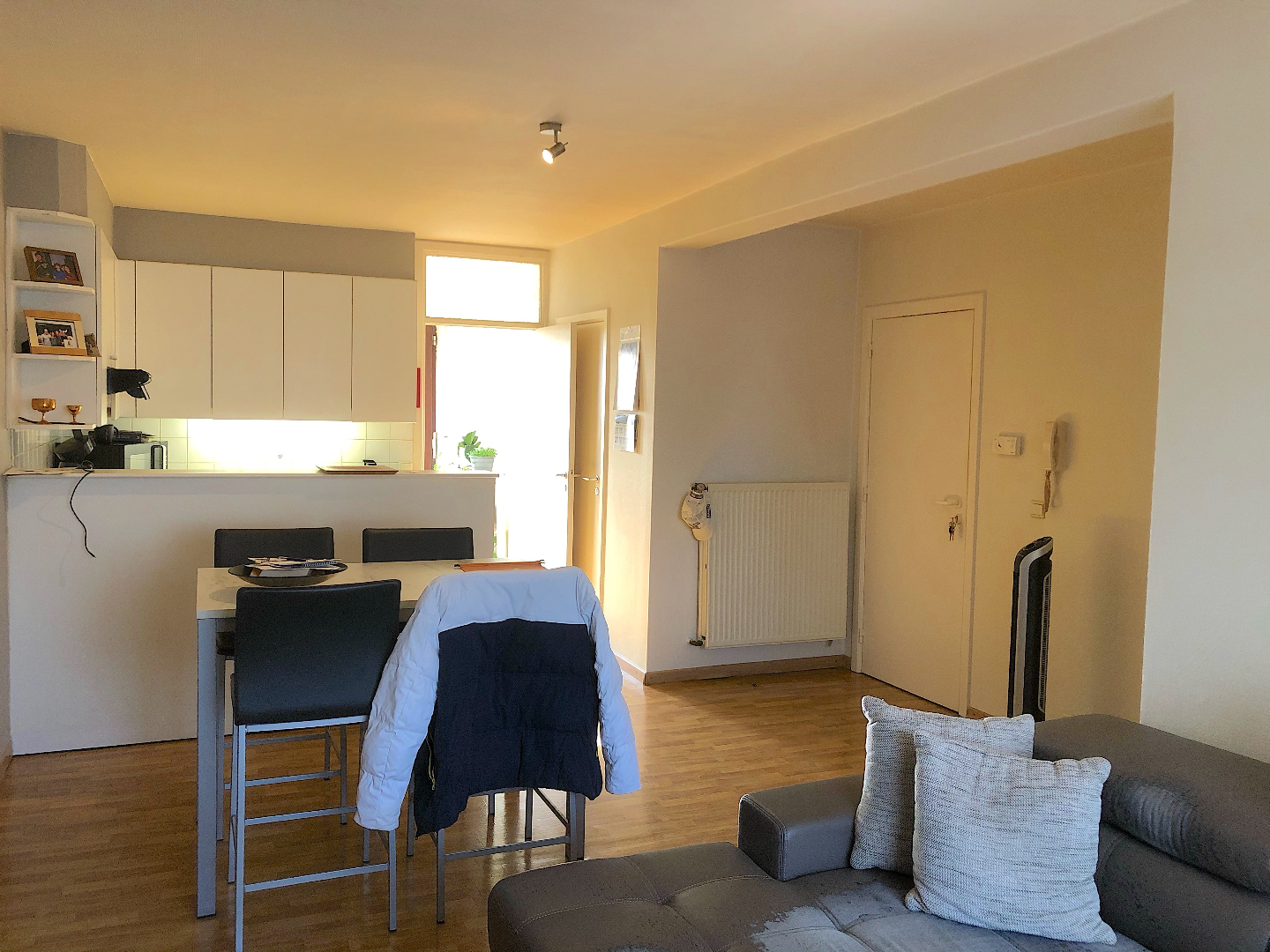 Via de trap gaan we naar de 1e verdieping. We komen het appartement binnen in de living met toffe open keuken. Aansluitend is er een handige berging. Verder is er 1 slaapkamer en een badkamer met lavabomeubel, toilet en ligbad.