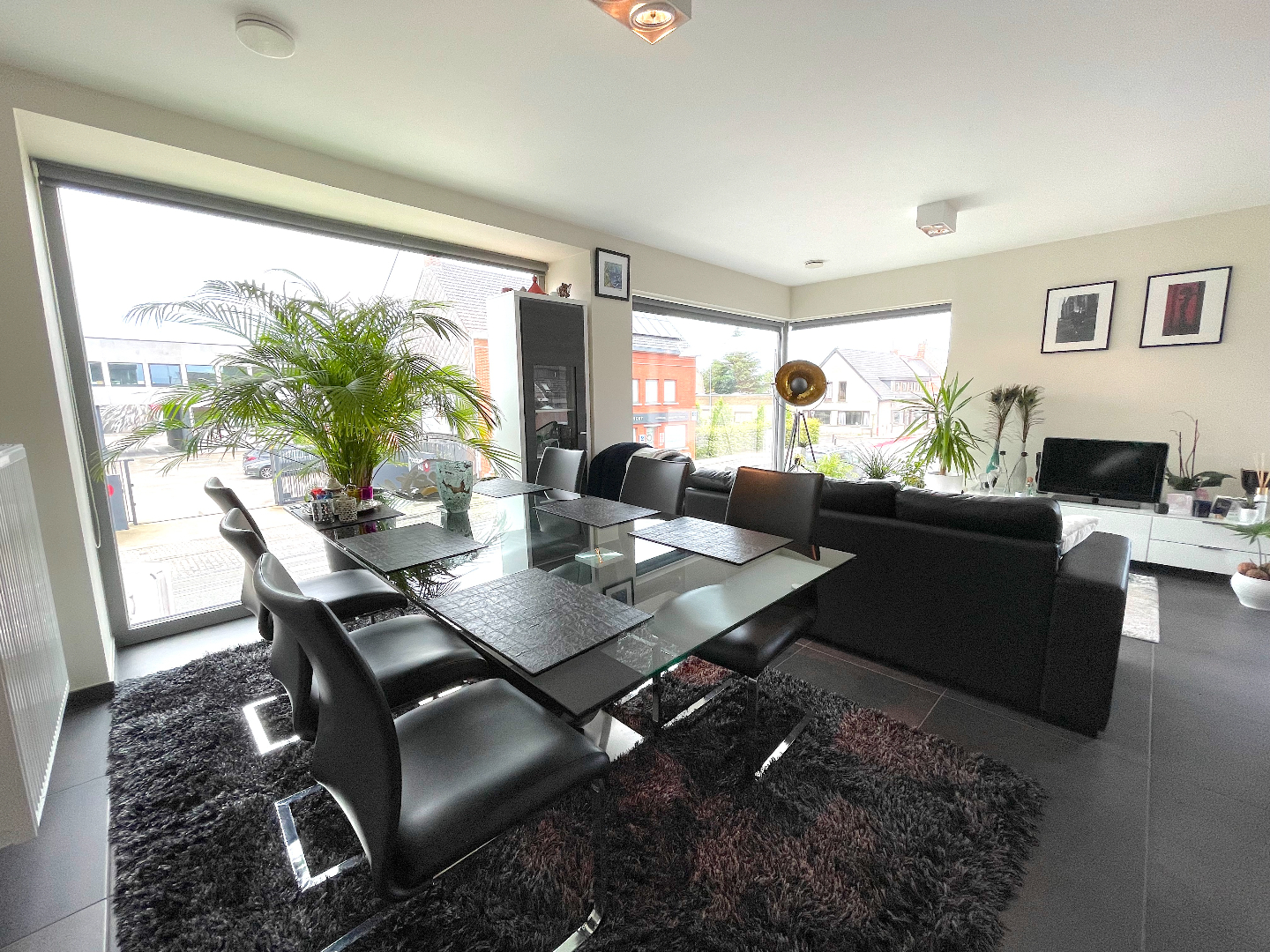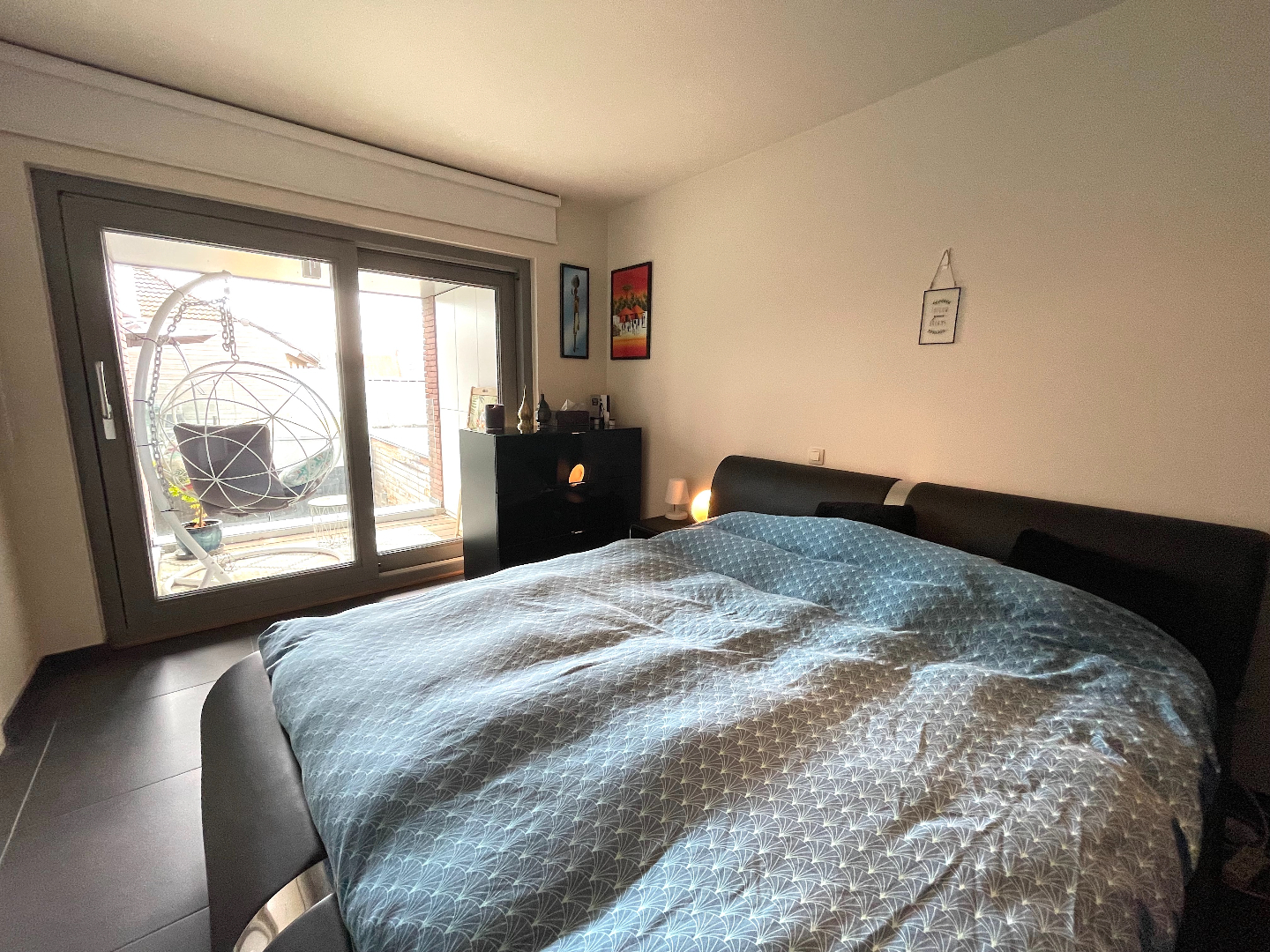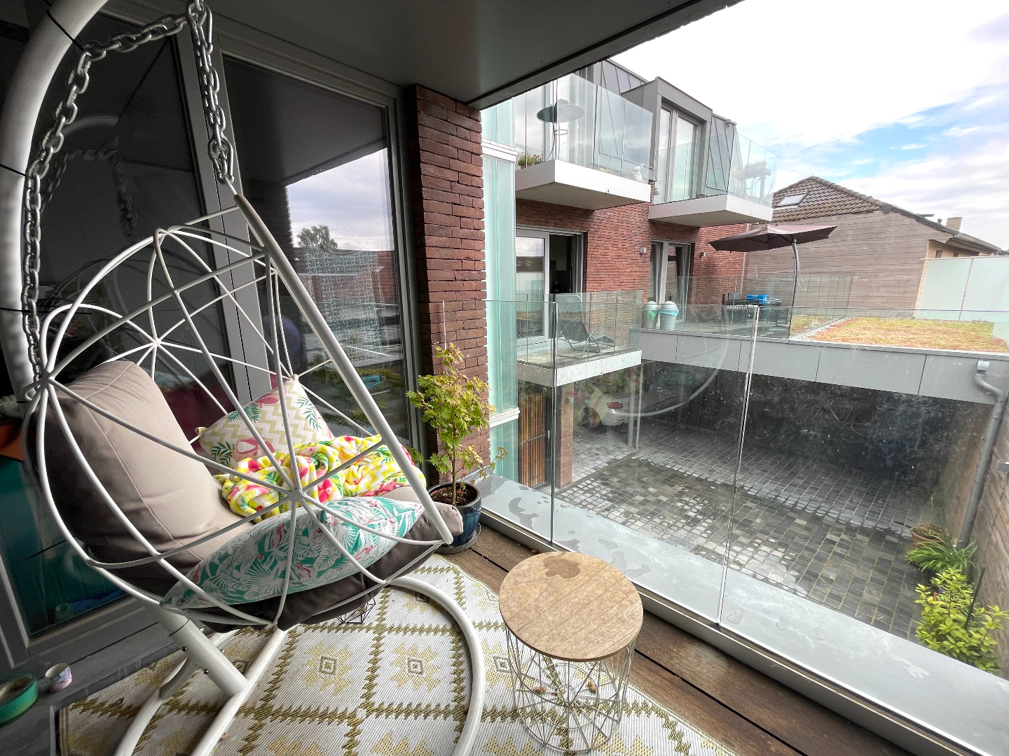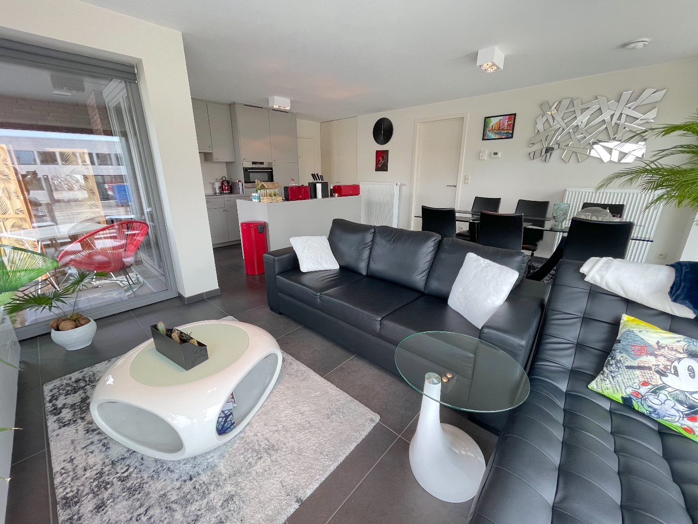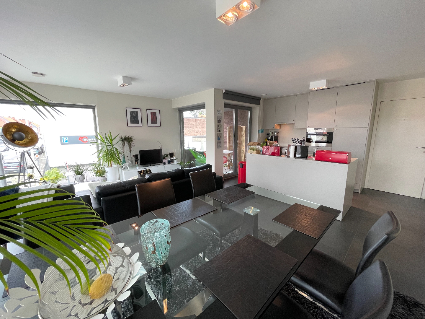 In de leefruimte bieden de ramen over de volledige breedte enorm veel daglicht. De open keuken is modern en smaakvol ingericht (kookplaat, dampkamp, combi-oven, ijskast en vaatwasmachine). Vanuit de leefruimte kunnen we het terras aan de straatkant bereiken. Dit terras is heel stijlvol met glazen balustrade. Het is hier heel aangenaam verpozen. Verder komen we vanuit de nachthal in de badkamer met douche en wastafel. Er is ook toegang tot een apart toilet en 2 slaapkamers. Vanuit de achterste slaapkamer kunnen we ook hier terug een terras met ingemaakte kasten betreden. De rolgordijnen en de mooie lichtarmaturen doorheen het appartement zorgen voor de 'finishing touch'.