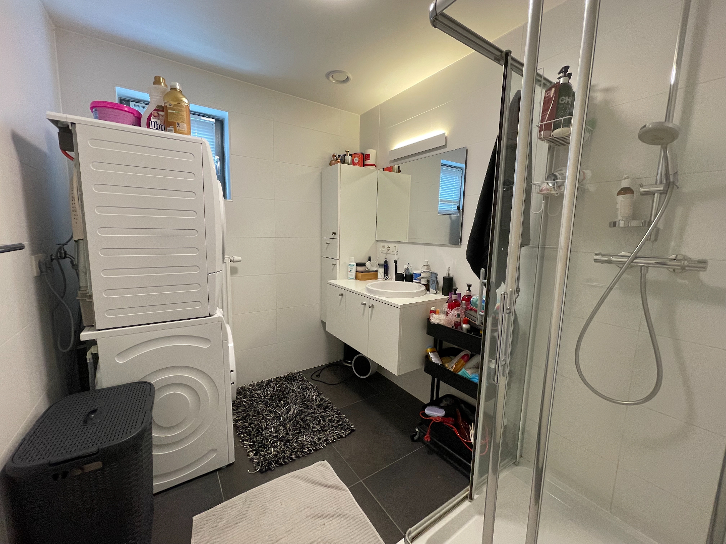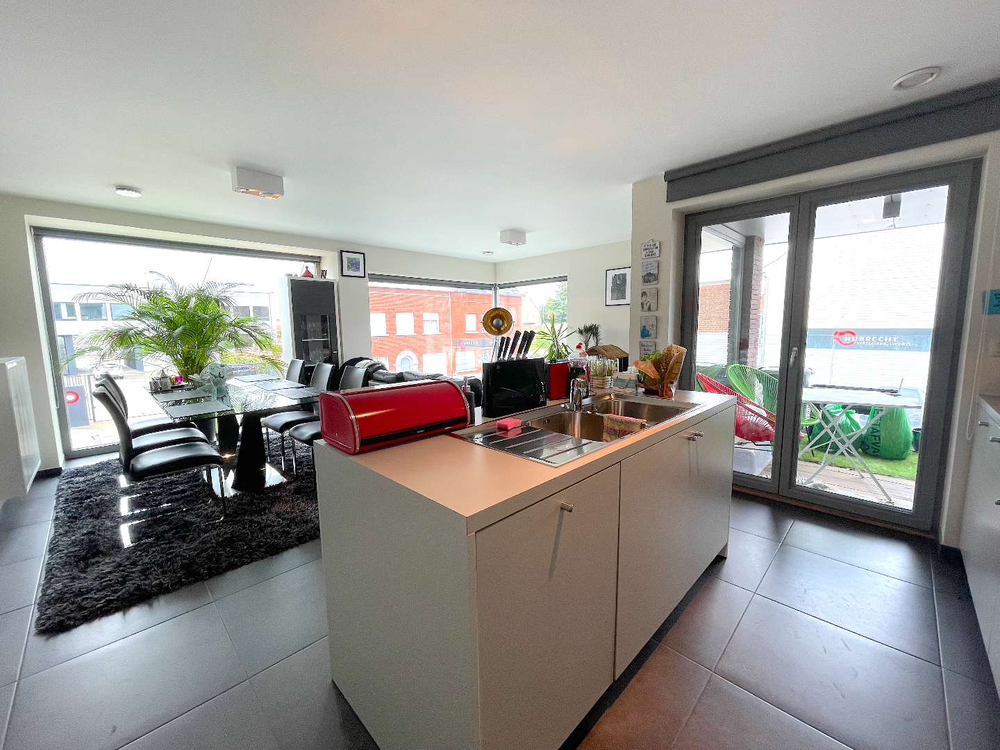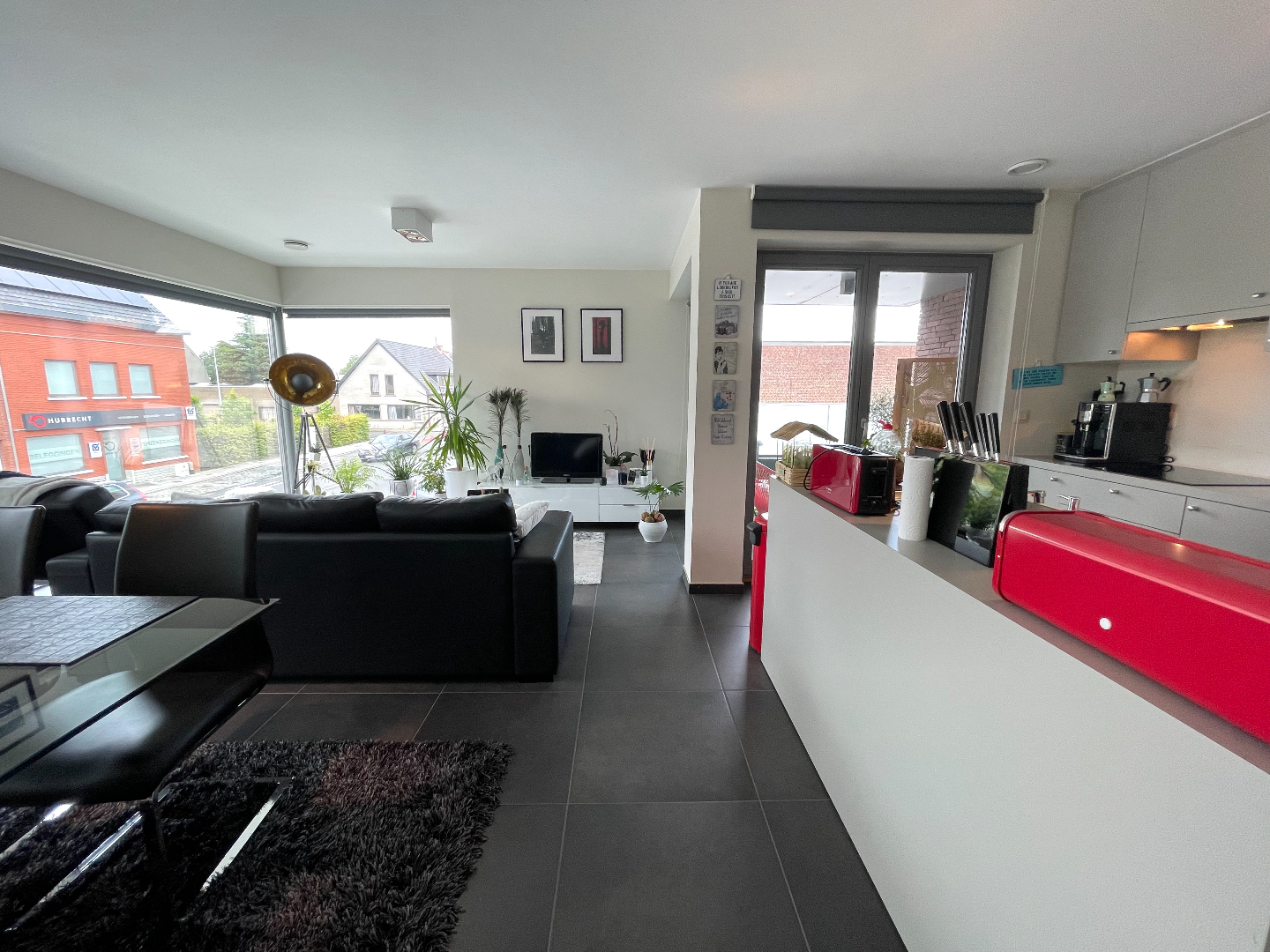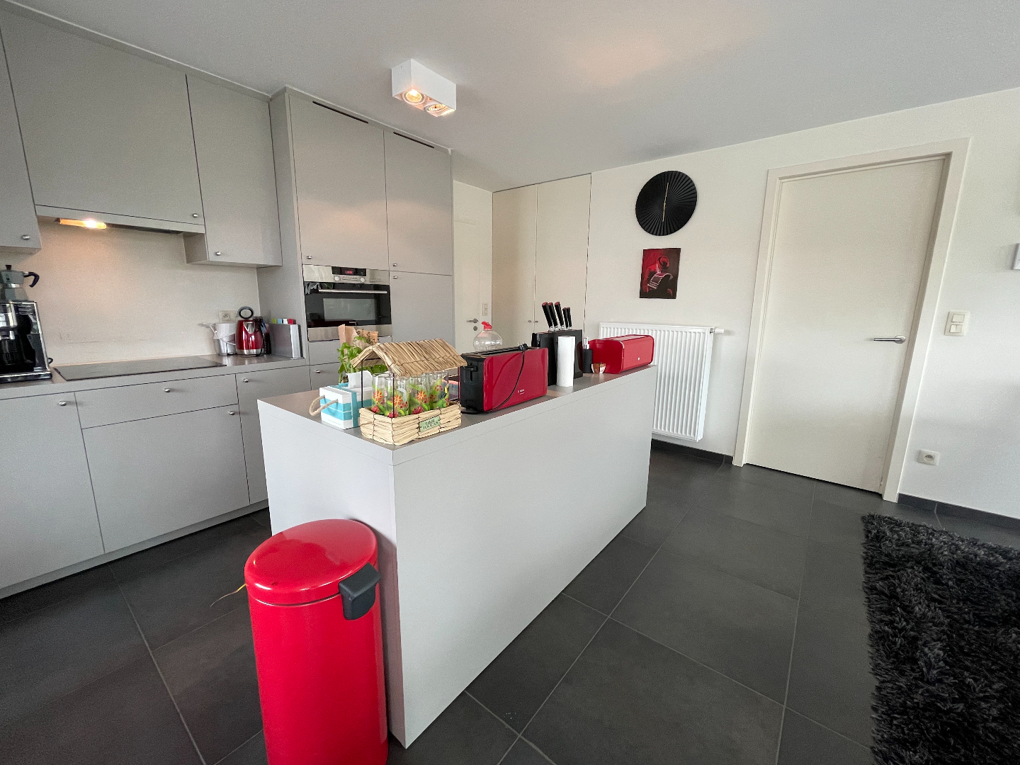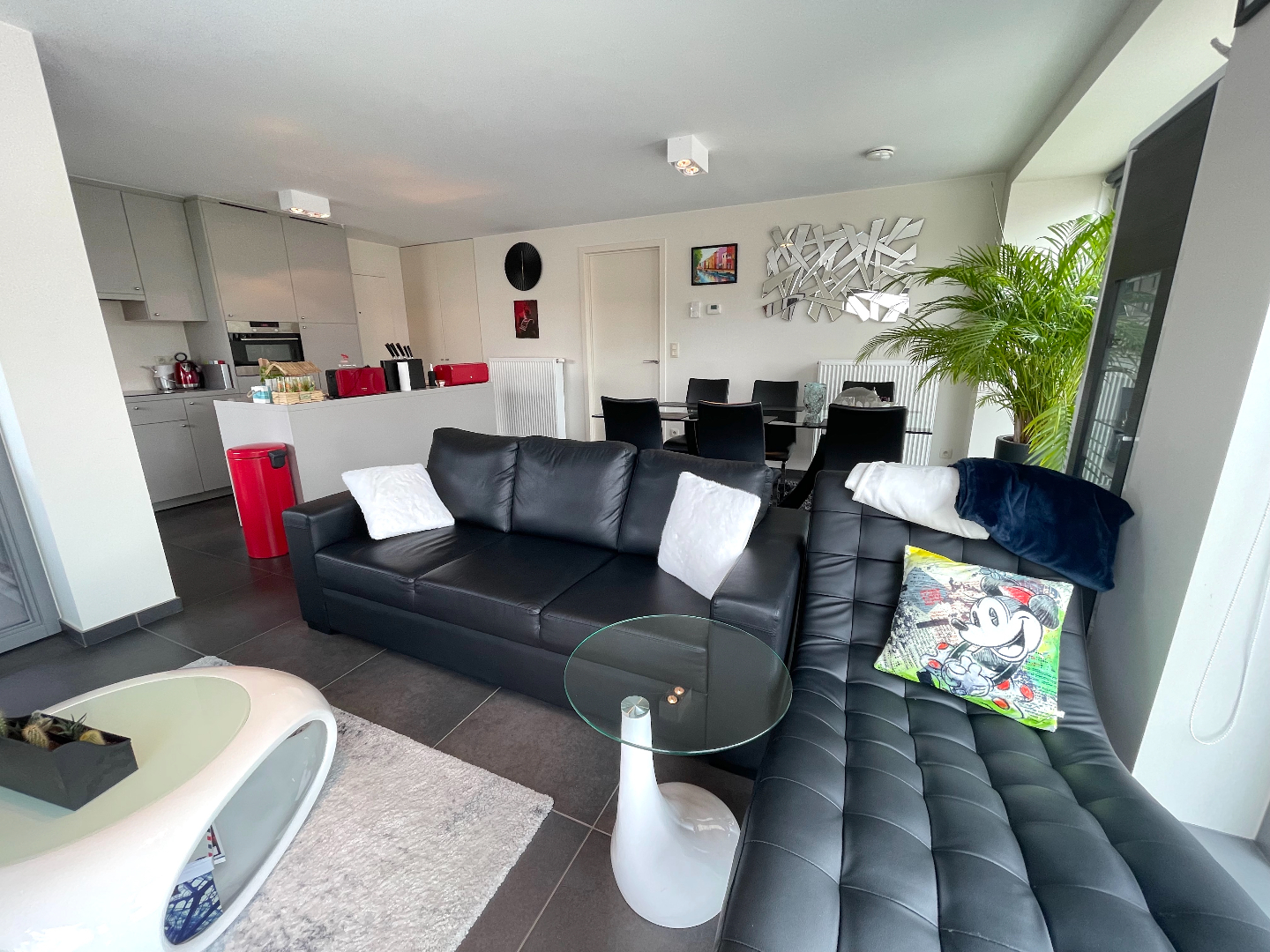 In de leefruimte bieden de ramen over de volledige breedte enorm veel daglicht. De open keuken is modern en smaakvol ingericht (kookplaat, dampkamp, combi-oven, ijskast en vaatwasmachine). Vanuit de leefruimte kunnen we het terras aan de straatkant bereiken. Dit terras is heel stijlvol met glazen balustrade. Het is hier heel aangenaam verpozen. Verder komen we vanuit de nachthal in de badkamer met douche en wastafel. Er is ook toegang tot een apart toilet en 2 slaapkamers. Vanuit de achterste slaapkamer kunnen we ook hier terug een terras met ingemaakte kasten betreden. De rolgordijnen en de mooie lichtarmaturen doorheen het appartement zorgen voor de 'finishing touch'.