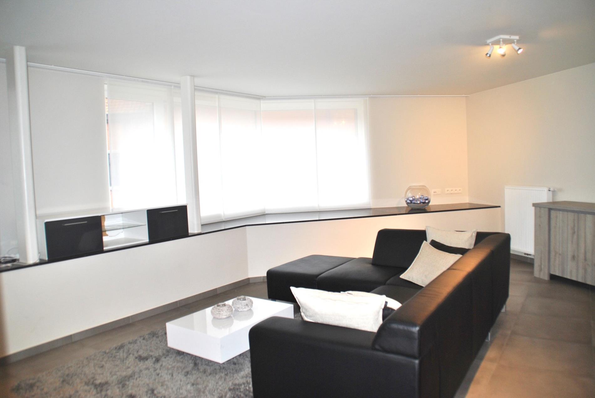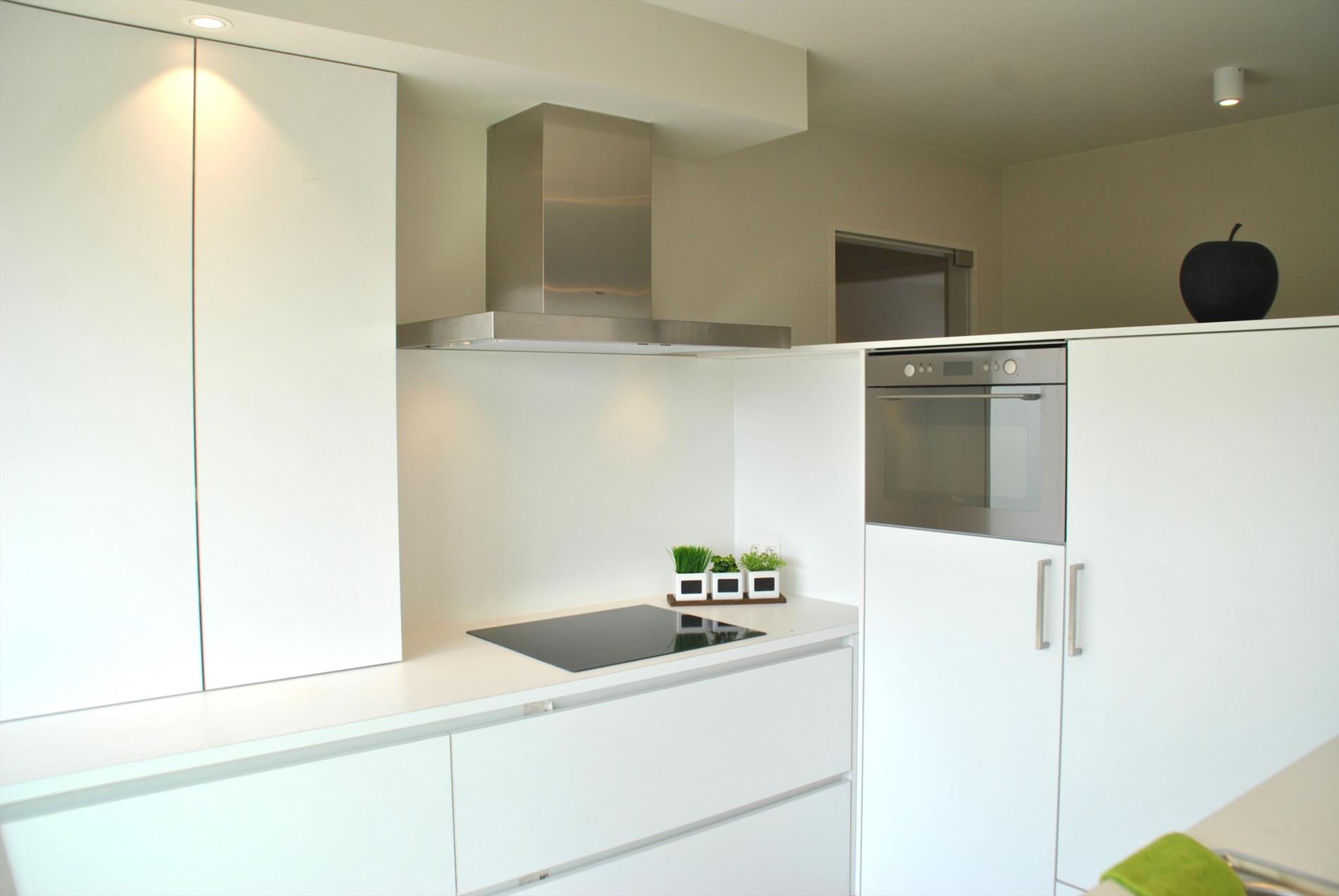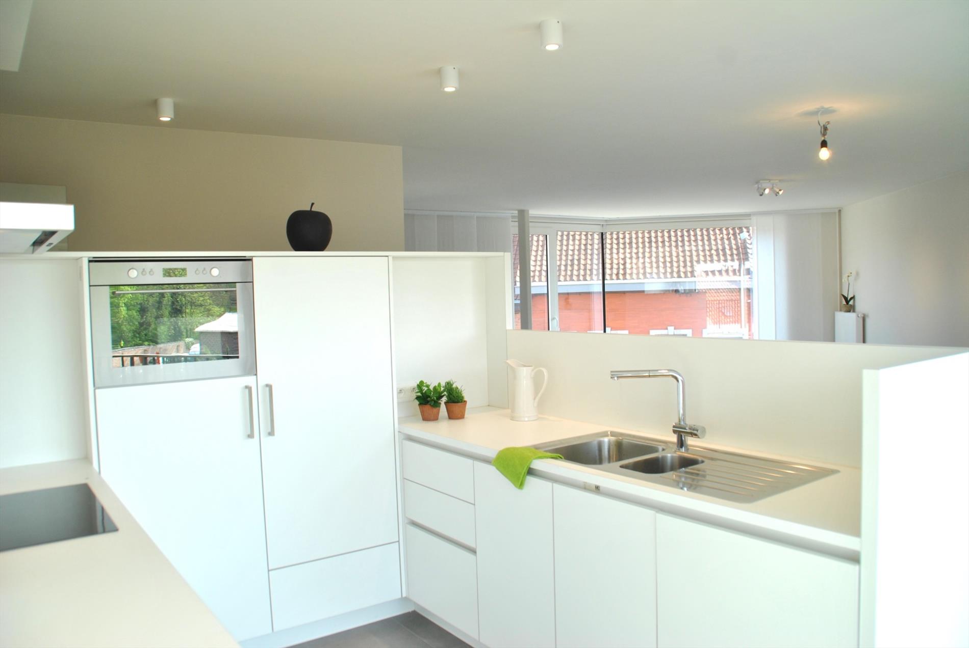 Pal in het centrum vinden we op de 1e verdieping van dit mooie pand een al even knap appartement. De lift brengt ons boven. In de inkomhal valt meteen de hoogwaardige afwerking op. In de ruime leefruimte krijgen we door de vele glaspartijen heel veel lichtinval en een panoramisch zicht. Hier is een zee aan ruimte. De volledig ingerichte keuken is puur maatwerk en biedt heel veel bergruimte. Aansluitend is er een handige berg-/wasruimte met wederom inbouwkasten. Vanuit de leefruimte en de berging is er toegang tot het grote en zonrijke terras.