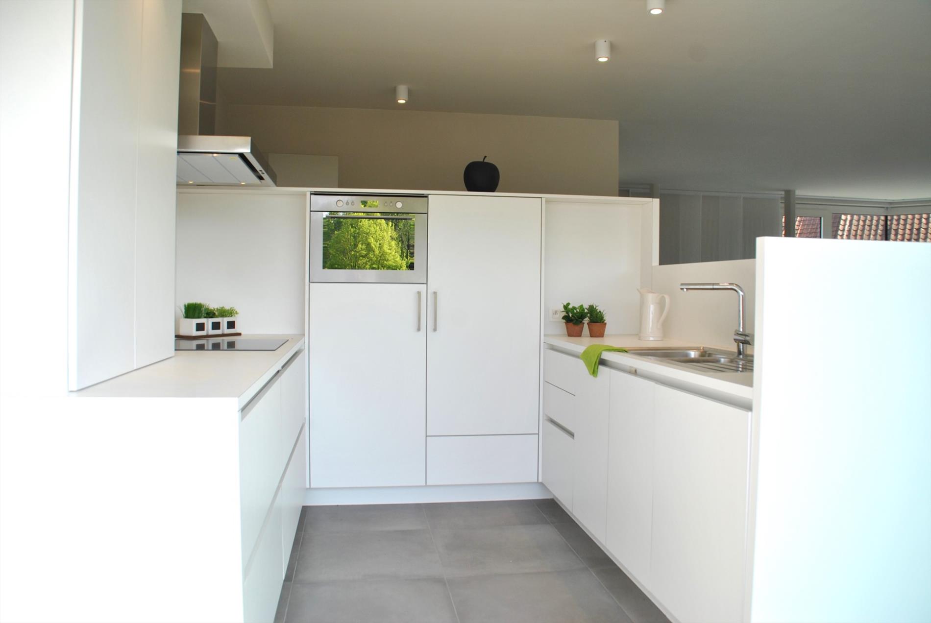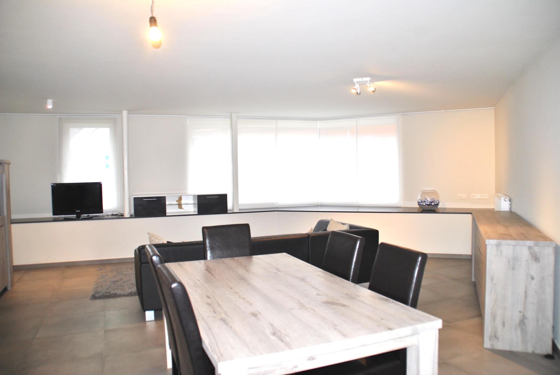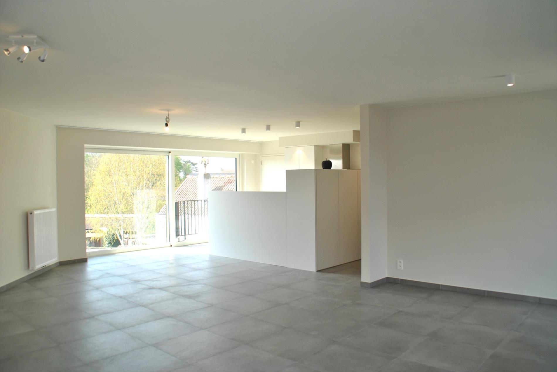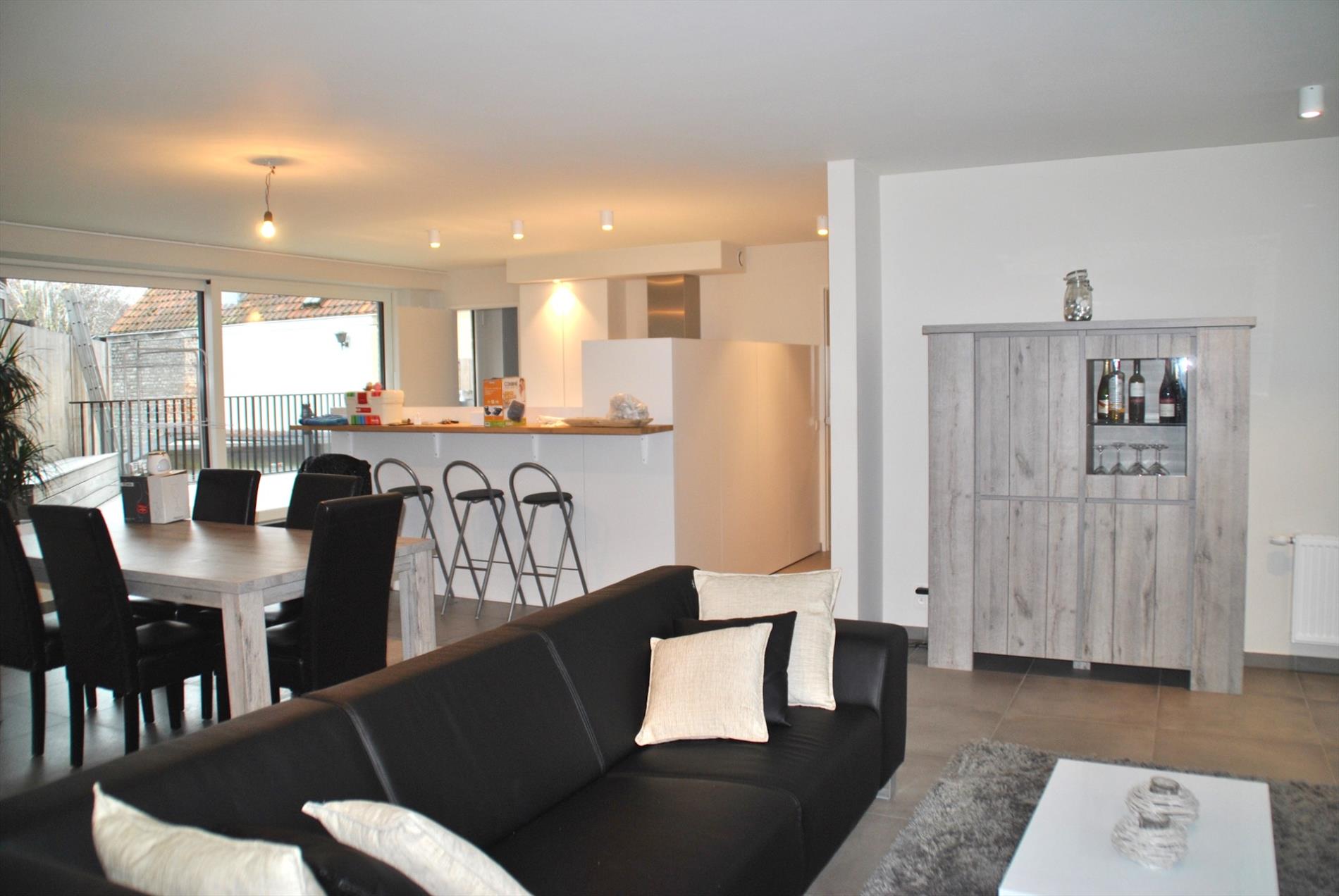 Pal in het centrum vinden we op de 1e verdieping van dit mooie pand een al even knap appartement. De lift brengt ons boven. In de inkomhal valt meteen de hoogwaardige afwerking op. In de ruime leefruimte krijgen we door de vele glaspartijen heel veel lichtinval en een panoramisch zicht. Hier is een zee aan ruimte. De volledig ingerichte keuken is puur maatwerk en biedt heel veel bergruimte. Aansluitend is er een handige berg-/wasruimte met wederom inbouwkasten. Vanuit de leefruimte en de berging is er toegang tot het grote en zonrijke terras.