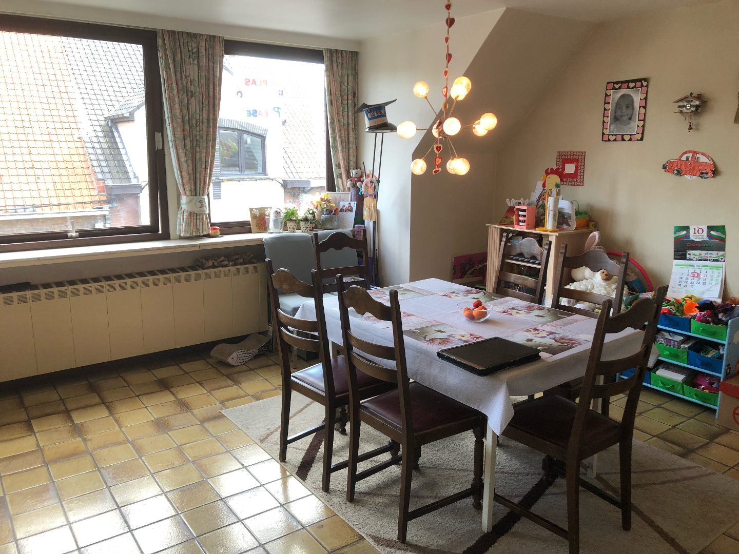 Via de trap gaan we naar het appartement en komen binnen in de hal. We gaan verder naar de ruime, lichtrijke living met aangrenzend de keuken. Deze is voorzien van alle toestellen en zeer gerieflijk ingericht.