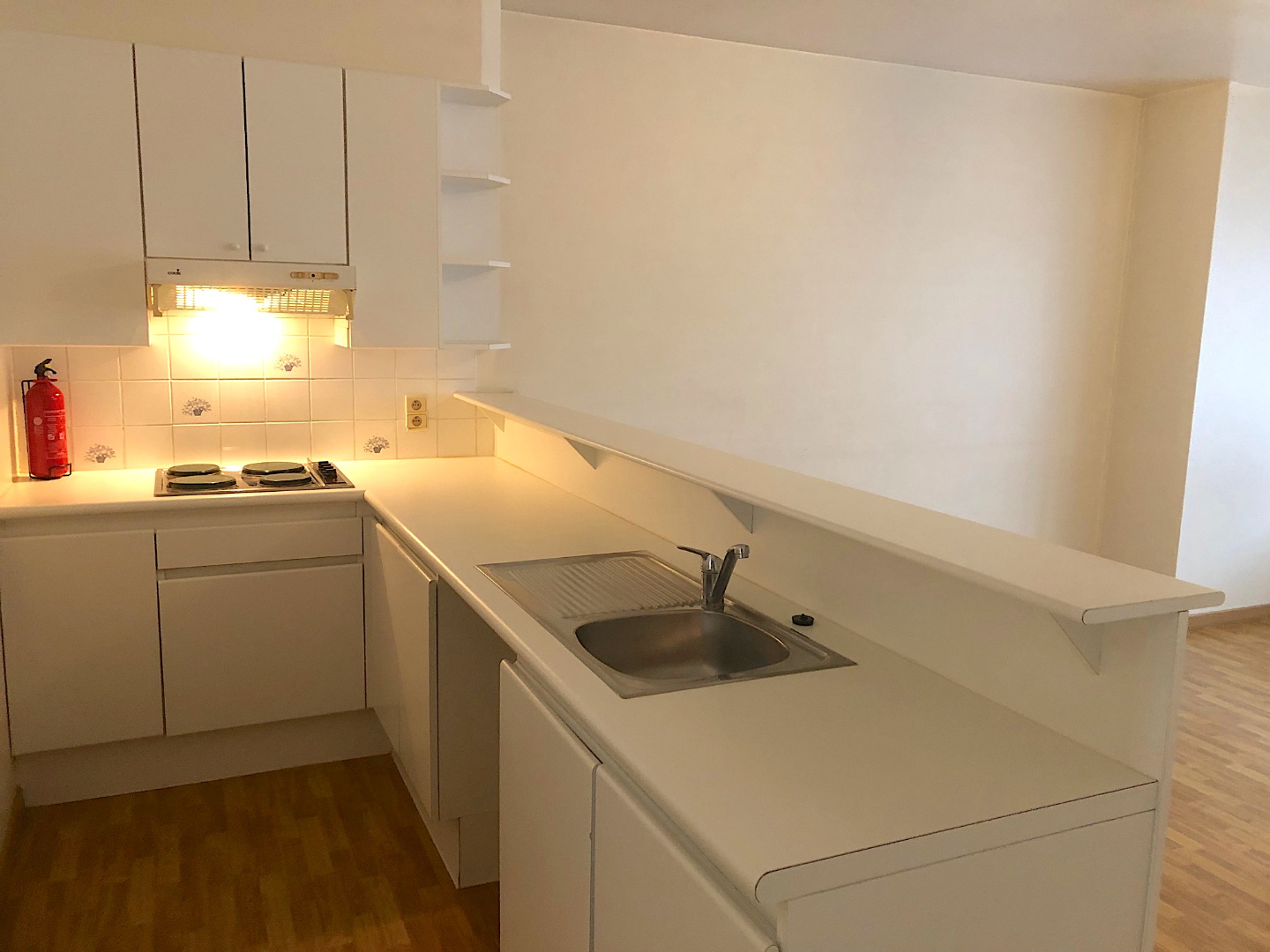Via de trap gaan we naar de 2e verdieping. We komen het appartement binnen in de living met open keuken. Verder is er 1 slaapkamer en een badkamer met lavabomeubel, toilet en ligbad.