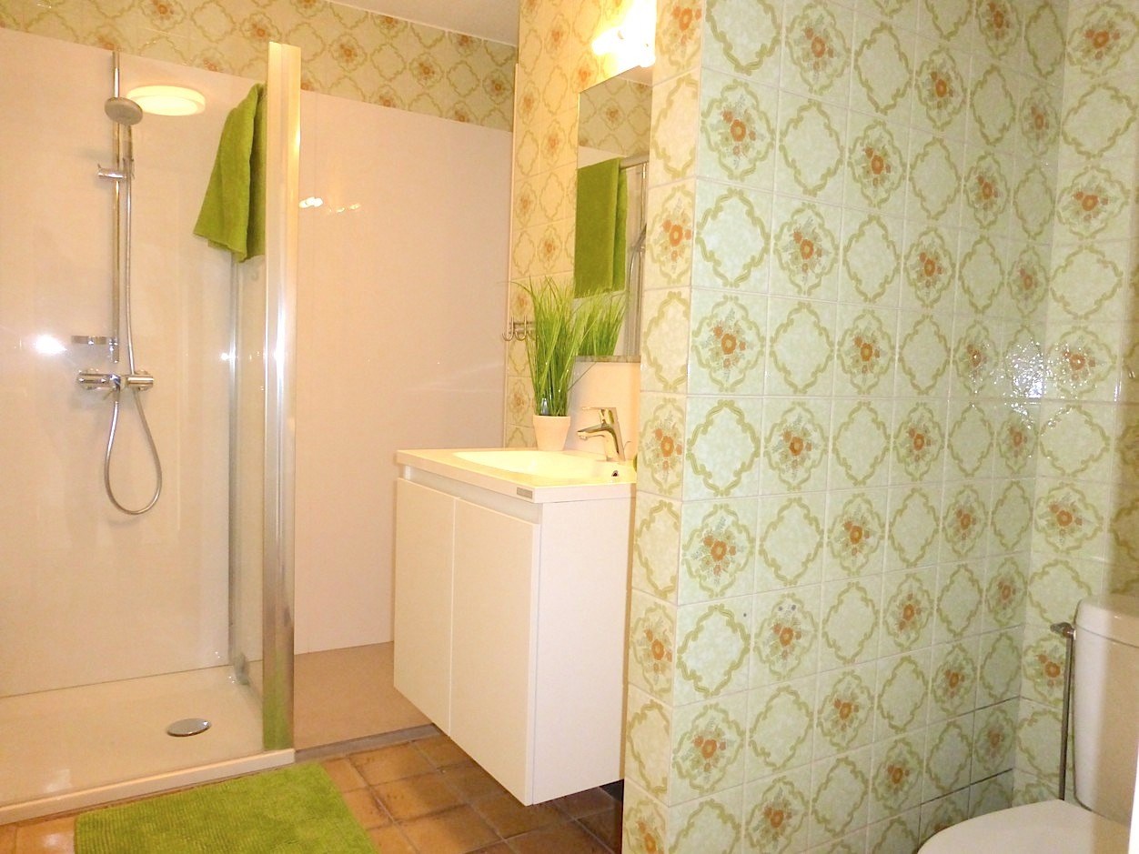 Achteraan vinden we de grote slaapkamer en het terras met een handige buitenberging. Verder is er de vernieuwde badkamer, die voorzien is van een lavabomeubel, douche, toilet en een aansluiting voor wasmachine.
