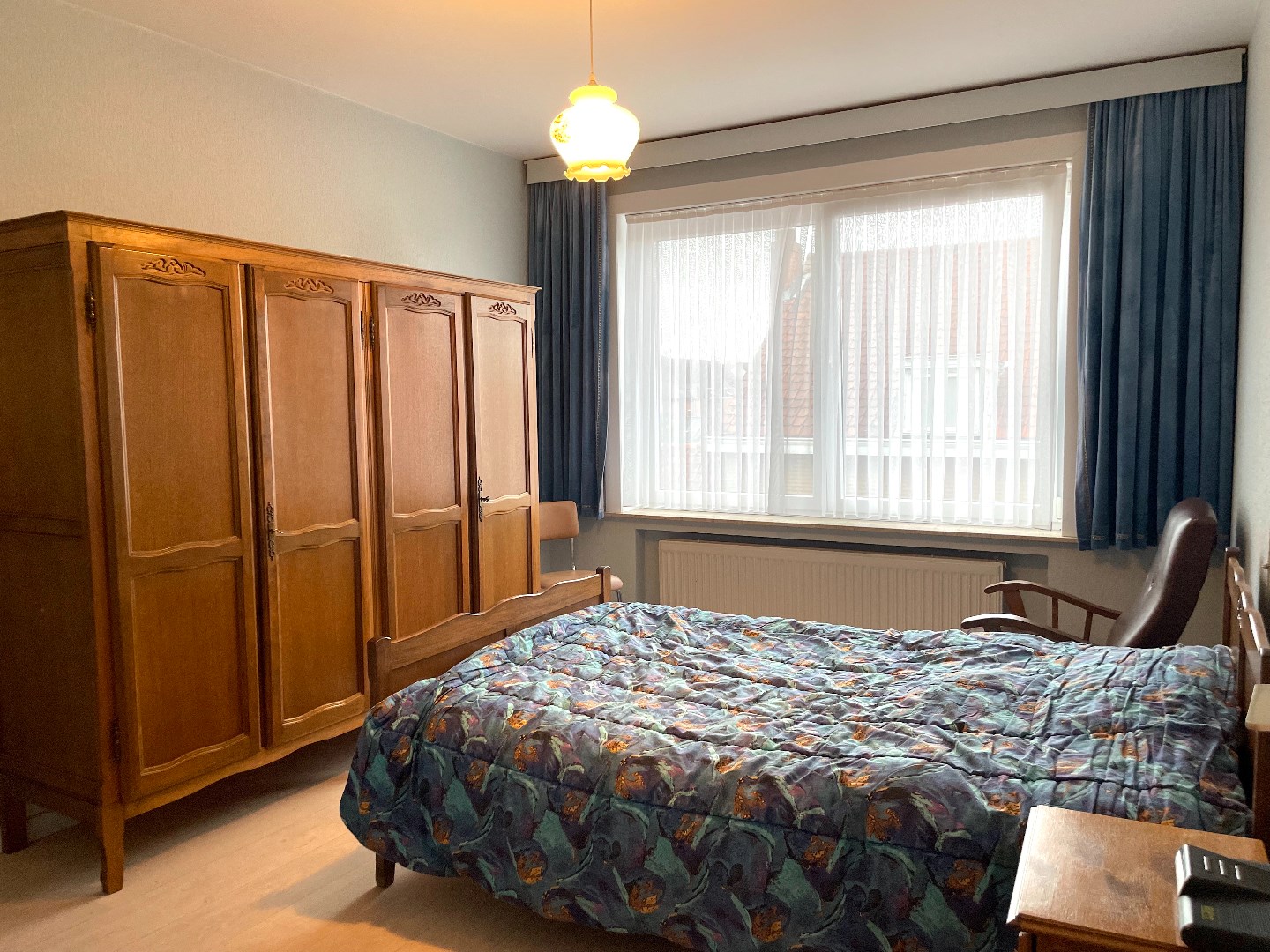 De inkomhal in massief parket straalt direct ruimte uit. Vanuit hieruit kunnen we naar de grote en lichtrijke living, de slaapkamers, het aparte toilet of de badkamer. Ook in de leefruimte vinden we hetzelfde parket terug. Aansluitend is er een ruime keuken. Verpozen kan op het zuidgerichte terras. Er is hier een mooi vergezicht. Op het terras is er nog een berging. Terug in de inkomhal gekomen, stappen we de kamers binnen. De ene slaapkamer is heel groot en heeft nog een aparte ruimte die als dressing kan worden gebruikt én een klein terras. In de badkamer is er een bad, lavabo en bidet.