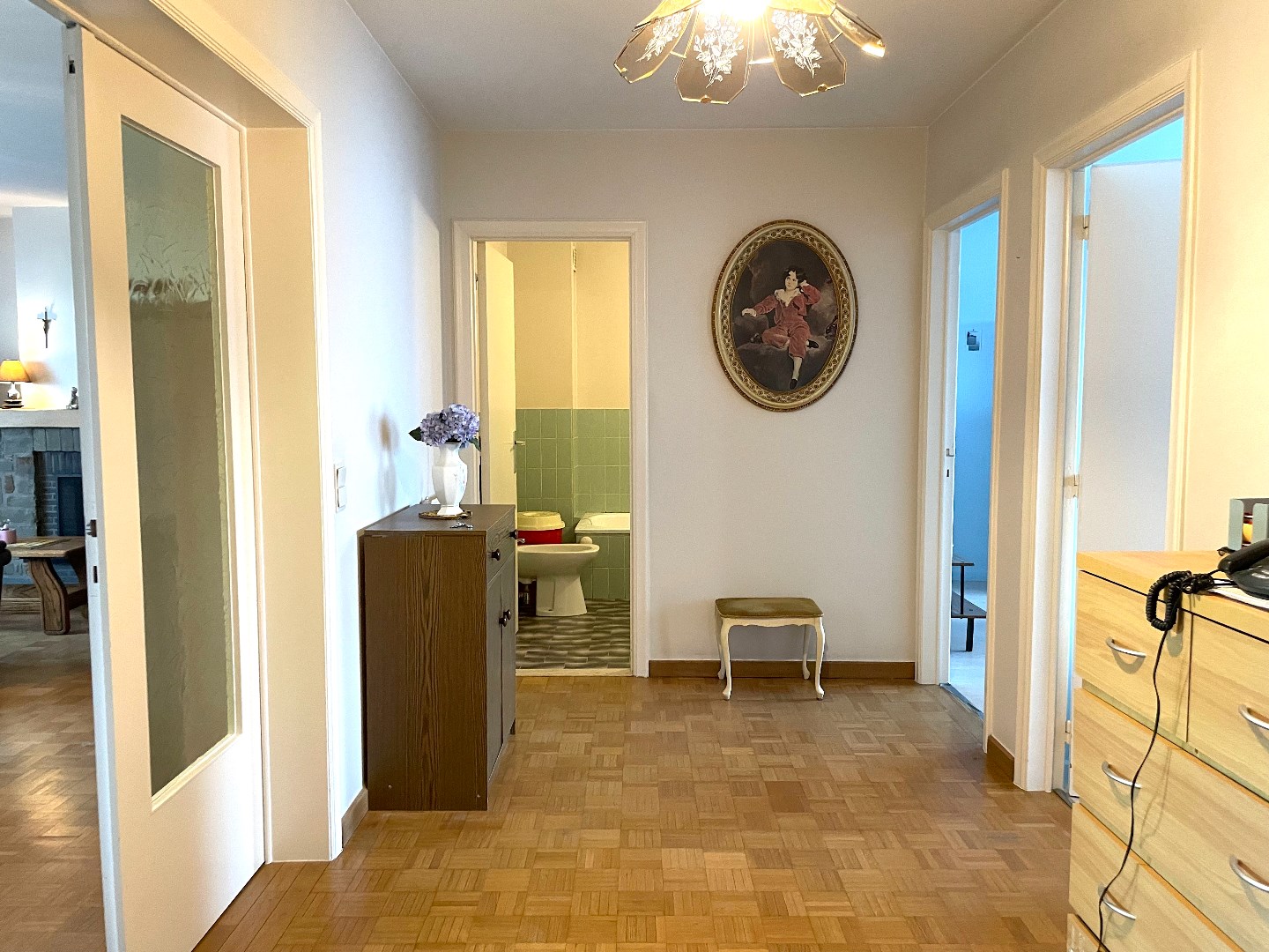 Dit appartement vinden we terug in een klein en rustig appartementsblok. Direct valt op dat dit eigendom met de grootste zorg onderhouden wordt. Via de lift bereiken we de 2e verdieping.