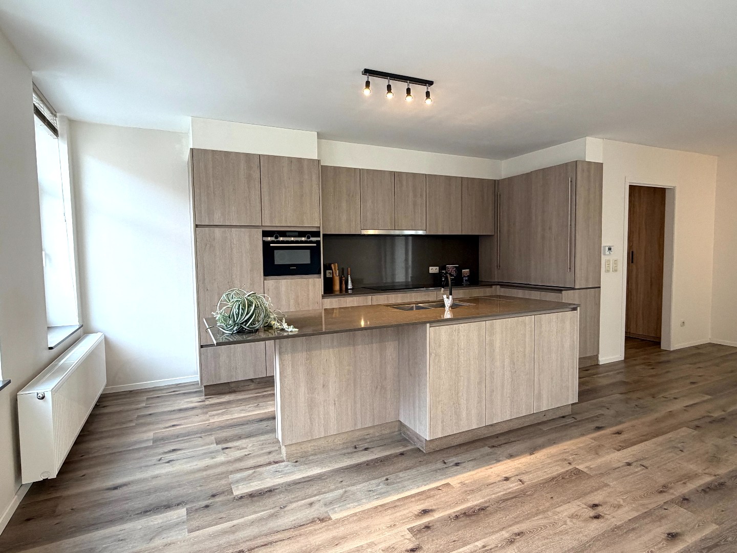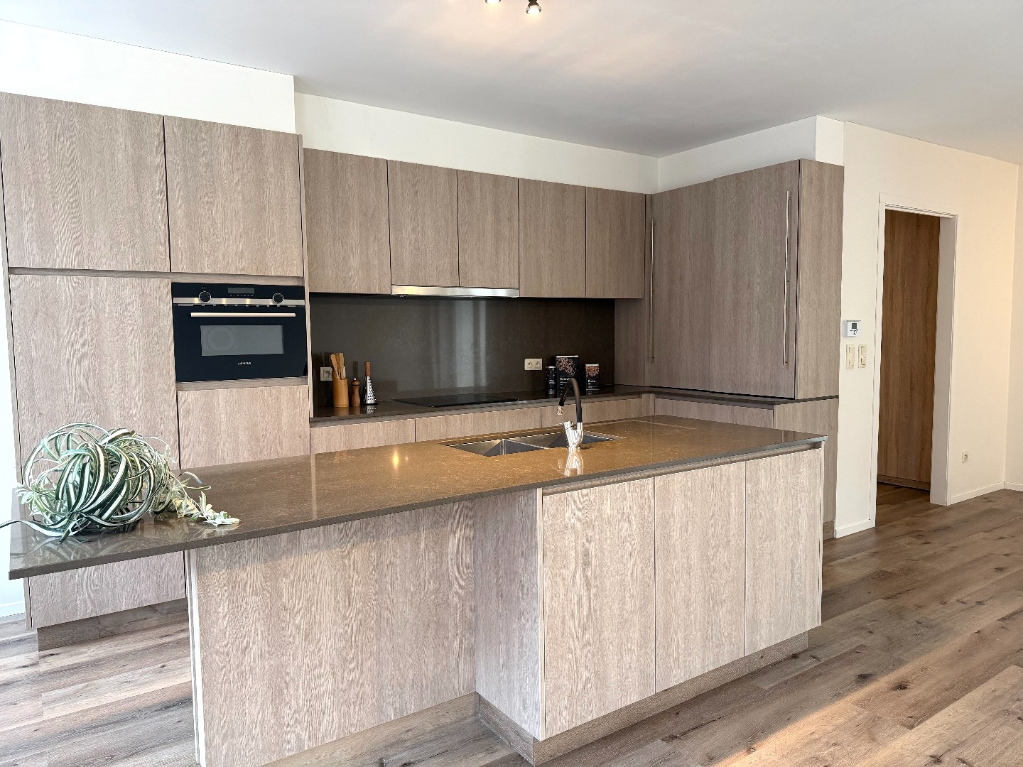De leefruimte met open keuken is heel groot en uiterst lichtrijk. De vele raampartijen zorgen ervoor dat het hier de hele dag heerlijk vertoeven is. We hebben hier ook een goed zicht op het gebeuren in de straat. De mooie open keuken beschikt over een groot eiland en alle nodige toestellen: vaatwasmachine, combi-oven, koelkast, inductiekookplaat en dampkap. Er zijn hier ook veel opbergkasten. Het terras bevindt zich aan de achterzijde van het appartement. Het is hier zalig zitten in de namiddag- en avondzon.