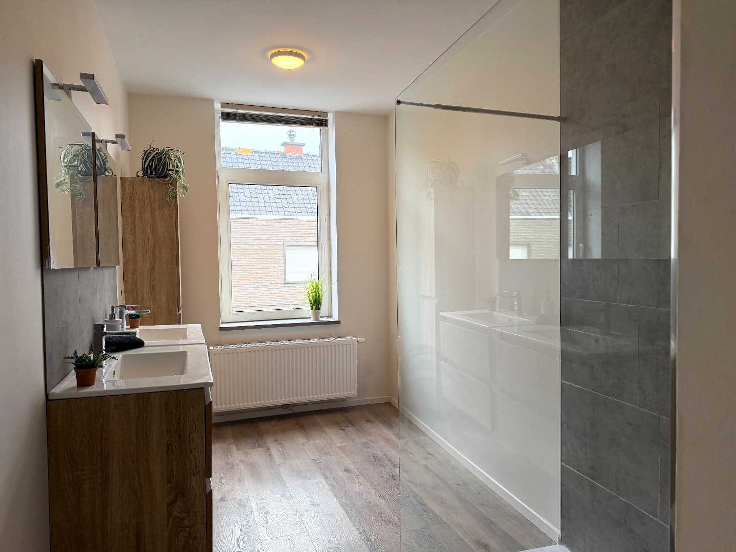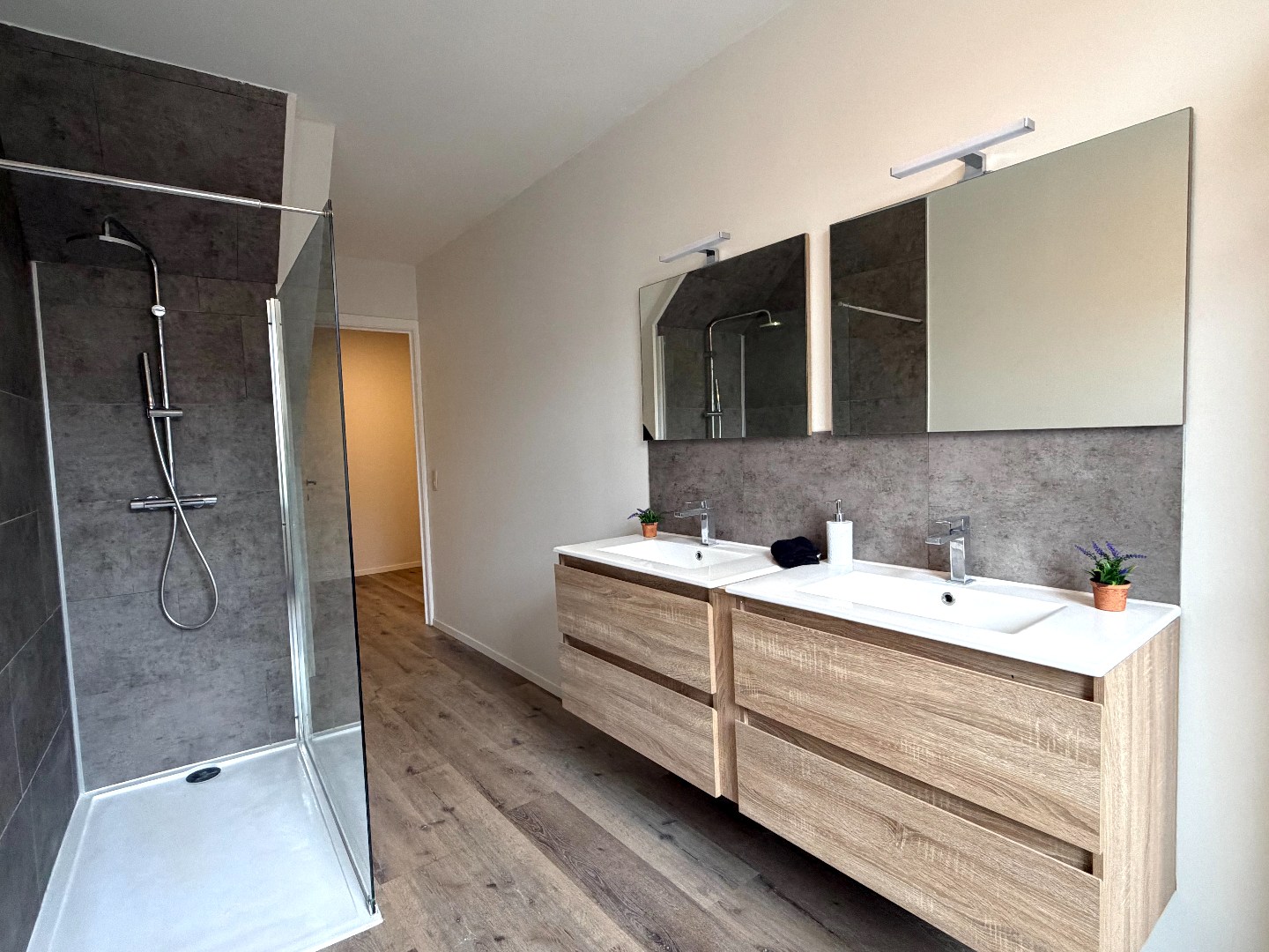 De badkamer heeft een dubbele lavabo en een inloopdouche. Het toilet bevindt zich apart.