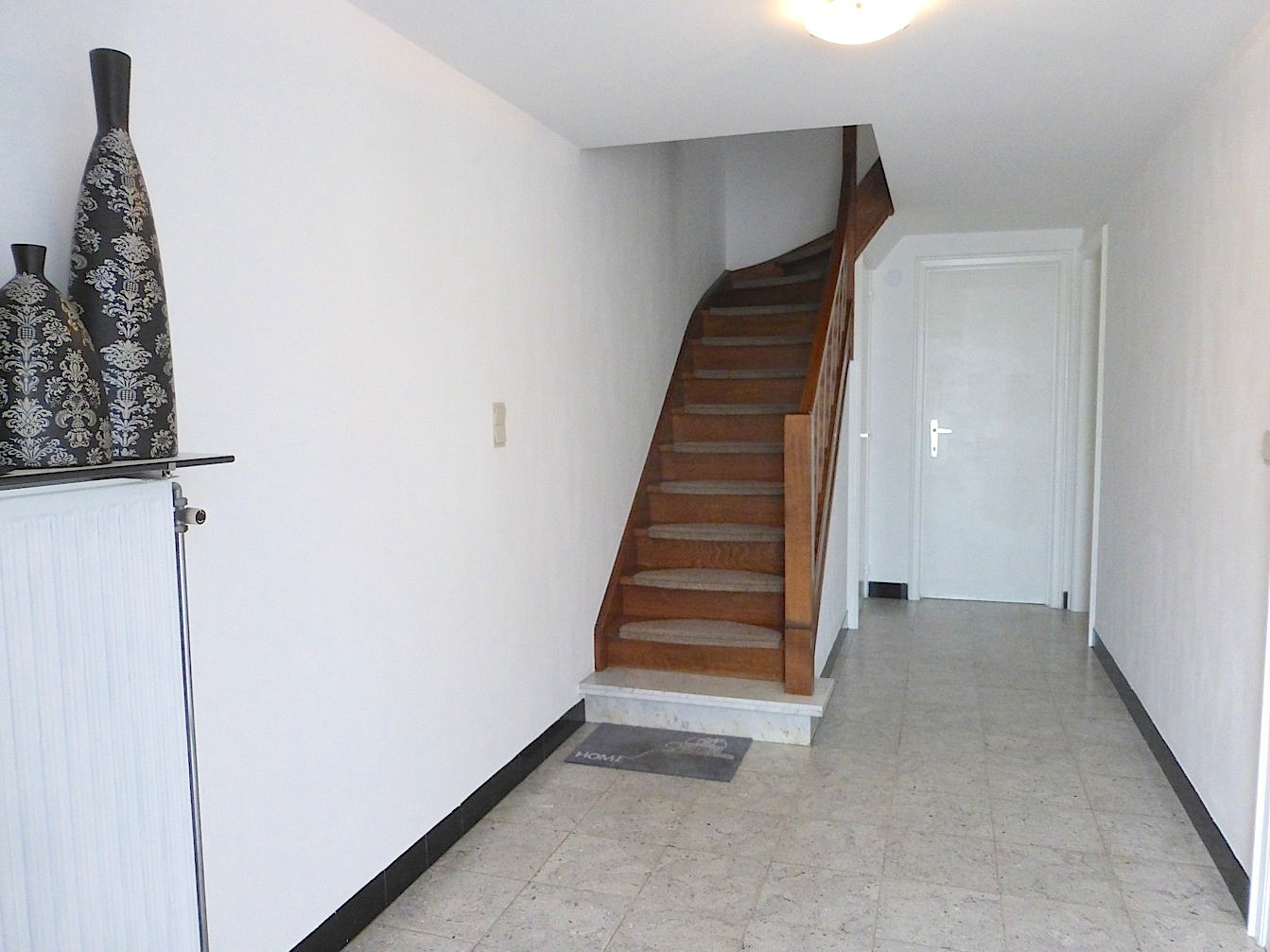 We betreden de woning via de ruime inkomhal. Rechts vinden we de garage met een elektrische sectionale poort. Achteraan is er een CV berging met aansluiting voor wasmachine en nog een aparte ruimte die kan dienst doen als bureel, hobbyruimte,... Langs hier is ook de gezellige tuin bereikbaar.