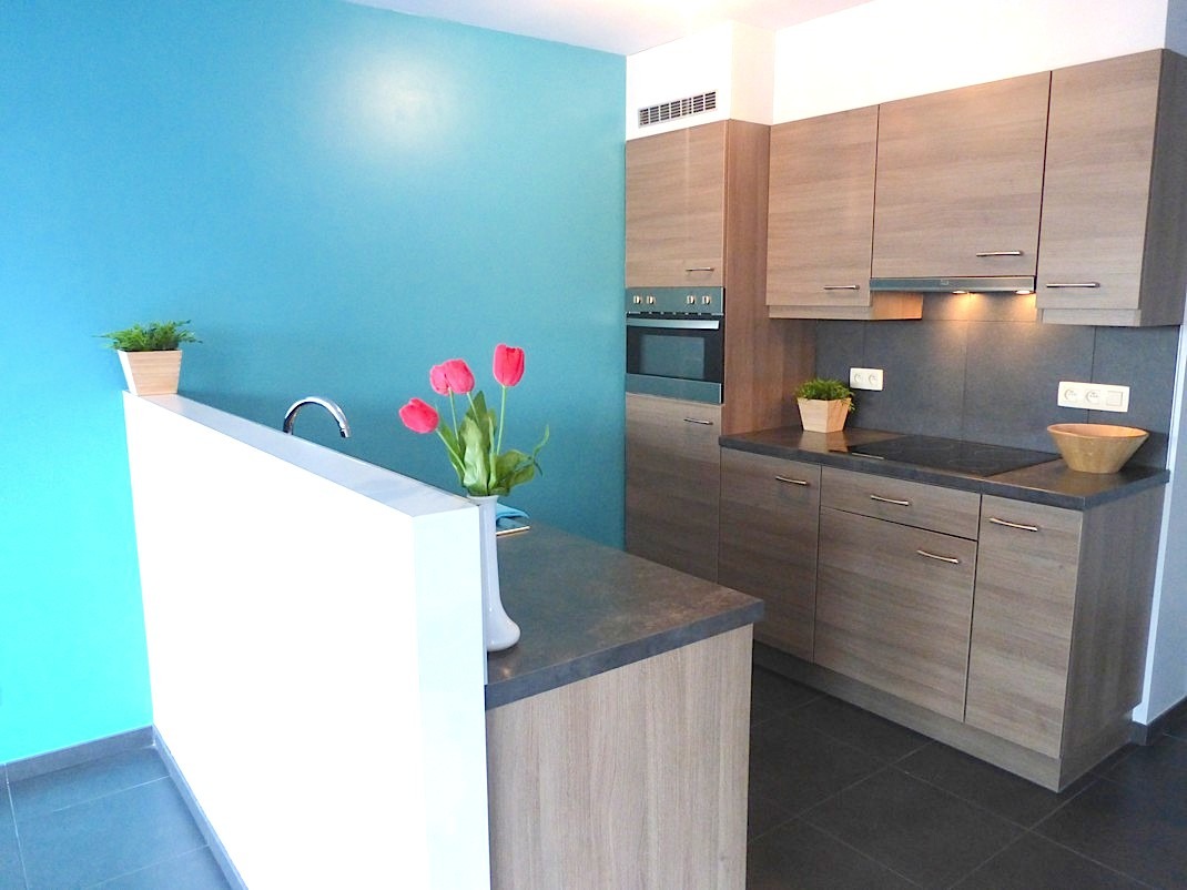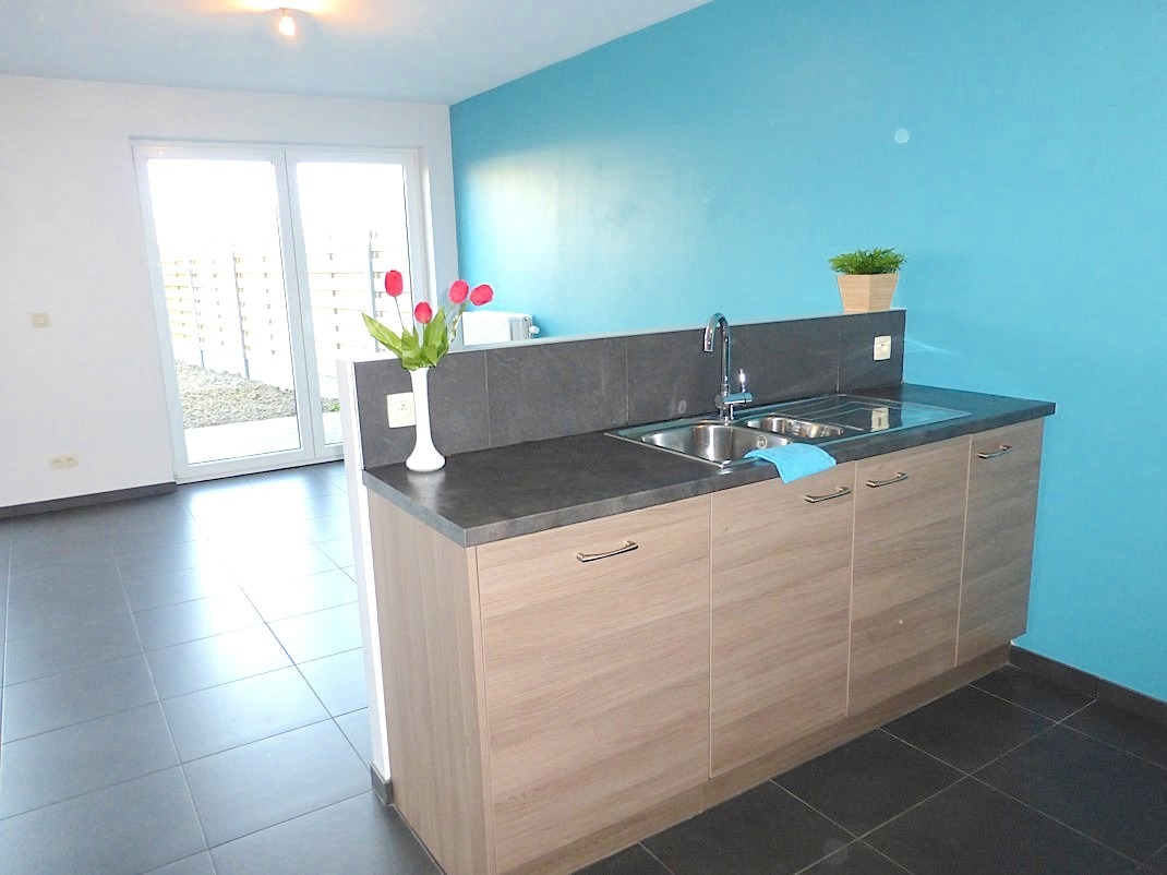 De living is achteraan gelegen en heeft een mooi zicht op de tuin. Door de vele ramen is het er zeer licht en aangenaam. Er is een open keuken die is ingericht met alle nodige toestellen.