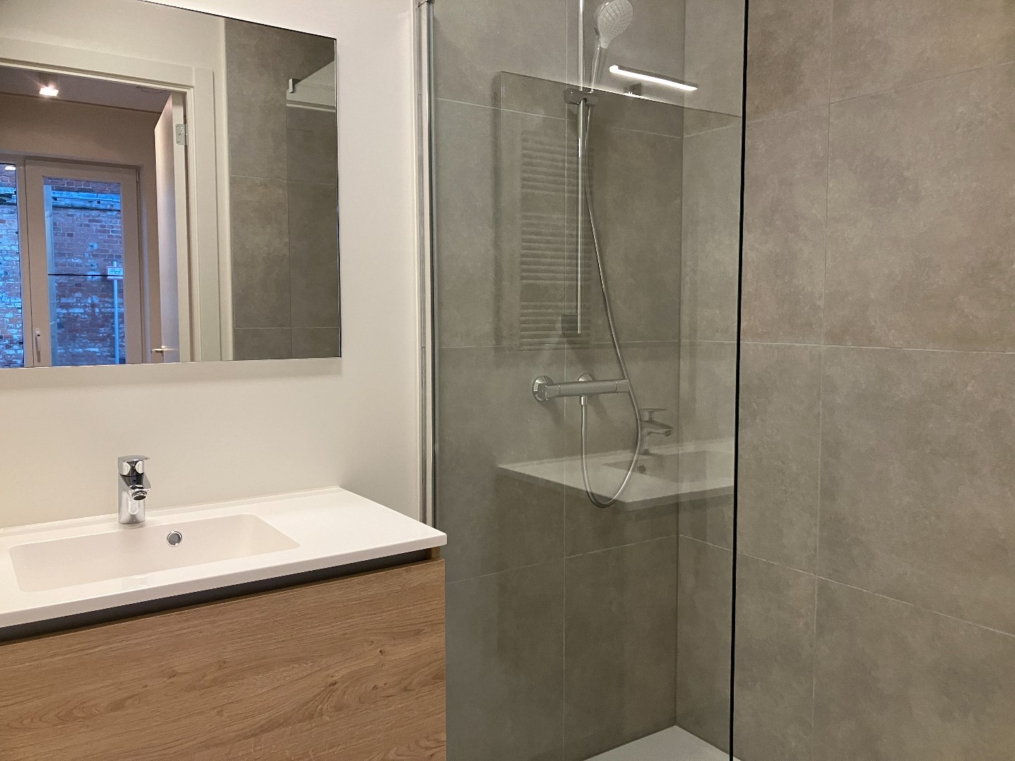 Via een glazen deur komen we aan het apart toilet enerzijds en de slaapkamer met en-suite badkamer anderzijde. De badkamer is voorzien van een lavabomeubel en inloopdouche.