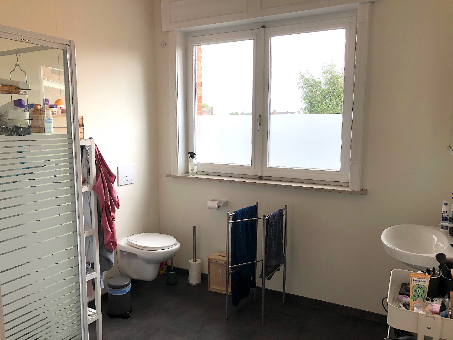De badkamer is voorzien van een lavabo, toilet en douche.