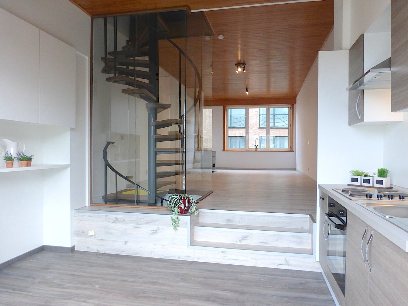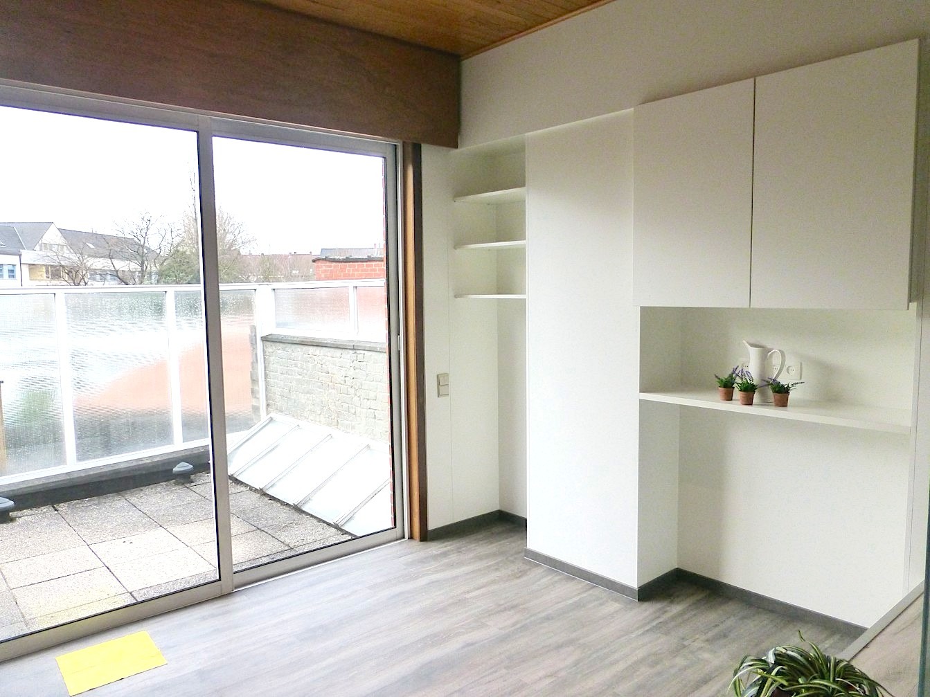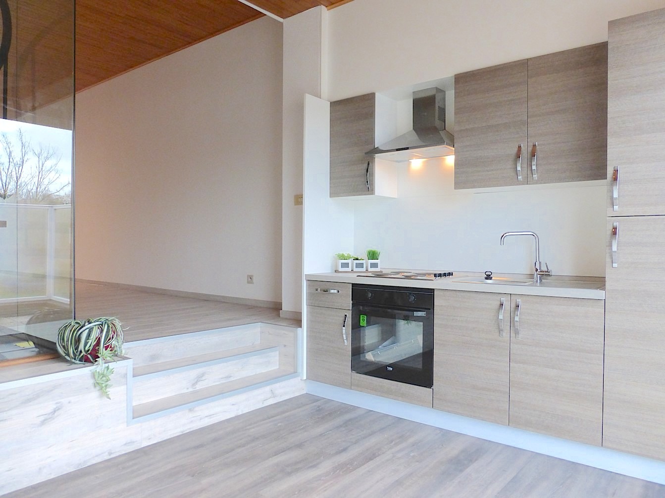 De eerste verdieping bestaat uit een toffe leefruimte met open keuken. Aansluitend vinden we tevens een leuk, zonnig terras.