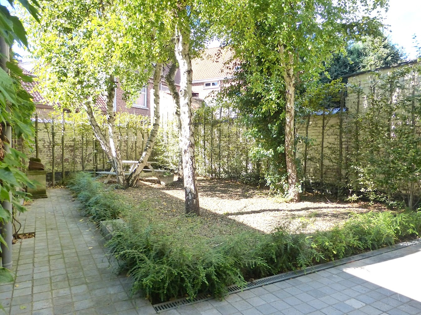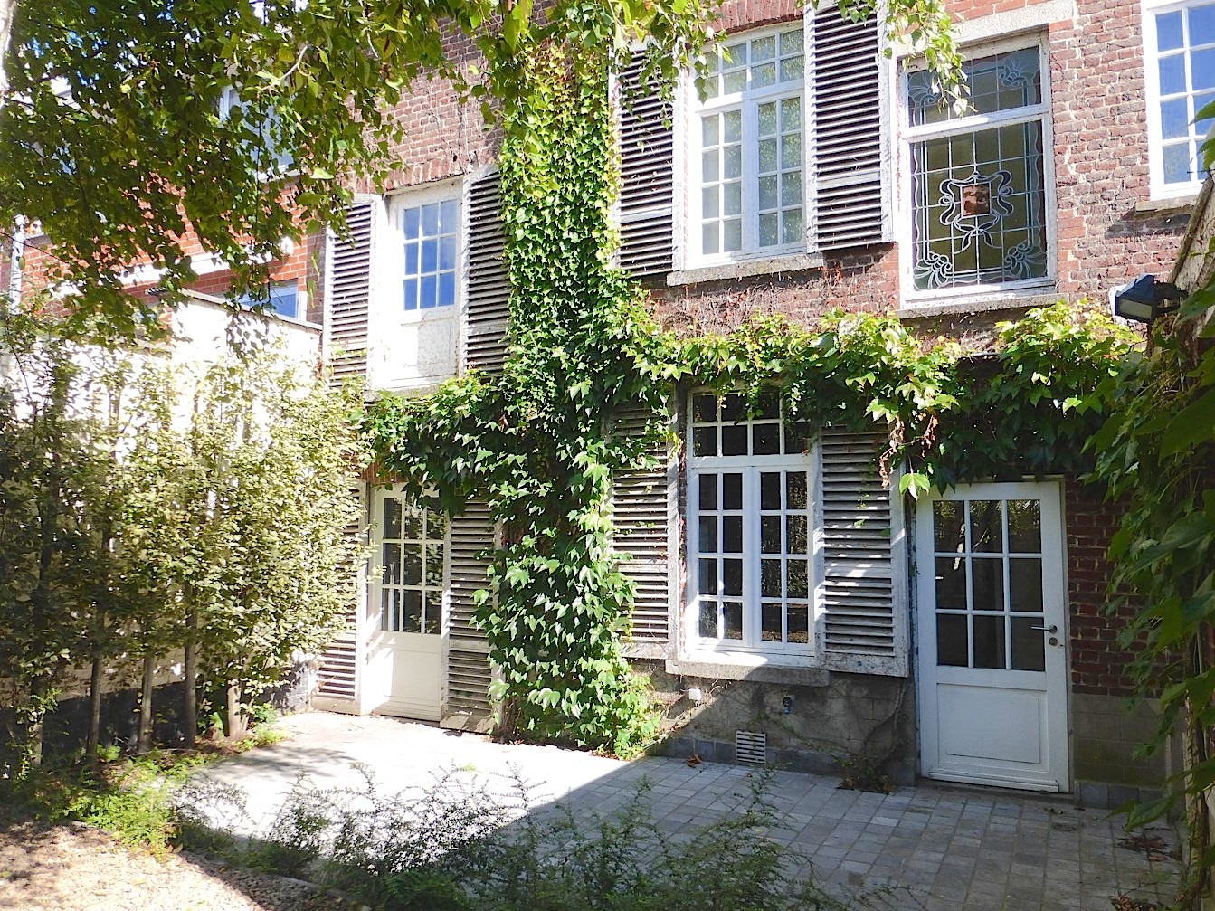Achter deze mooie gevel schuilt een ruime klassewoning. Bij het binnenkomen merken we de mooie inkomhal met typerend glasraam en andere originele elementen. Rechts is er een ruimte voor bureau of berging. De living is voorzien van parket en is verdeeld in 2 ruimtes. Via een dubbele deur is er nog een eetkamer met aangrenzend de ingerichte keuken. Het gelijkvloers beschikt verder nog over een badkamer met lavabo en inloopdouche, een apart toilet, wasplaats en ruime garage. In de stadstuin is het zeer aangenaam vertoeven in alle rust!