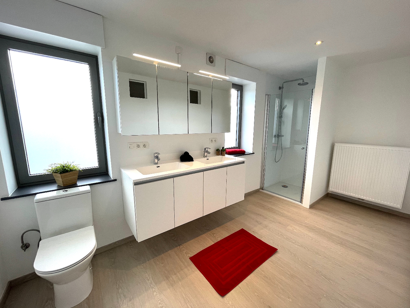De eerste verdieping beschikt over een uiterst grote slaapkamer en badkamer. De badkamer is voorzien van een dubbel lavabomeubel, toilet en douche.
