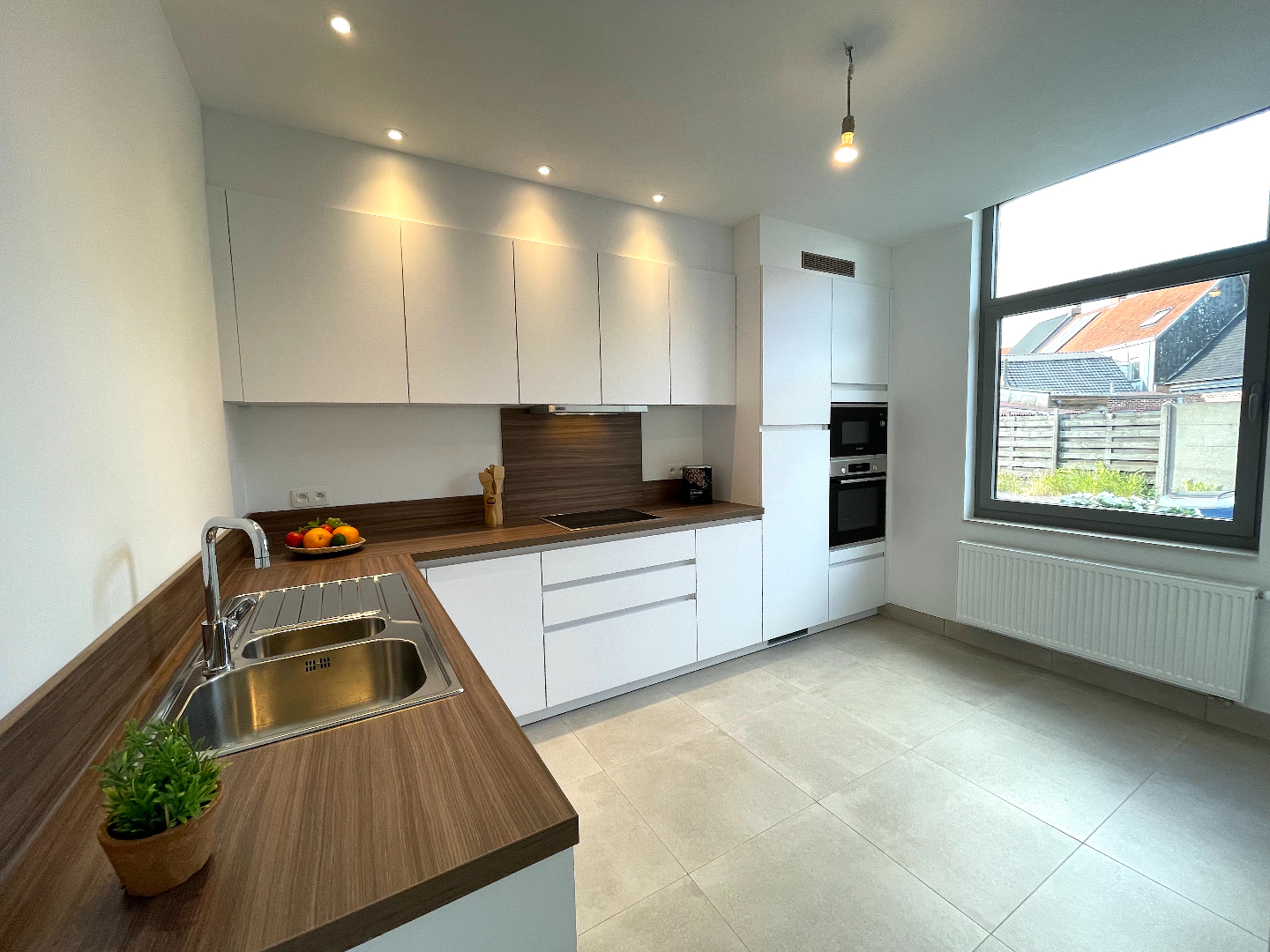 We komen de woning binnen en vinden er langs de straatkant de mooie, ruime keuken. De keuken is volledig uitgerust en er is ook plaats voor een eettafel. Vervolgens komen we in de leefruimte. Deze is heel lichtrijk en groot. De vele ramen geven een mooi zicht op de onderhoudsvriendelijke tuin met groot terras. Het is hier zalig vertoeven.