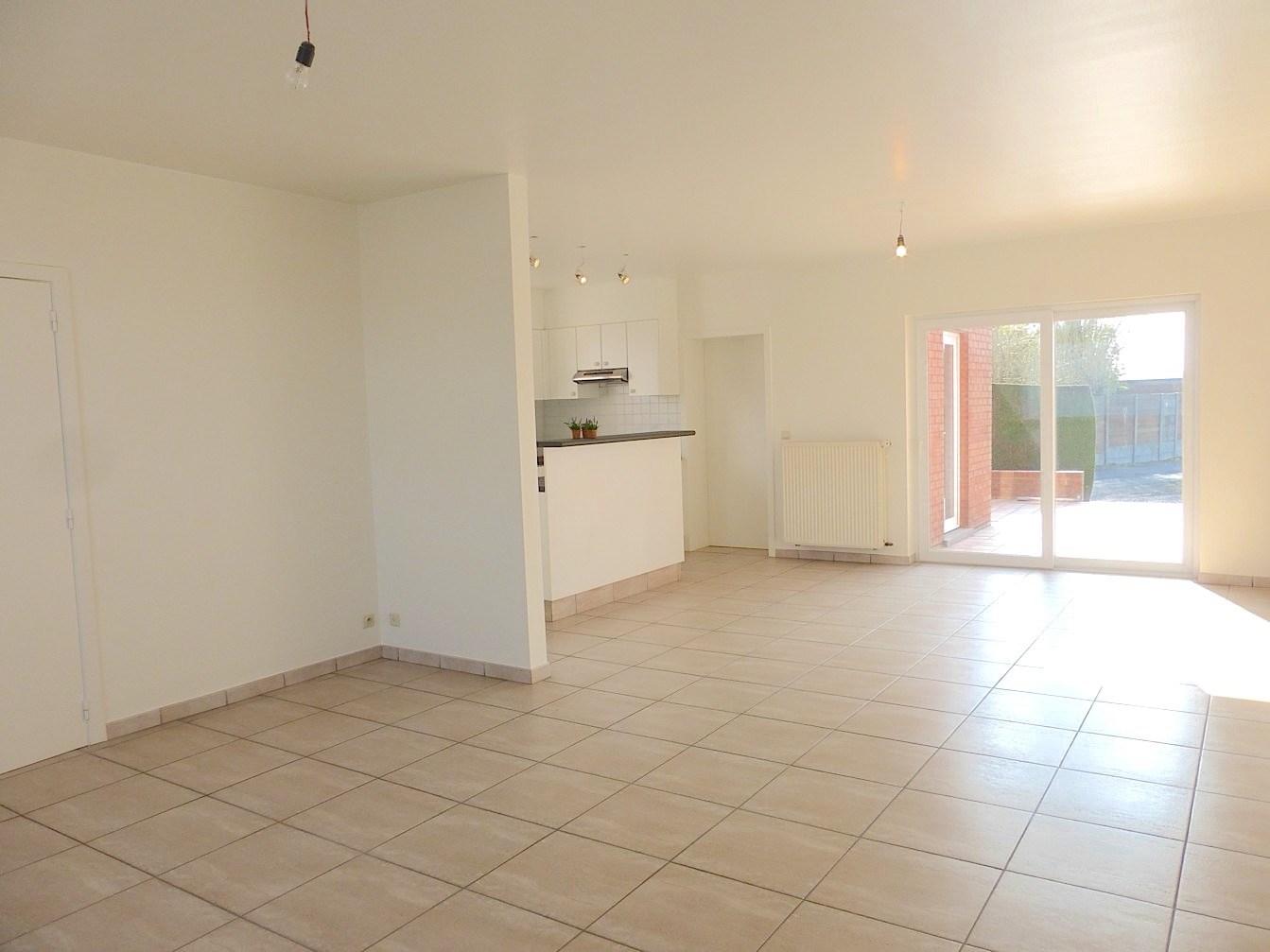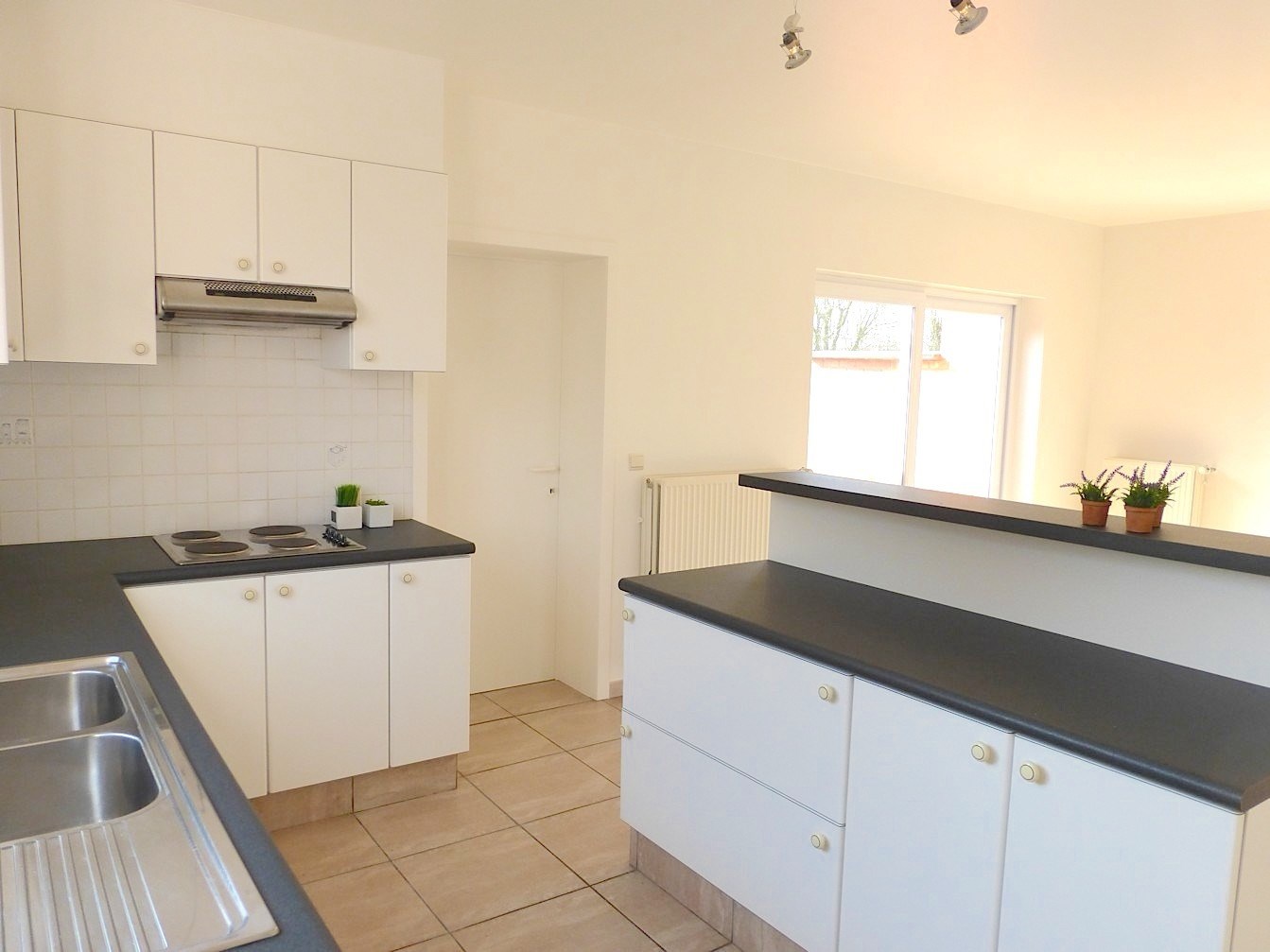 We komen de woning binnen via de hal om verder te gaan naar de living. Deze is ruim, zeer lichtrijk en gaat naadloos over in de open keuken. De keuken is zeer handig ingericht en voorzien van een elektrisch kookvuur. Aansluitend hebben we een berging/wasplaats.