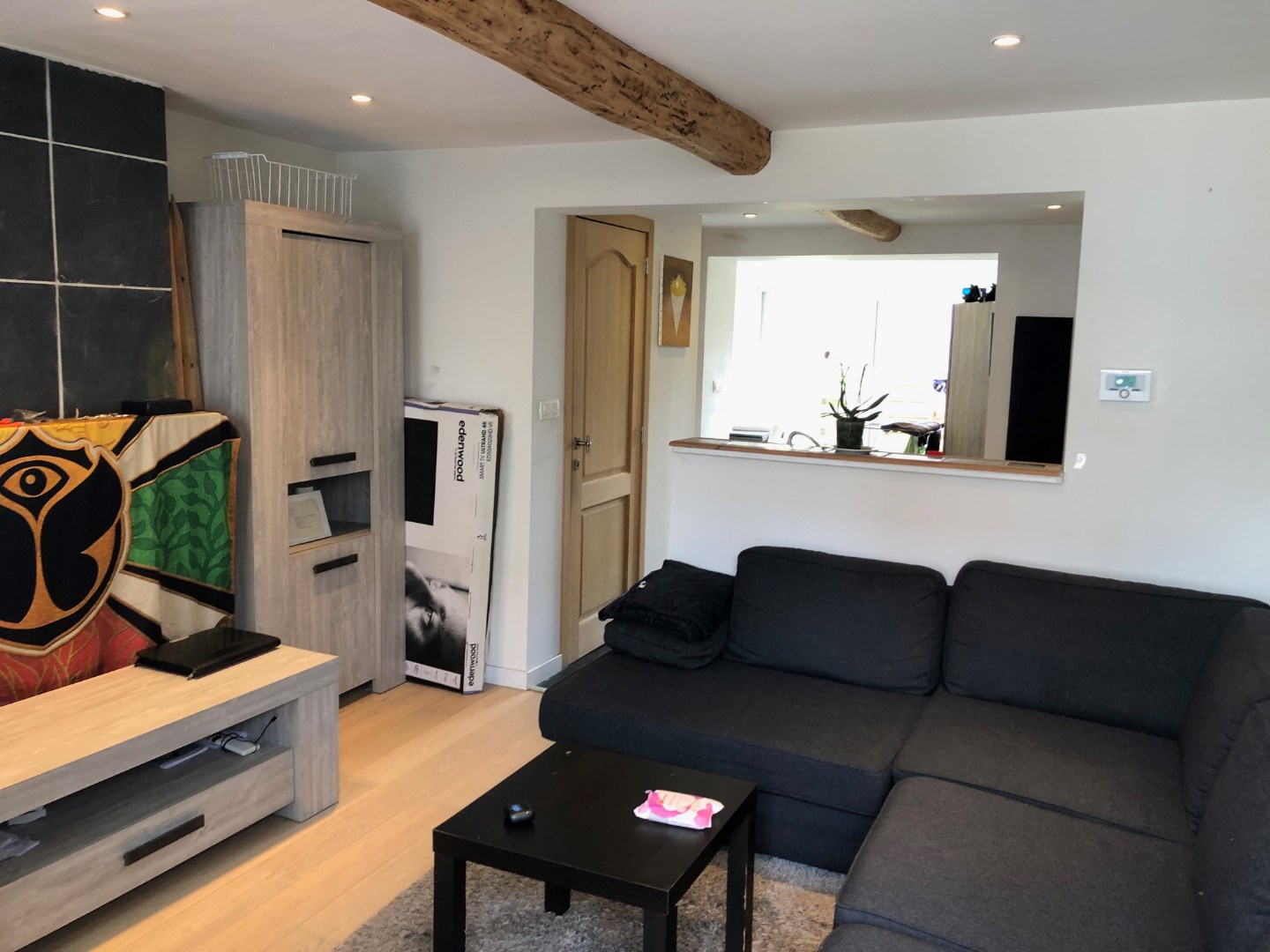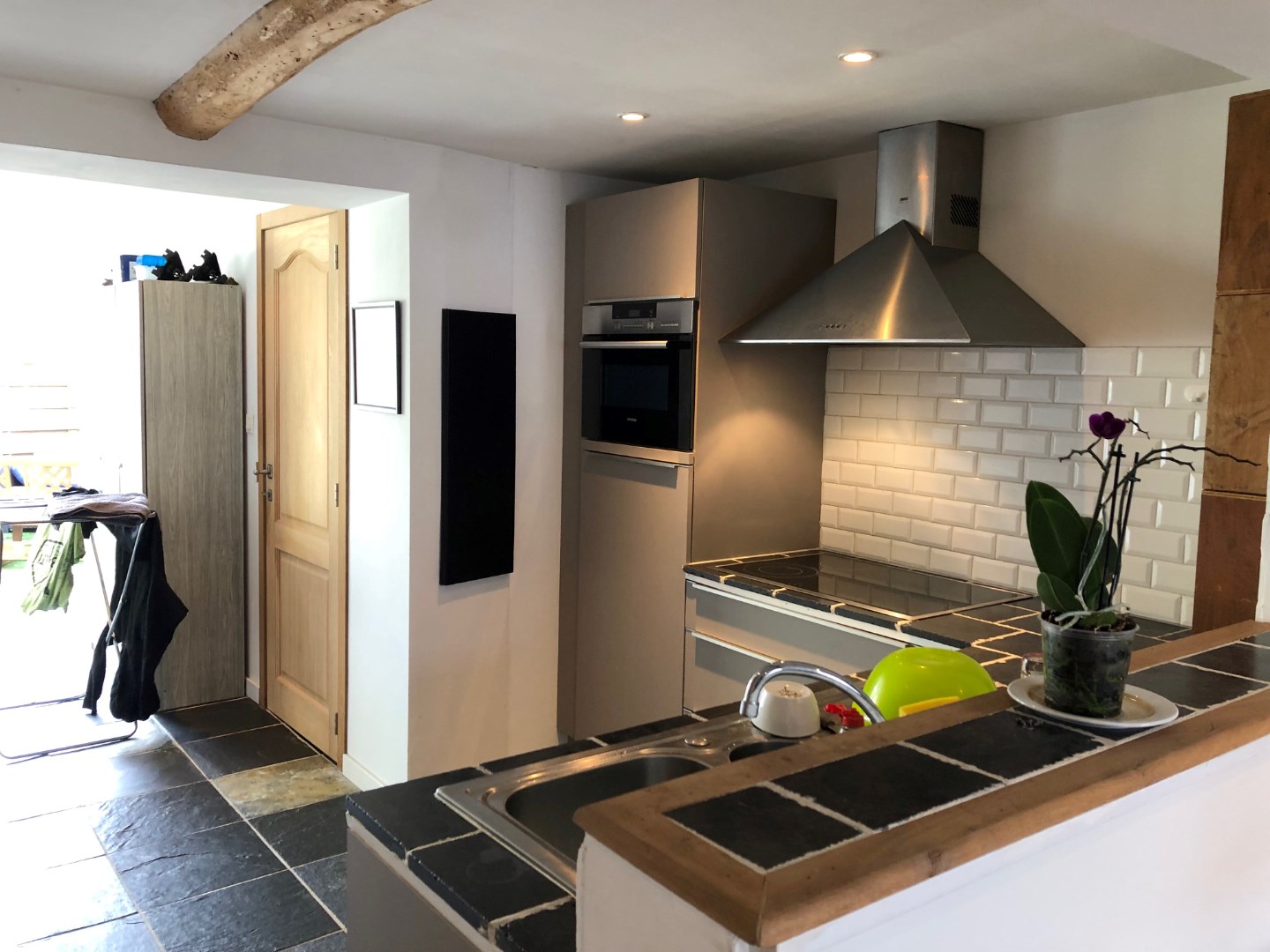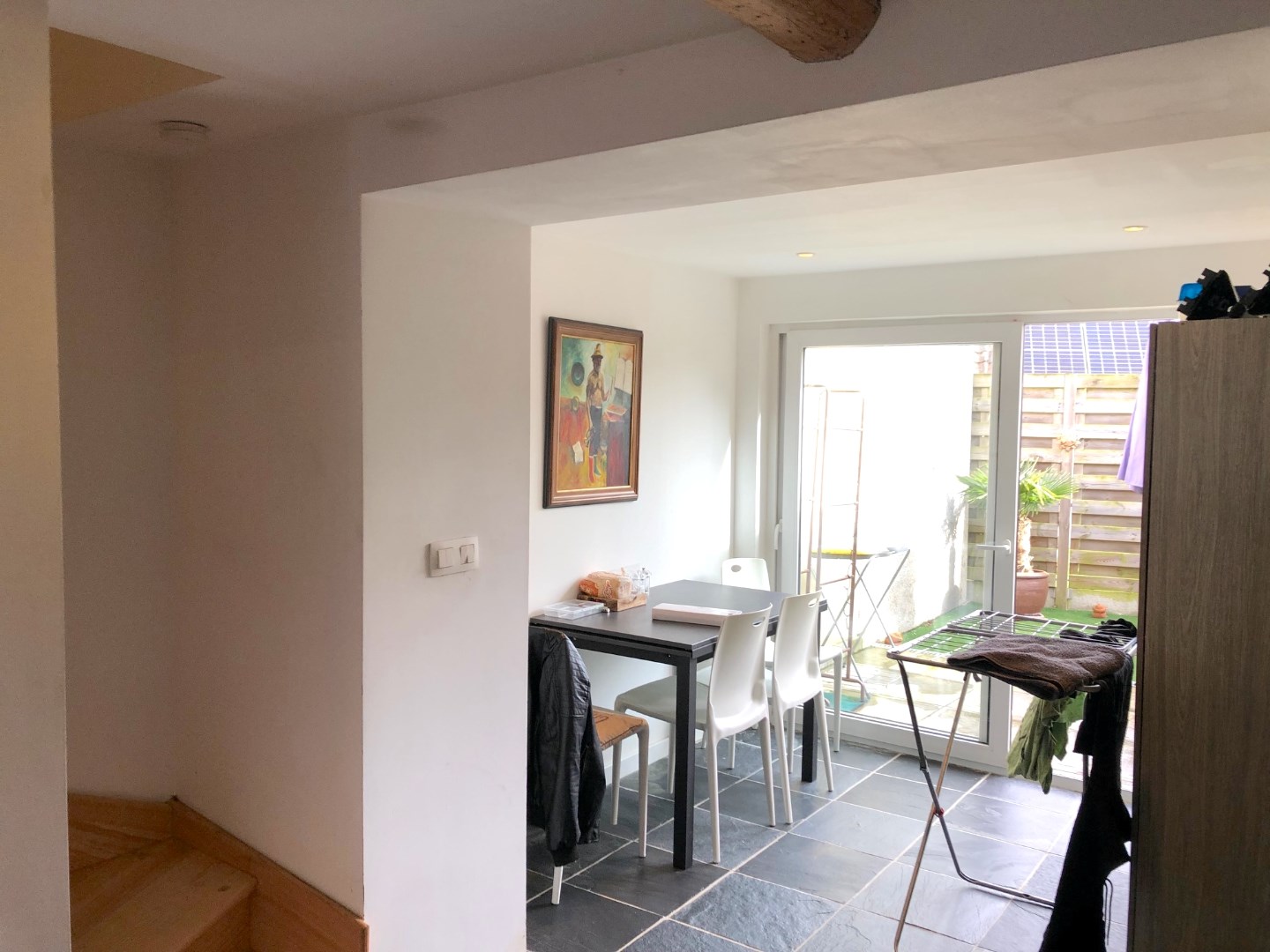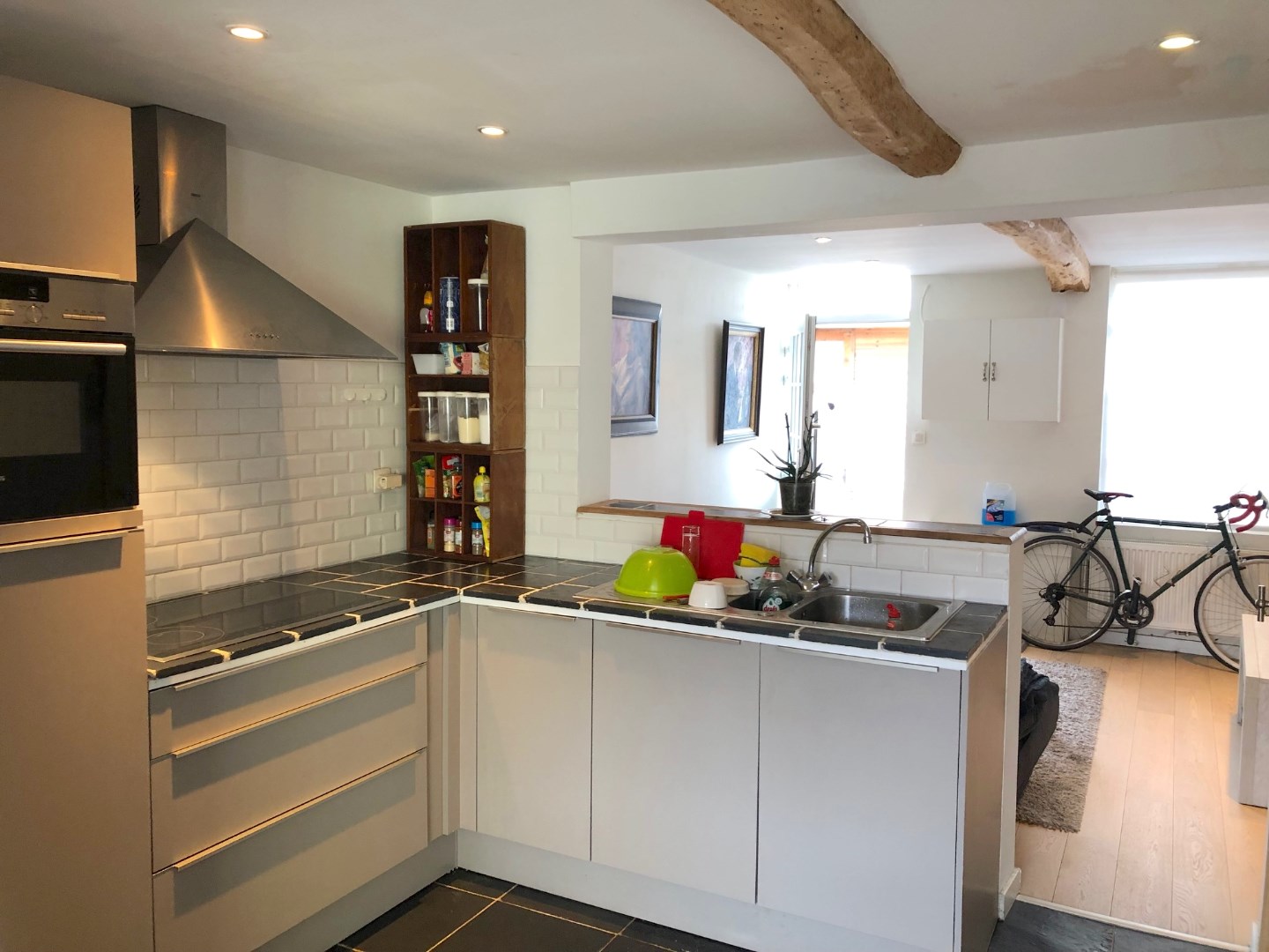 We komen rechtstreeks binnen in de gezellige zithoek. Deze gaat over naar de volledig geïnstalleerde keuken die beschikt over een eethoek. Via het grote schuifraam kunnen we naar de leuke en zonnige stadstuin.