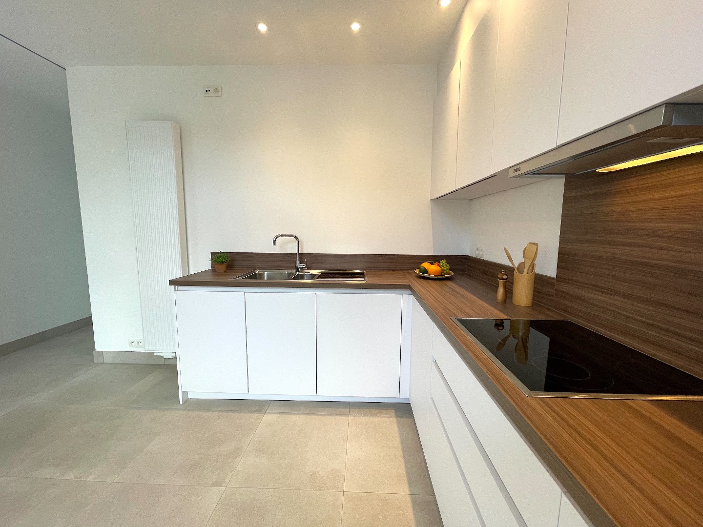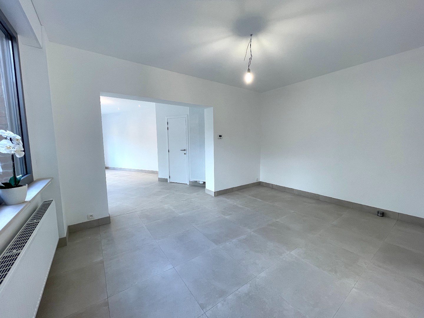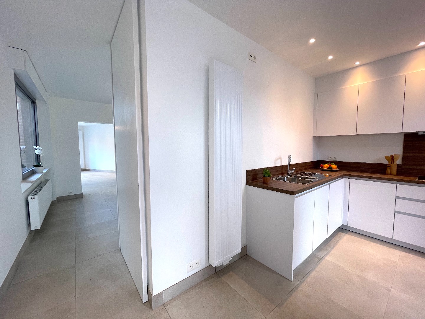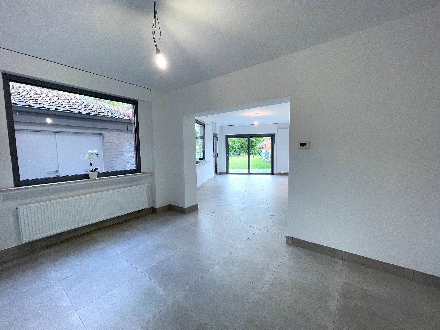 We komen de woning binnen en vinden er langs de straatkant de mooie, ruime keuken. De keuken is volledig uitgerust en er is ook plaats voor een eettafel. Vervolgens komen we in de leefruimte. Deze is heel lichtrijk en groot. De vele ramen geven een mooi zicht op de onderhoudsvriendelijke tuin met groot terras. Het is hier zalig vertoeven.