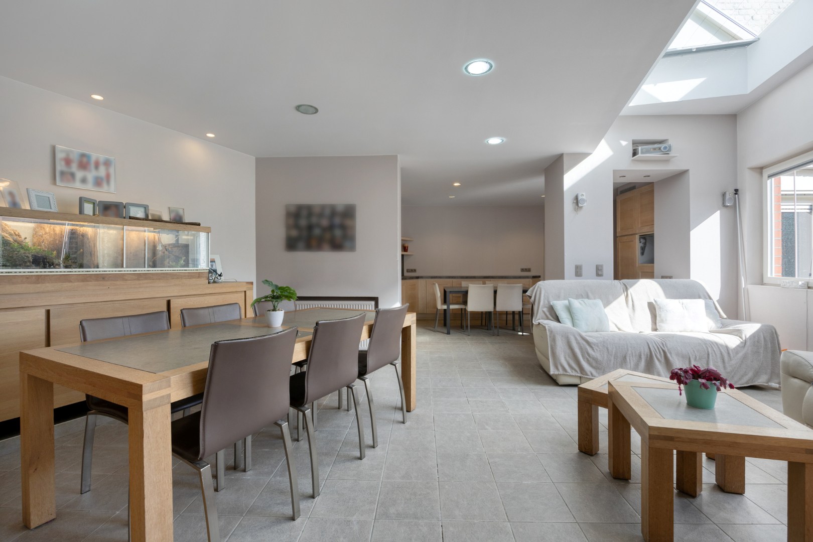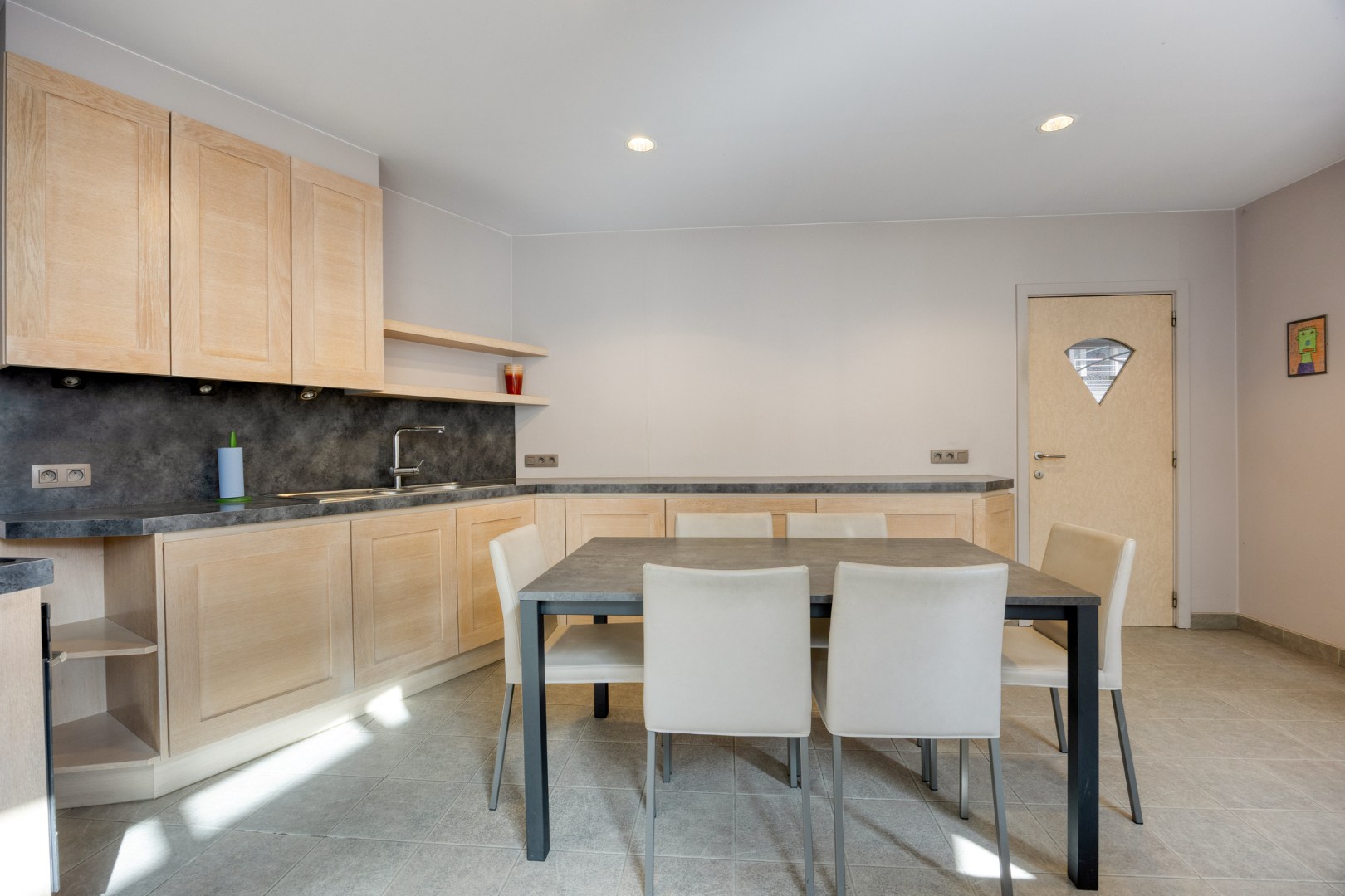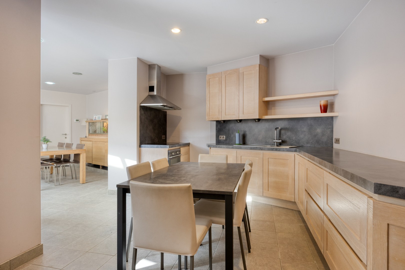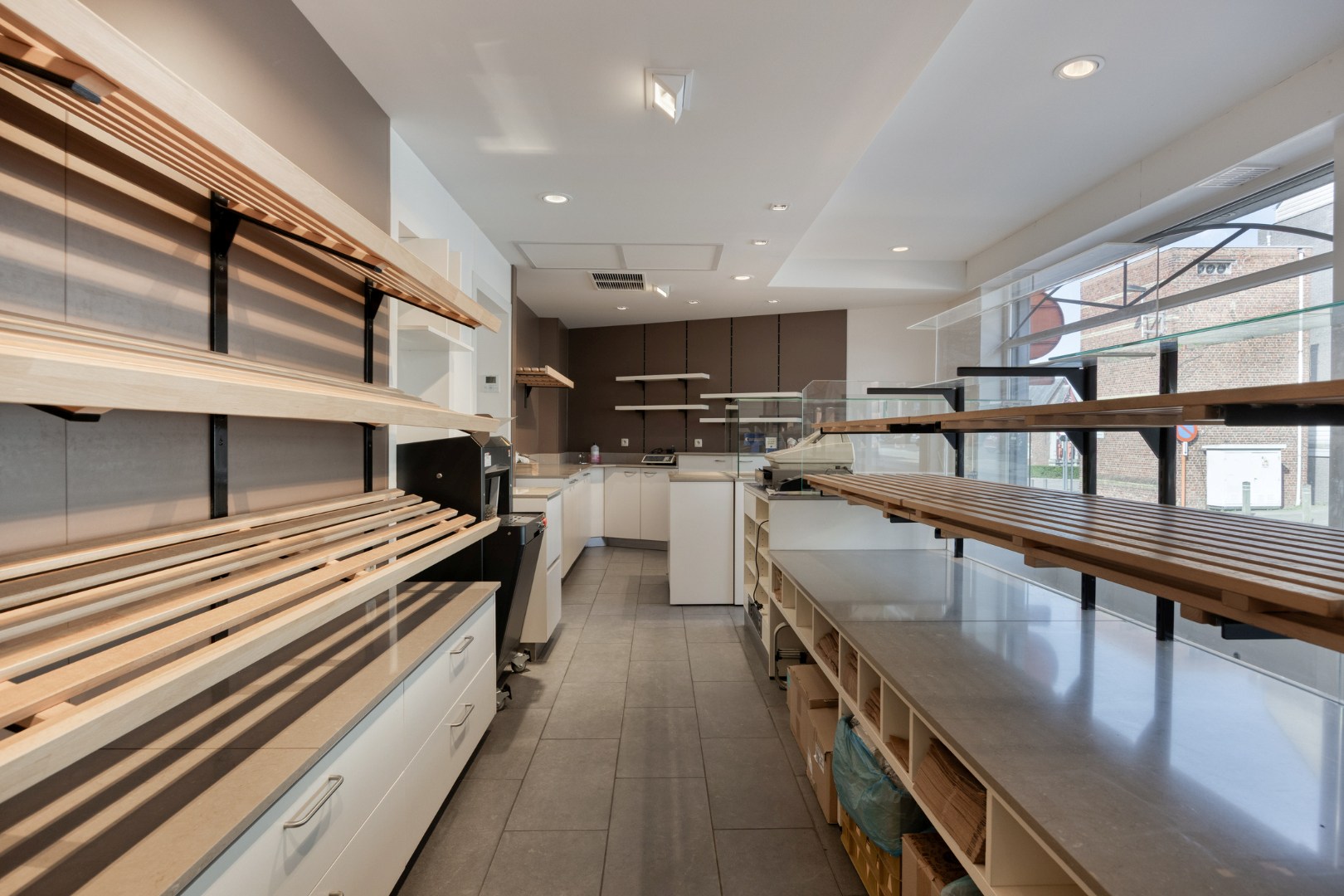 Via de volledig ingerichte bakkerij is er toegang tot de achtergelegen leefruimte met prachtige keuken enerzijds, en anderzijds is er een rechtstreekse toegang tot de garage.