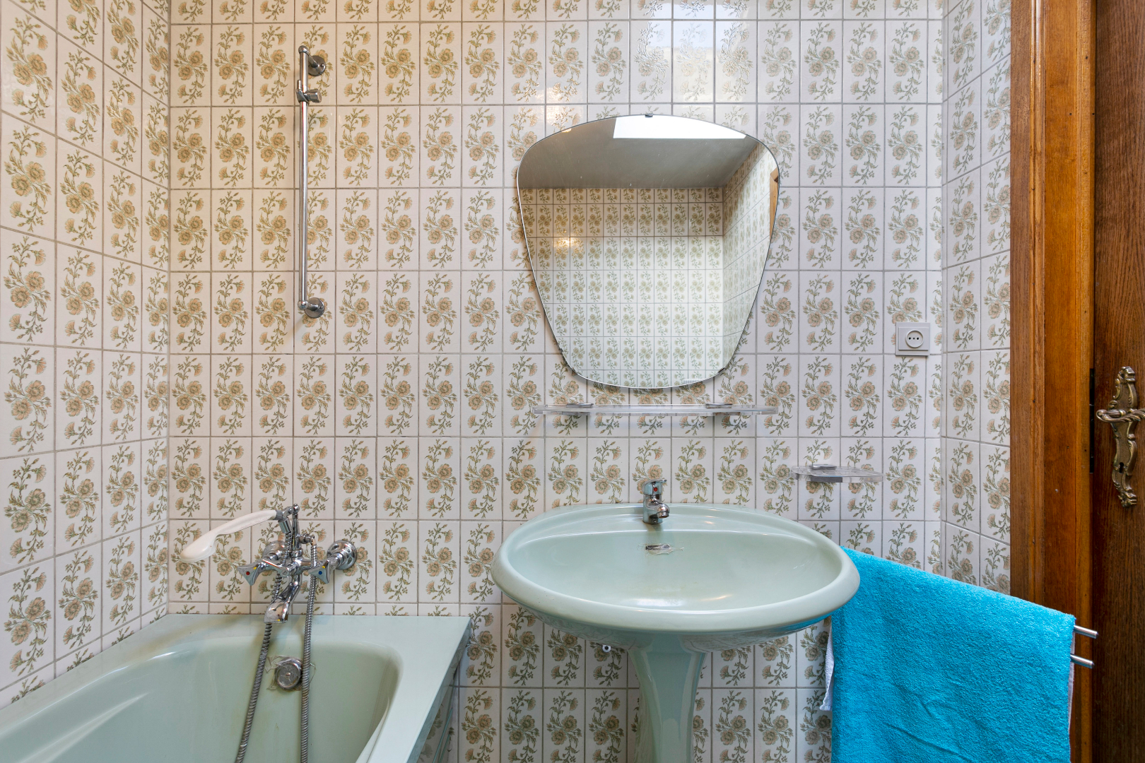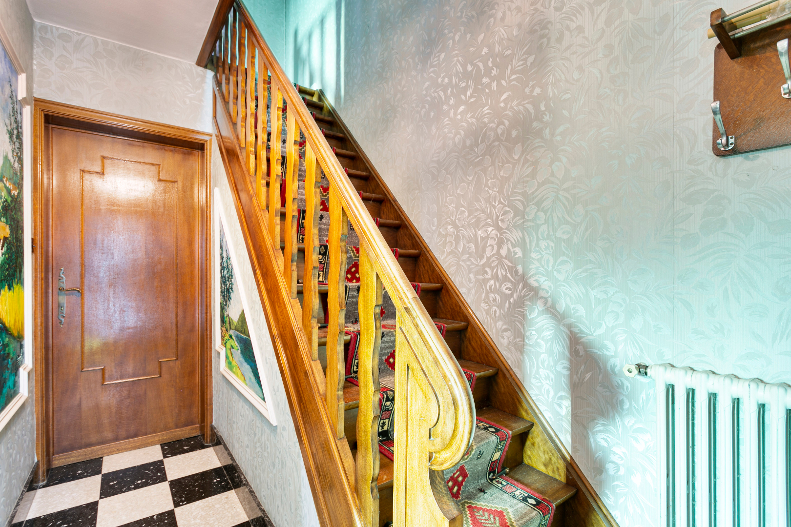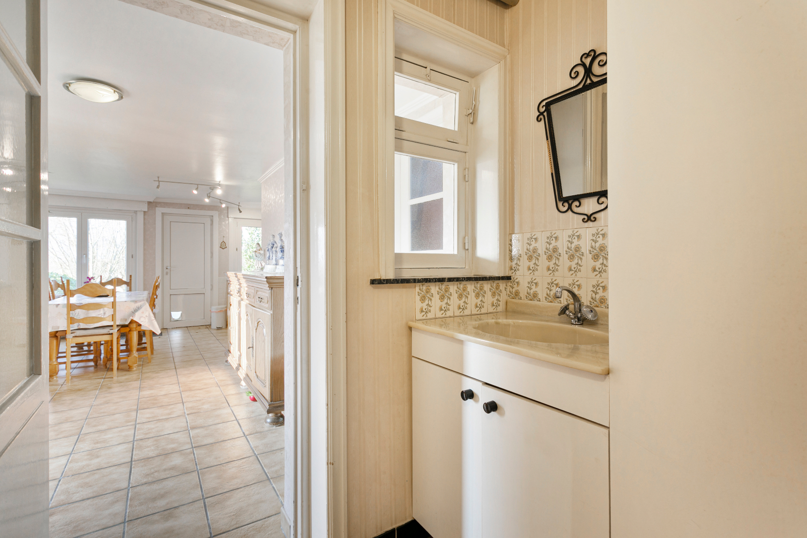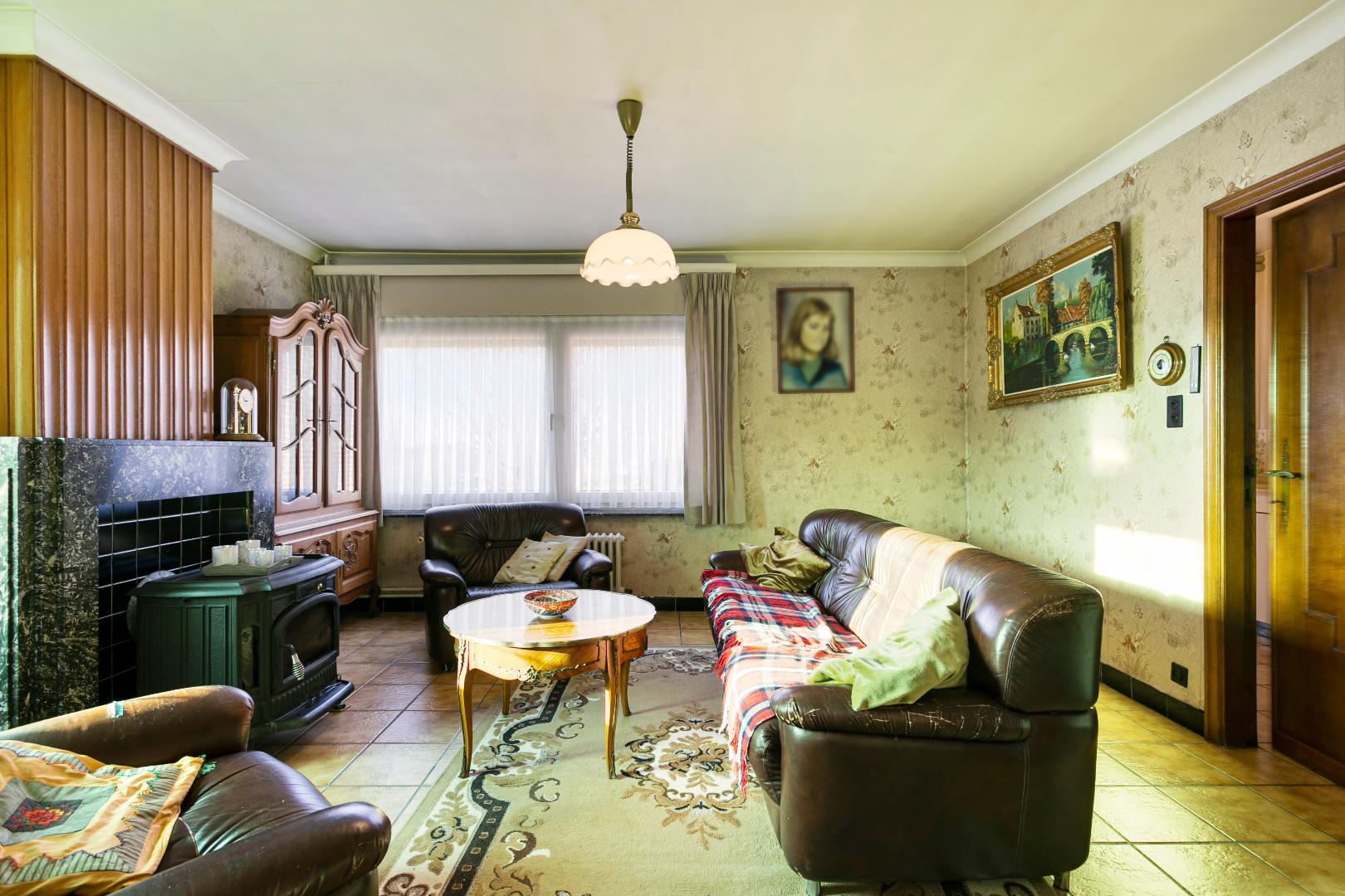 Via de inkomhal komen we rechtstreeks in de eerste leefruimte. Deze ruimte heeft de klassiek vorm, maar springt uit door de vele ramen die voor extra lichtinval zorgen, alsook het prachtig uitzicht naar binnen haalt. Vanuit deze ruimte kunnen we verder naar een tussenhal, die uitgeeft op de inpandige garage, de kelderruimte en een verbazend grote leefkeuken aan de achterzijde van de woning. Deze ruimte grenst aan de badkamer enerzijds en aan de CV-ruimte anderzijds. Daarnaast is er nog een toegang tot de garage en een gastentoilet op het gelijkvloers aanwezig.