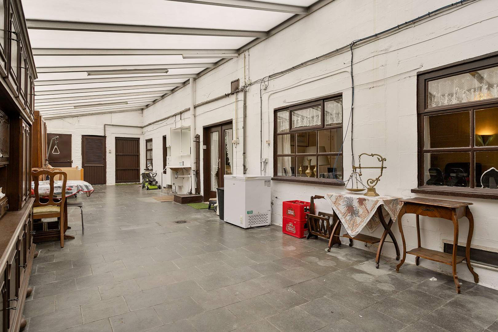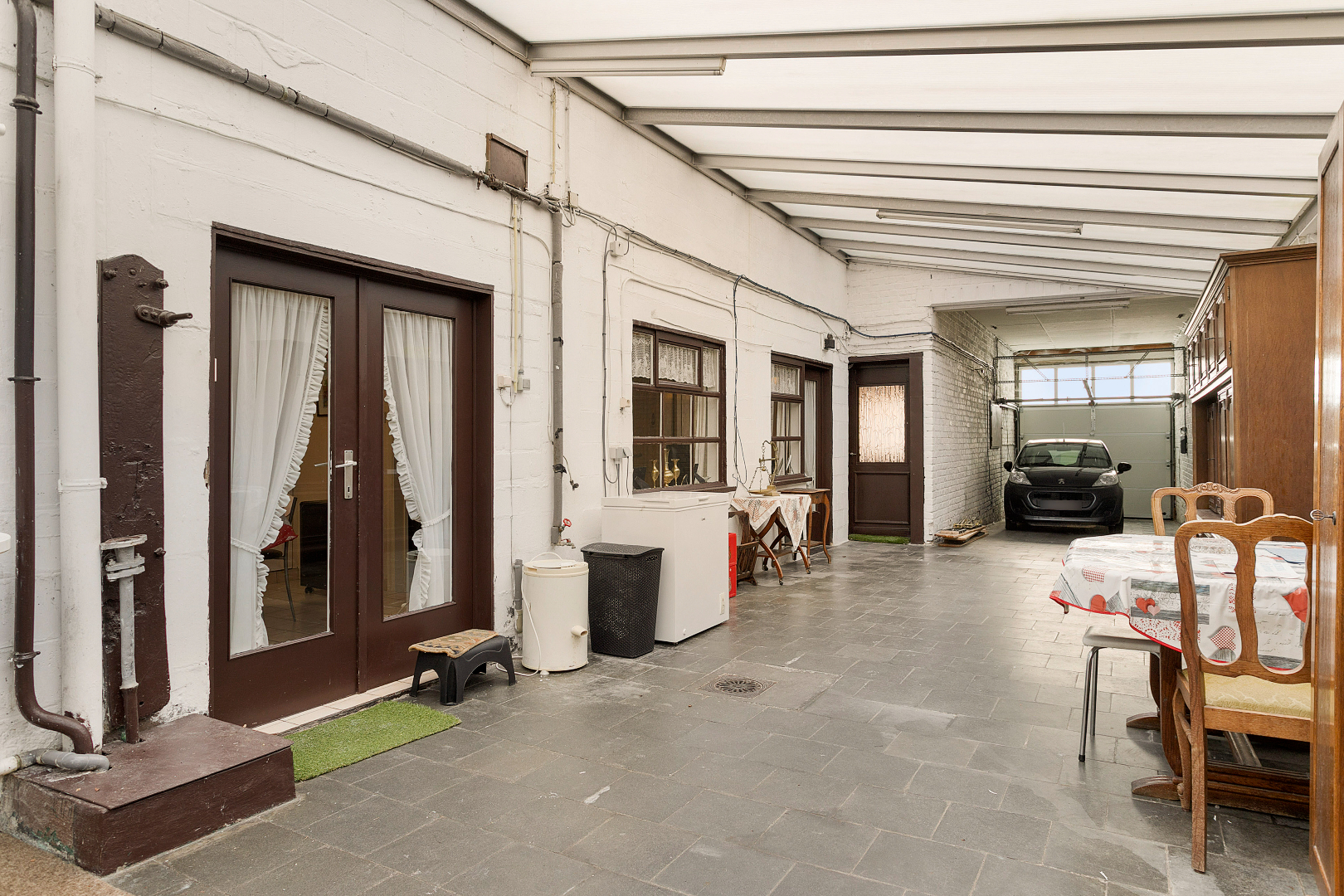 De voorgevel van de woning verraadt niet dat de naastliggende garage en achterliggende tuin ook bij de woning hoort. Via de inkomhal komen we rechtstreeks in een eerste leefruimte , gevolgd door een gezellig salon en een leefkeuken. Deze ruimtes grenzen aan een groot overdekt terras, die aansluit op de garage.