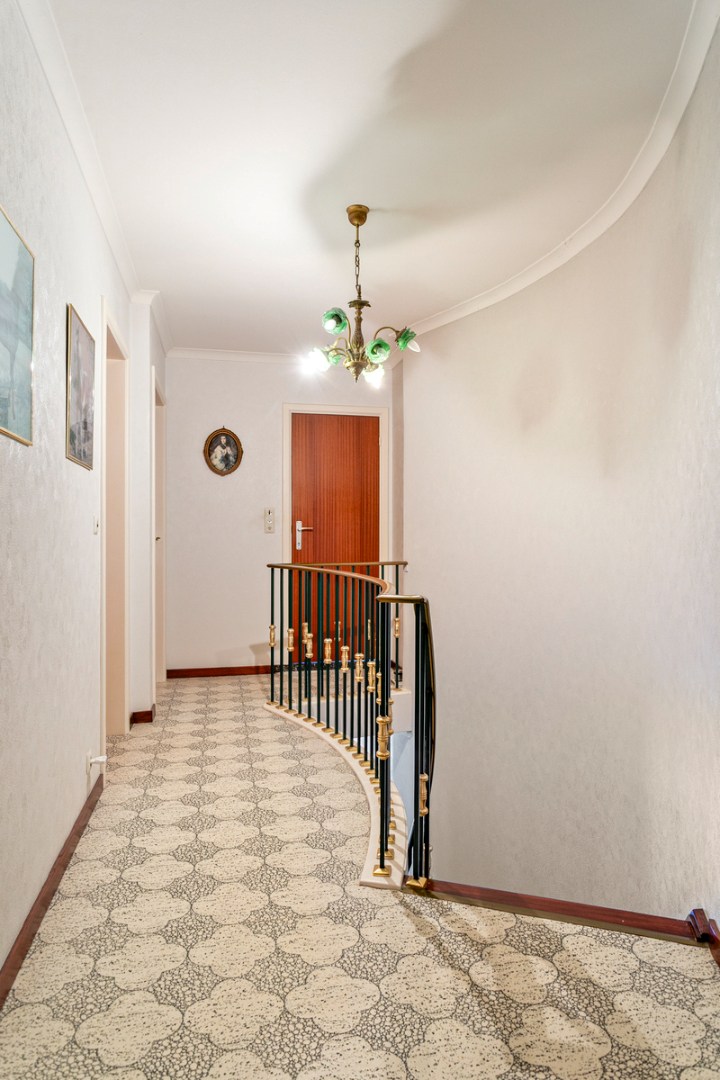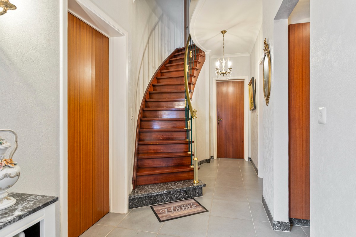 De inkomhal toont reeds de originaliteit van de woning met de stijlvolle halfronde trap. Vanuit deze inkomhal is er is er toegang tot het bureau, de vestiaire en gastentoilet, tot de keuken en eveneens tot de leefruimte.