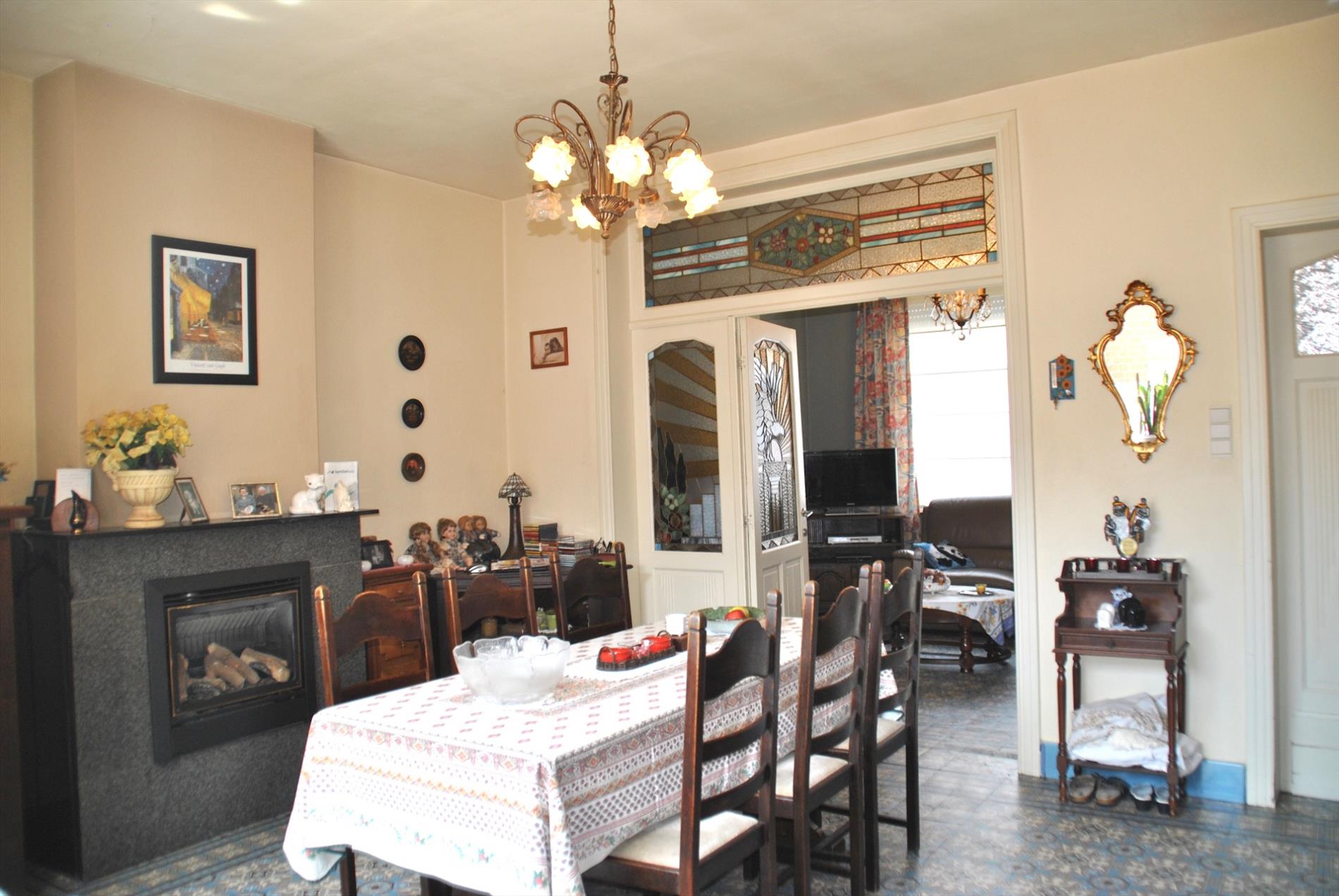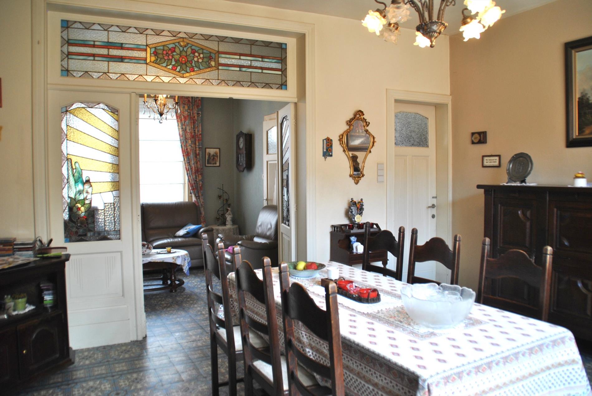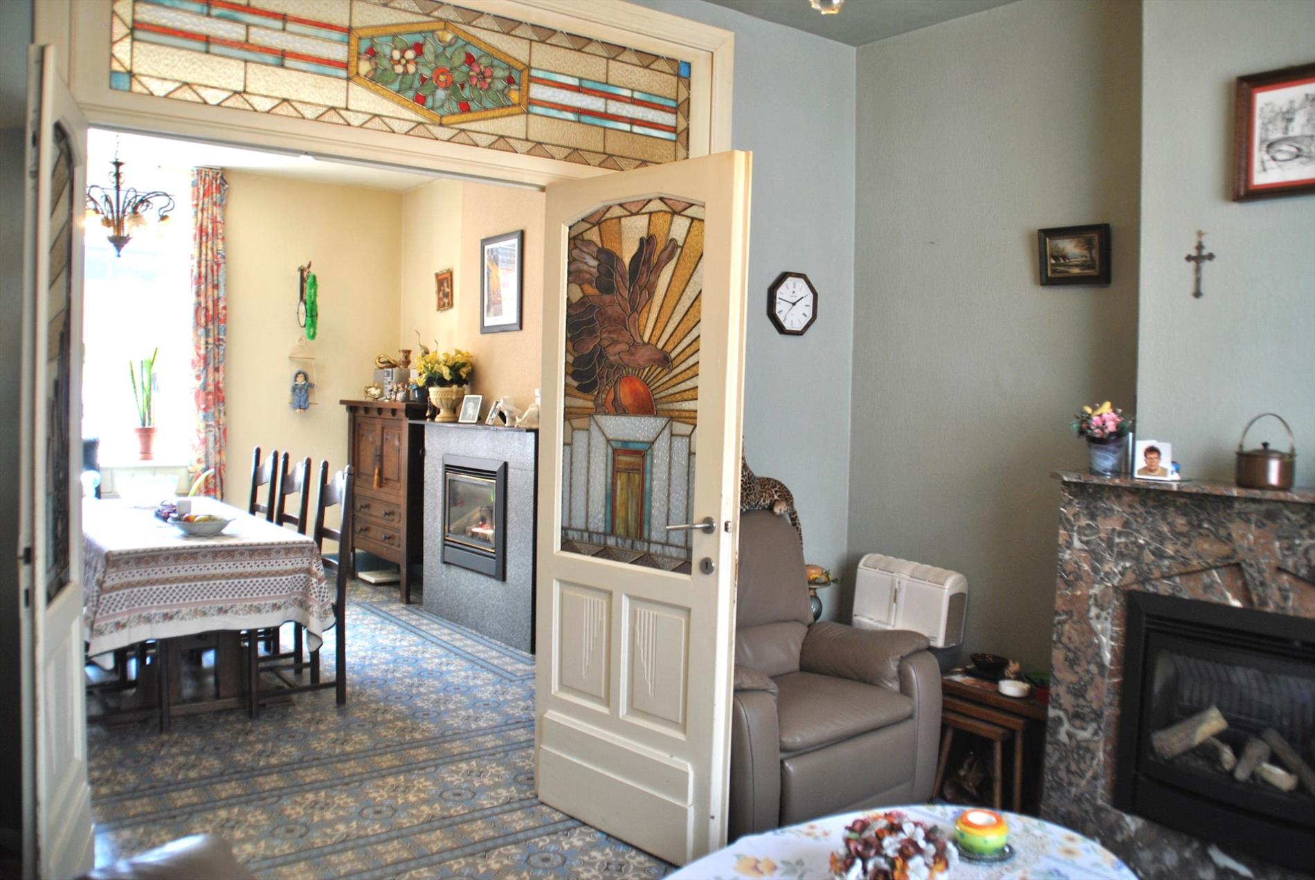 Bij het binnenkomen merken we direct de mooie originele vloer op in de stijlvolle inkomhal. Deze vinden we ook terug in de leefruimte en ‘voorplek’. Deze twee worden gescheiden door een mooie , dubbele deur met origineel glaswerk.