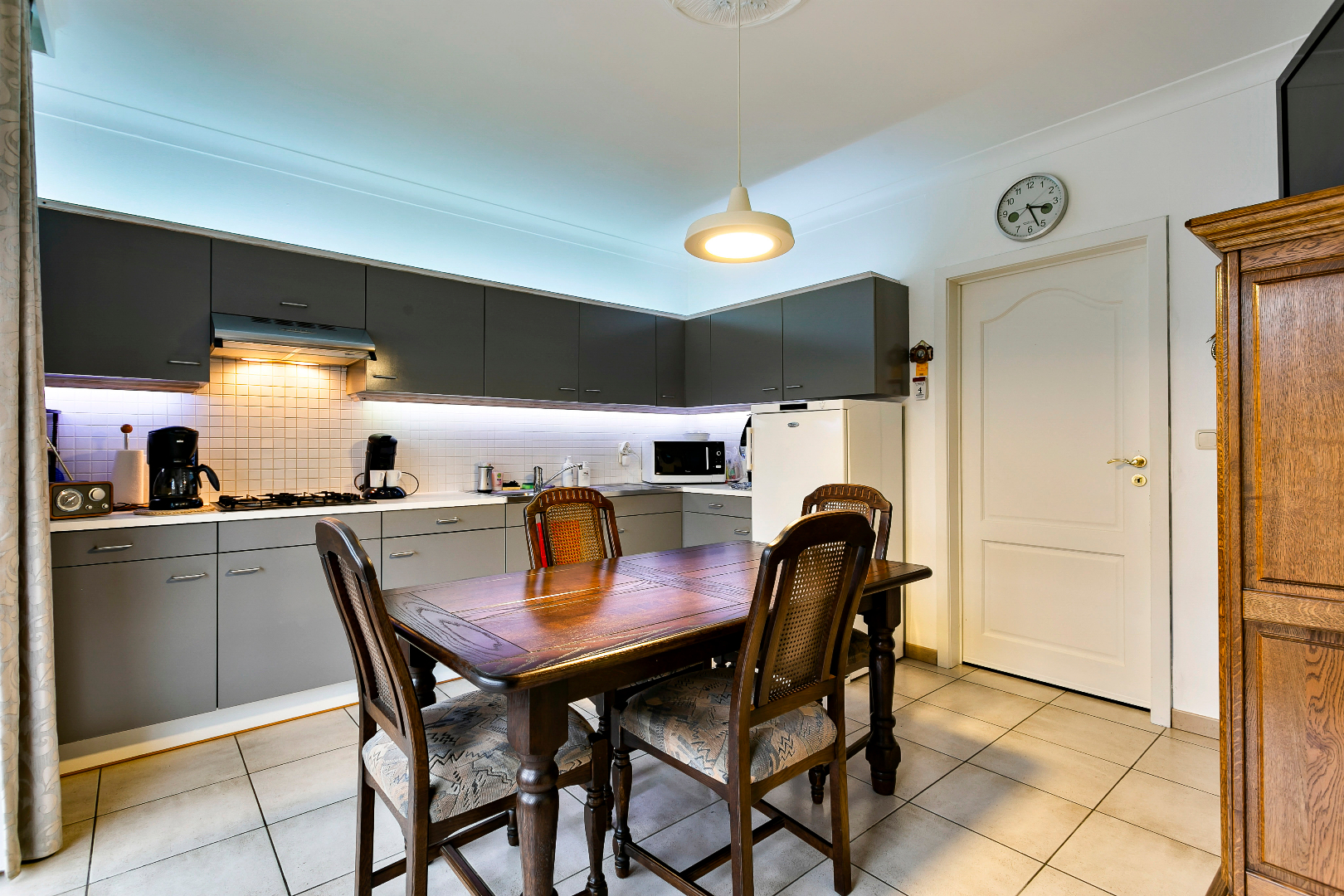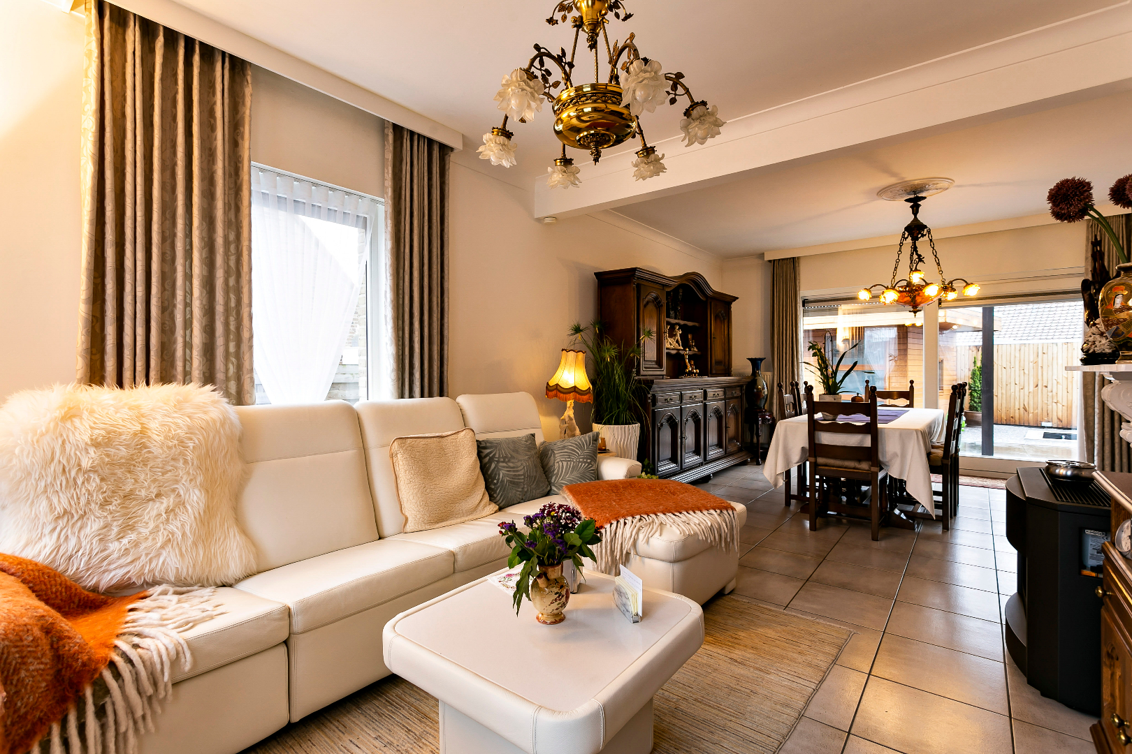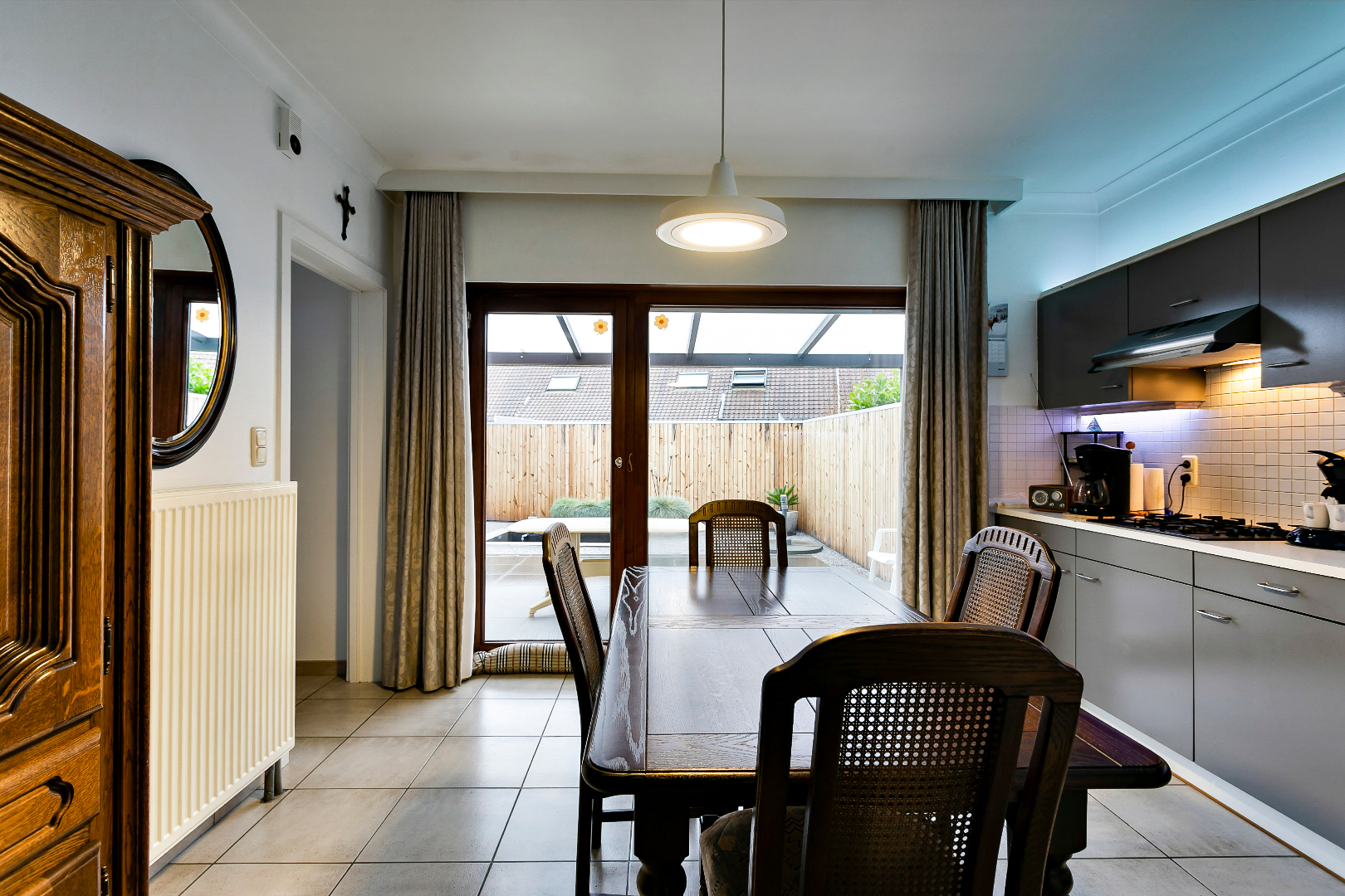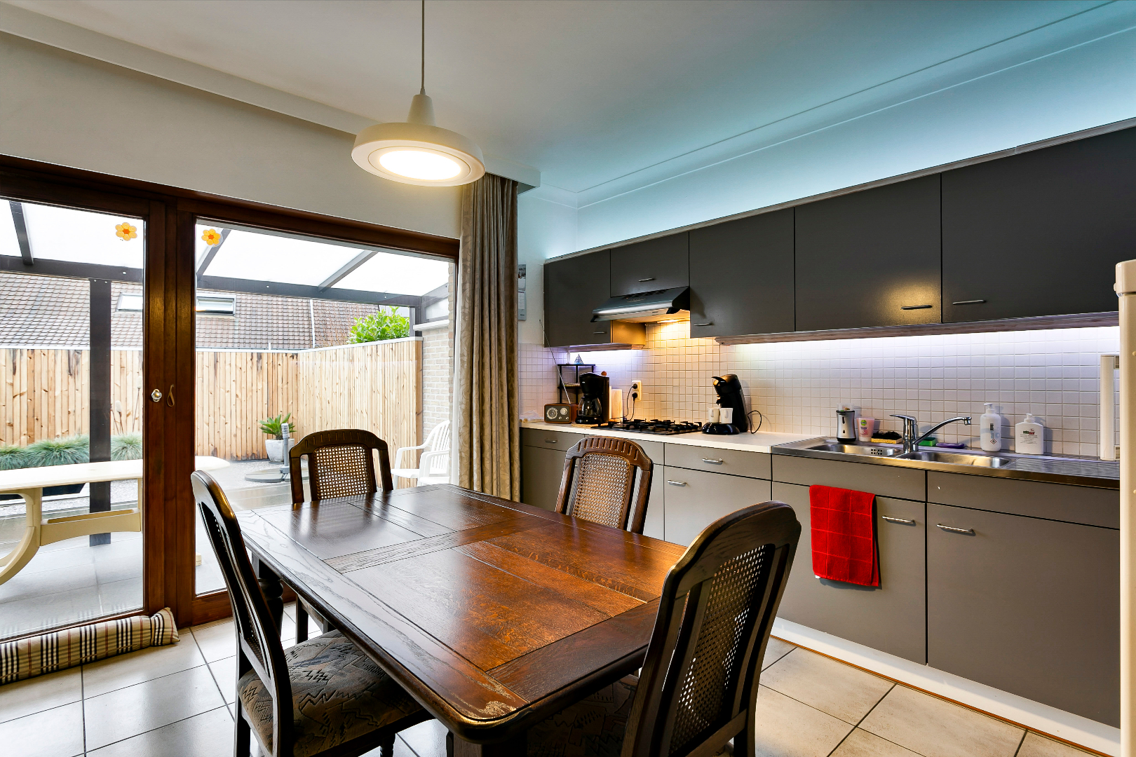 Via de voortuin komen we de woning binnen via de hal met gastentoilet. De living is ingedeeld in een zithoek en eetkamer en strekt zich uit van voor- tot achtergevel. Door de vele raampartijen is het hier heel aangenaam en lichtrijk! Er is ook aansluiting voor een gashaard. Aansluitend vinden we de ruime keuken met plaats voor keukentafel.
