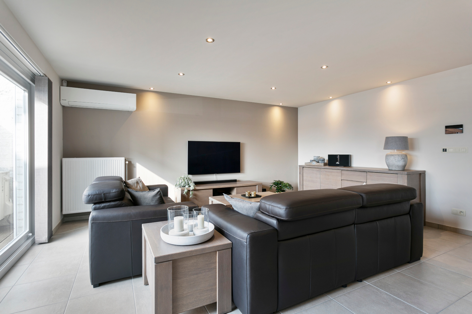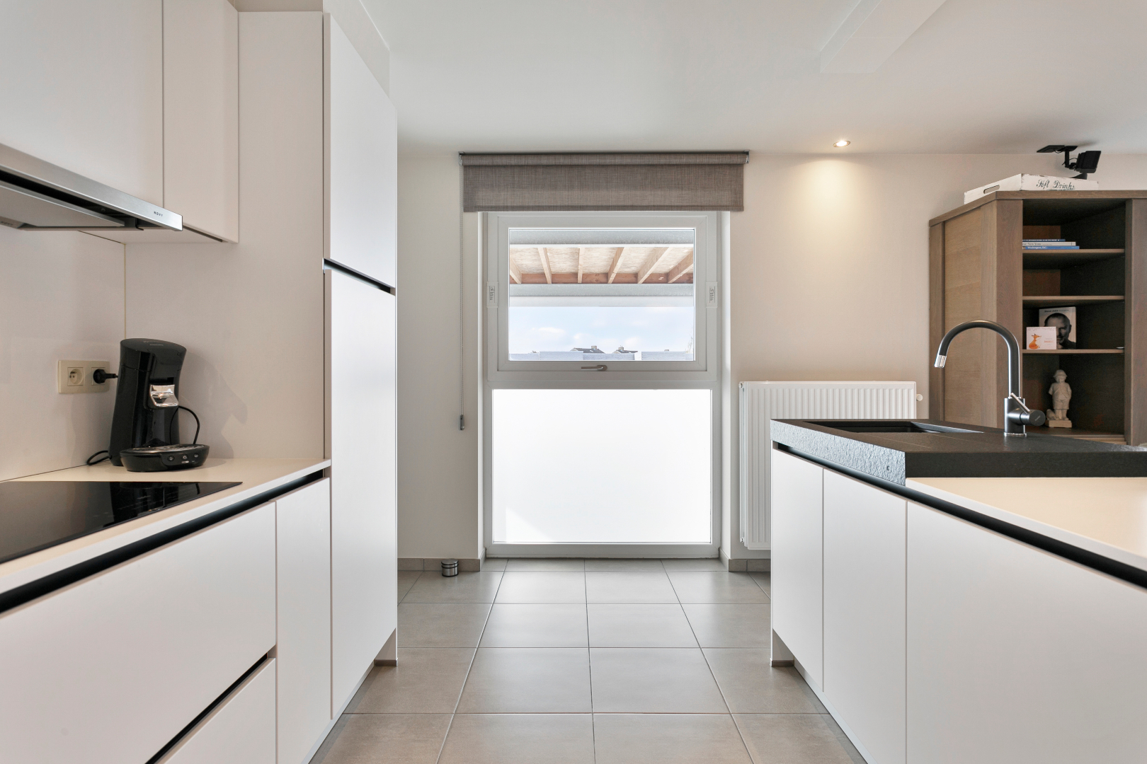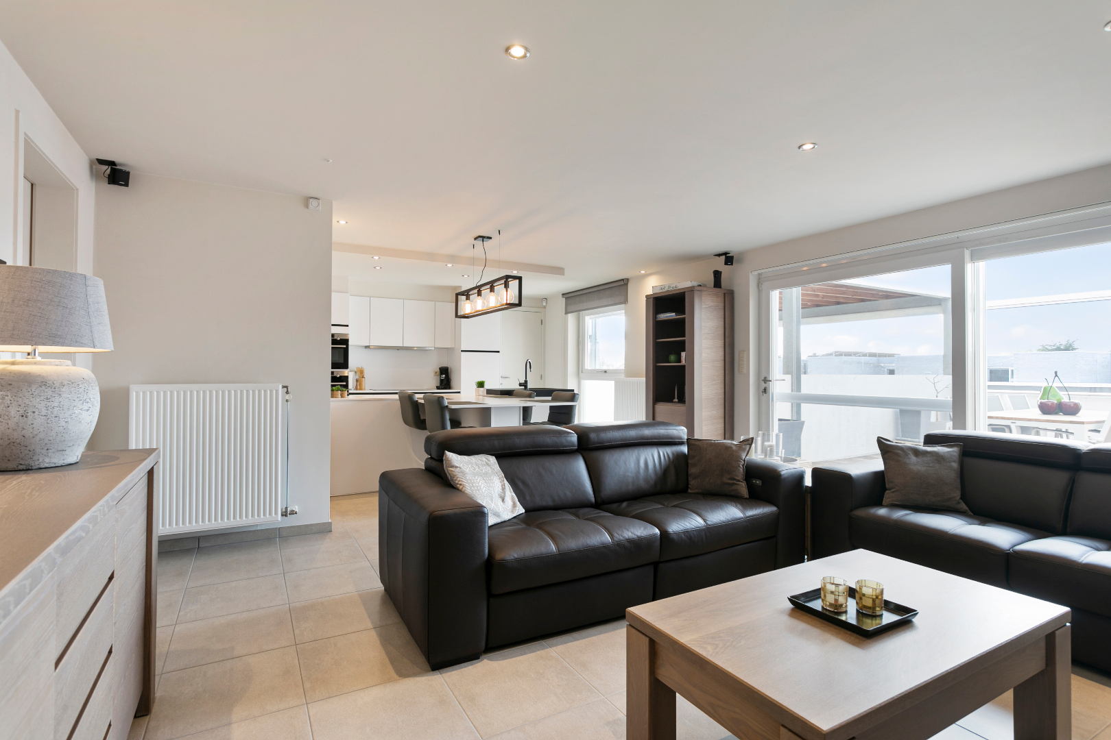 Vanuit de inkomhal hebben we toegang tot de 3 slaapkamers, het aparte toilet, de badkamer of de uiterst lichtrijke leefruimte met open keuken. De leefruimte is echt om de vingers van af te likken. De vele ramen maken het hier zalig genieten. Hier is niets standaard. Alhoewel het om een heel recent appartement gaat, werd de keuken in 2018 volledig vervangen door een prachtige maatkeuken met bijhorend eeteiland. Naast de keuken bevindt zich een handige berging. Vanuit het salon hebben we ook een mooi zicht op het grote terras. Het schuifraam beschikt over zonnescreens. De airco houdt het in zomer heerlijk koel. Op het terras is er een zee aan ruimte. Ook aan de voorzijde van het terras is er nog een extra zonnescreen aanwezig.