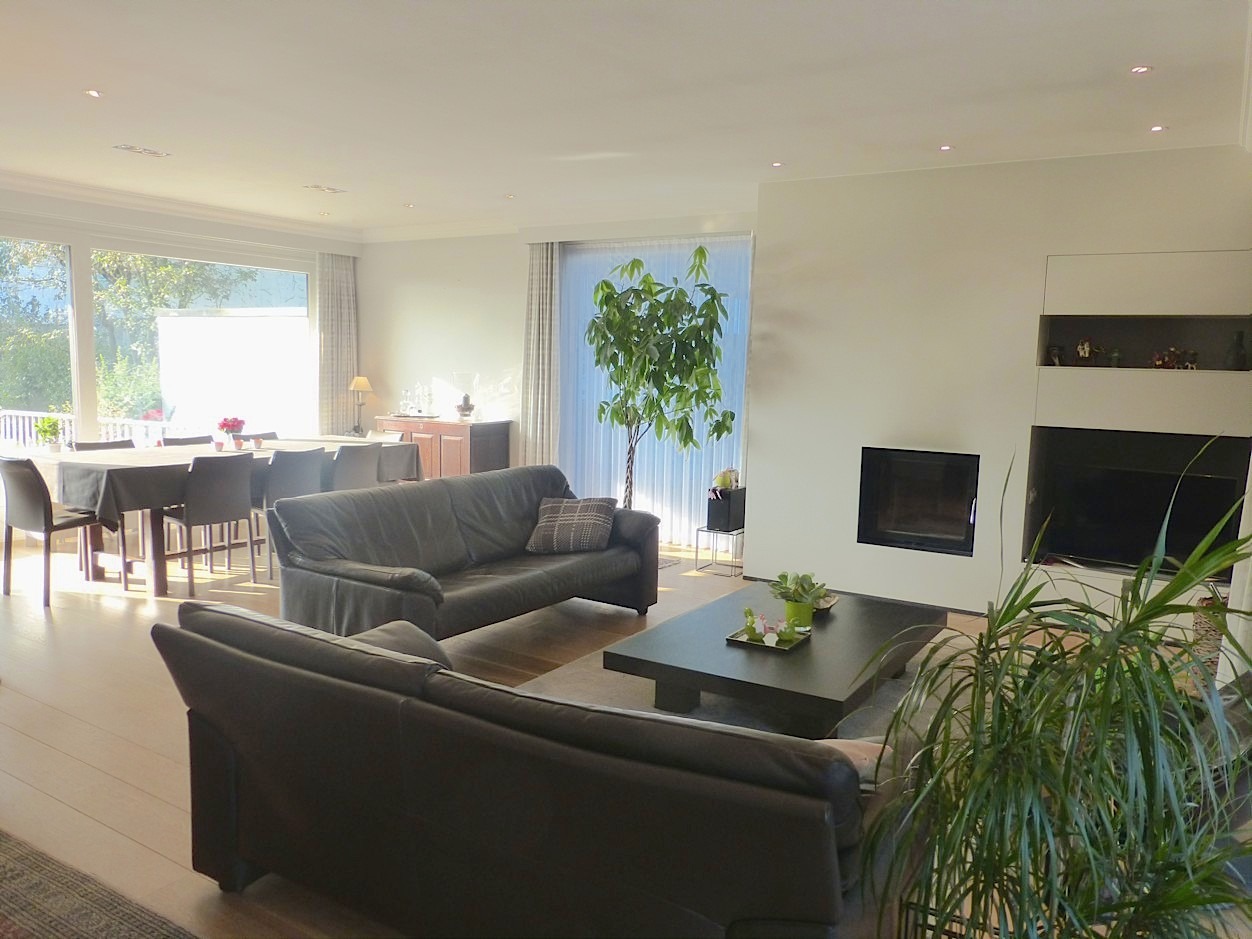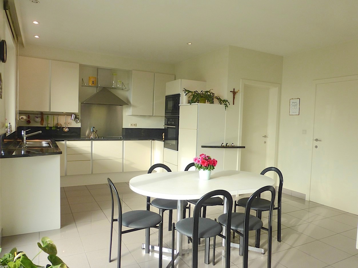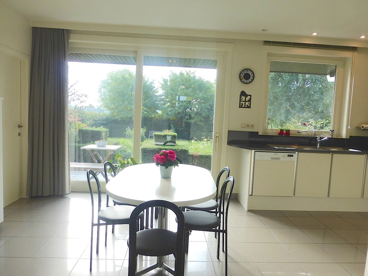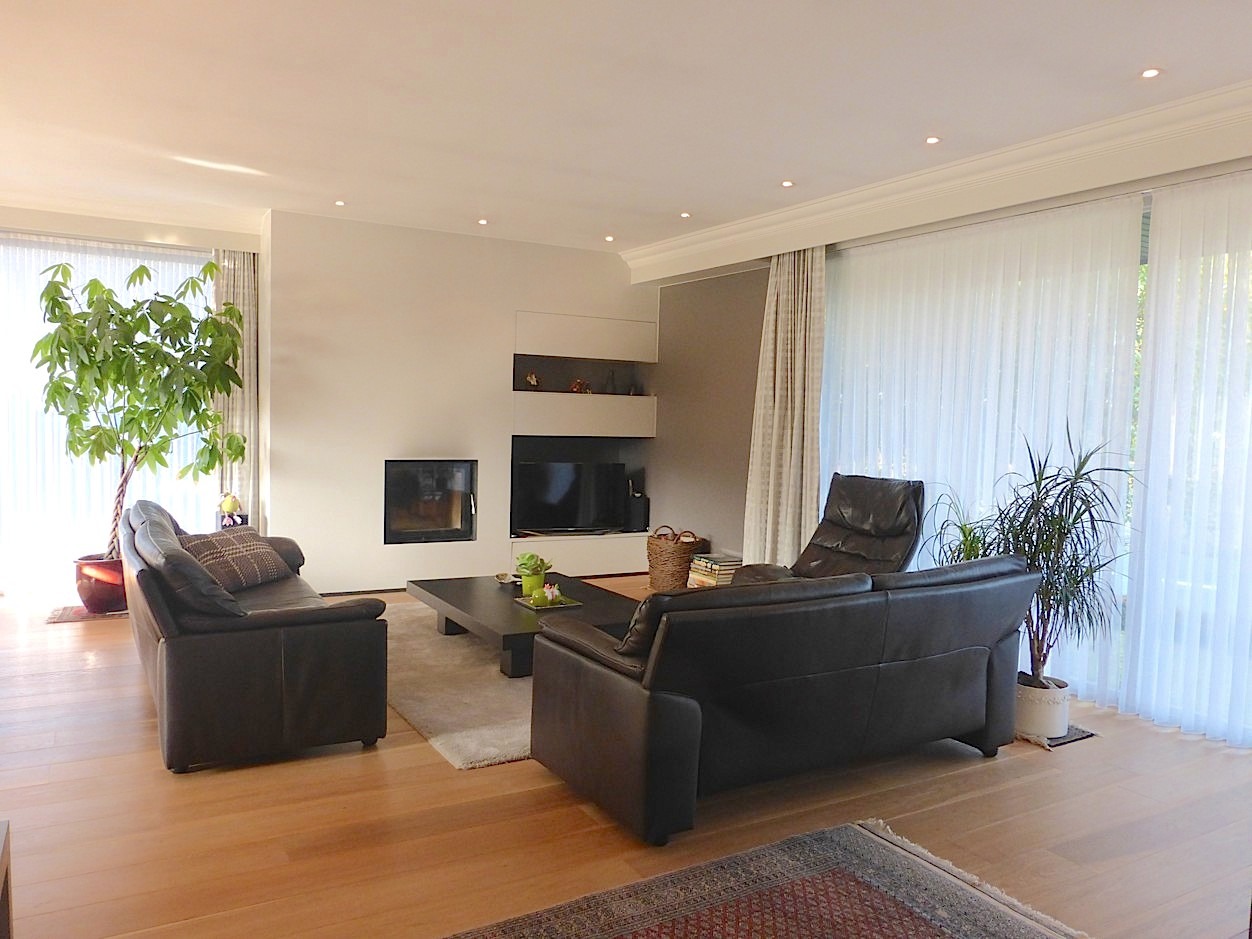 We betreden de woning in de ruime centrale inkomhal met vestiaire en gastentoilet. Bij het binnenkomen in de stijlvolle leefruimte valt meteen de overvloed van licht op door de vele raampartijen, die we rondom terug vinden. Op elk moment van de dag komt dan ook ergens wel de zon naar binnen. Het prachtige parket, de mooie inrichting en de haard zorgen voor een zeer gezellig en aangenaam gevoel. Aansluitend vindt men de leefkeuken, die volledig is ingericht. Er is tevens een zeer handige en ruime bijkeuken.