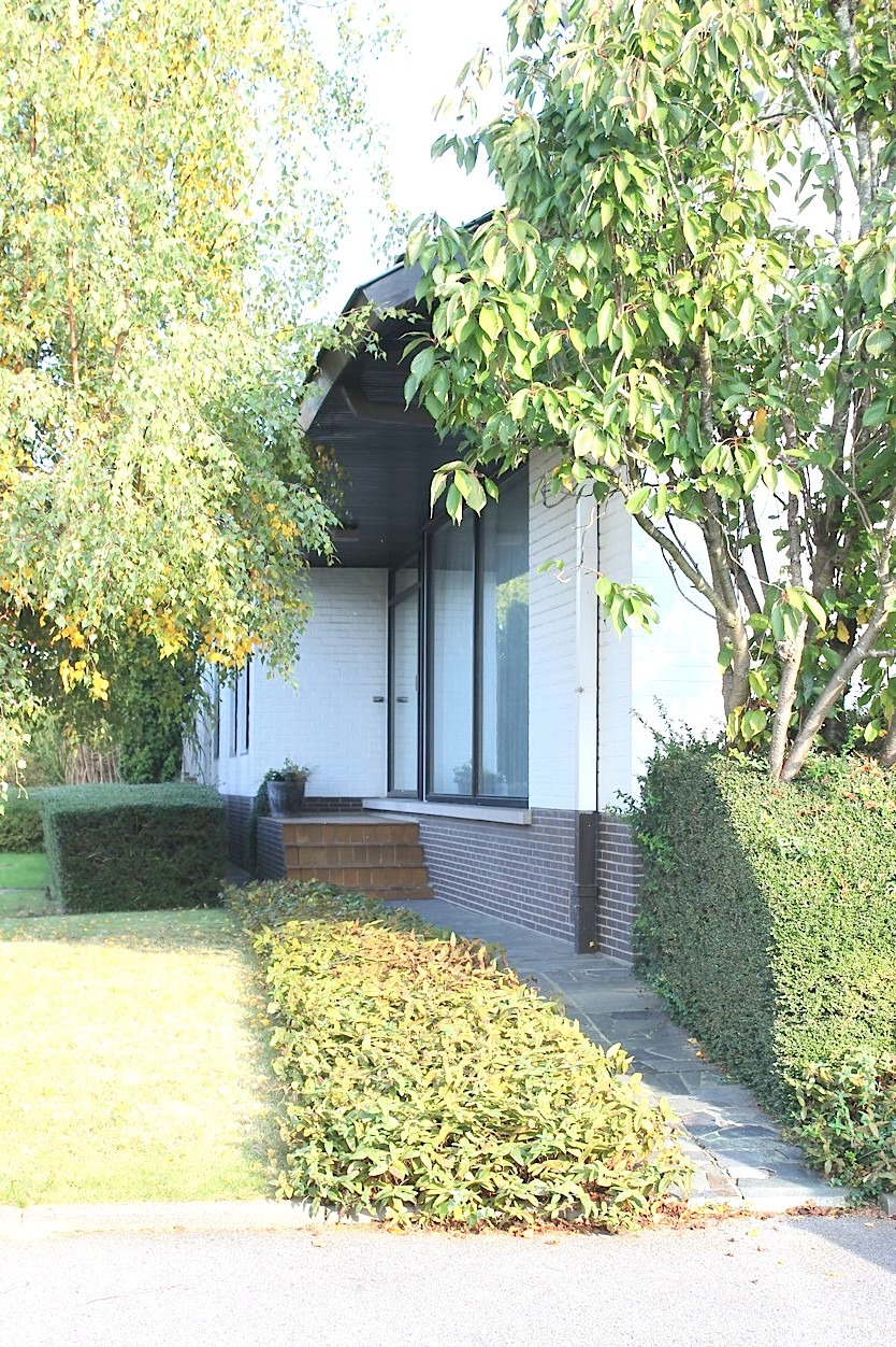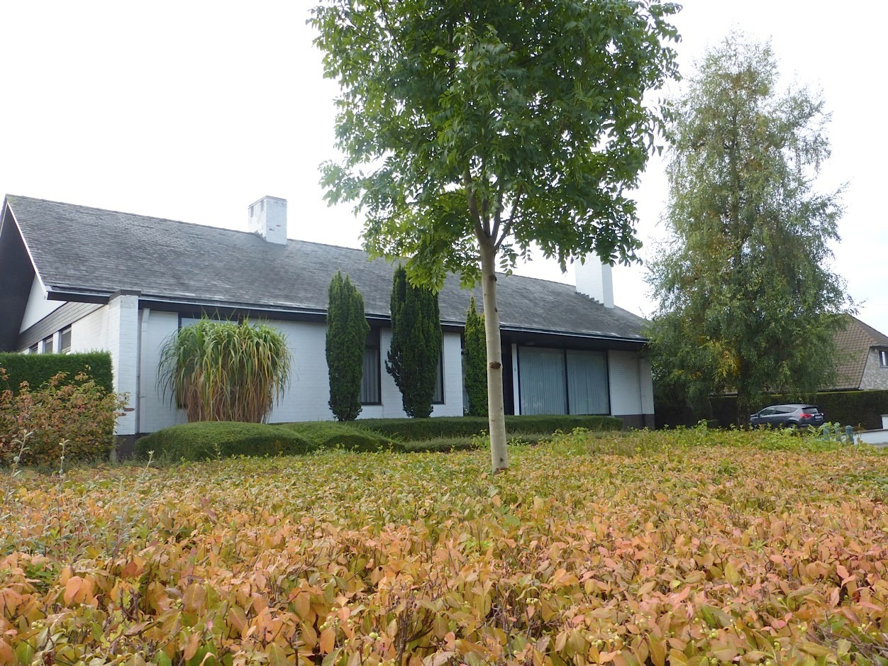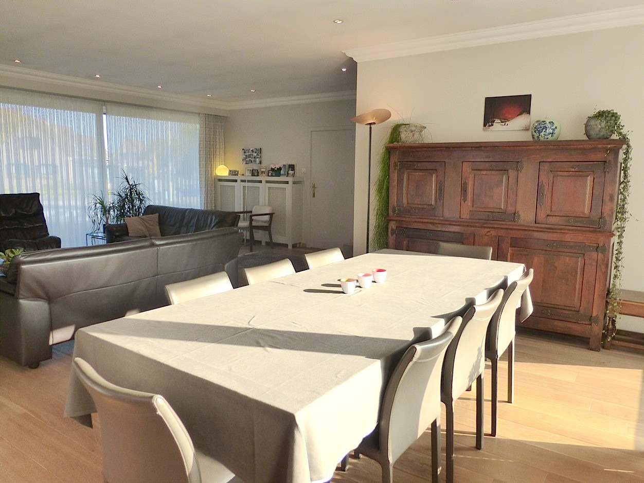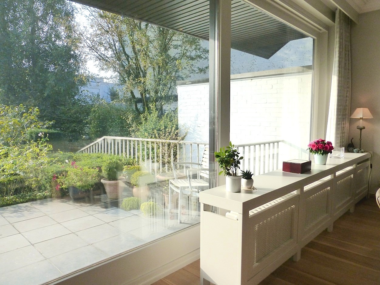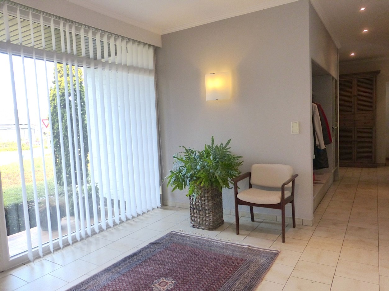 We betreden de woning in de ruime centrale inkomhal met vestiaire en gastentoilet. Bij het binnenkomen in de stijlvolle leefruimte valt meteen de overvloed van licht op door de vele raampartijen, die we rondom terug vinden. Op elk moment van de dag komt dan ook ergens wel de zon naar binnen. Het prachtige parket, de mooie inrichting en de haard zorgen voor een zeer gezellig en aangenaam gevoel. Aansluitend vindt men de leefkeuken, die volledig is ingericht. Er is tevens een zeer handige en ruime bijkeuken.