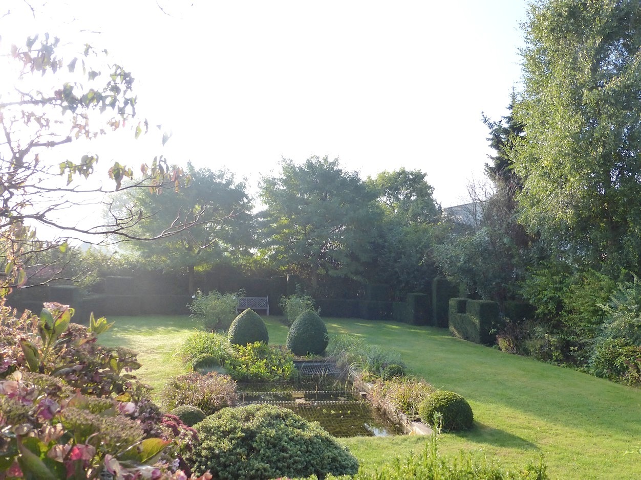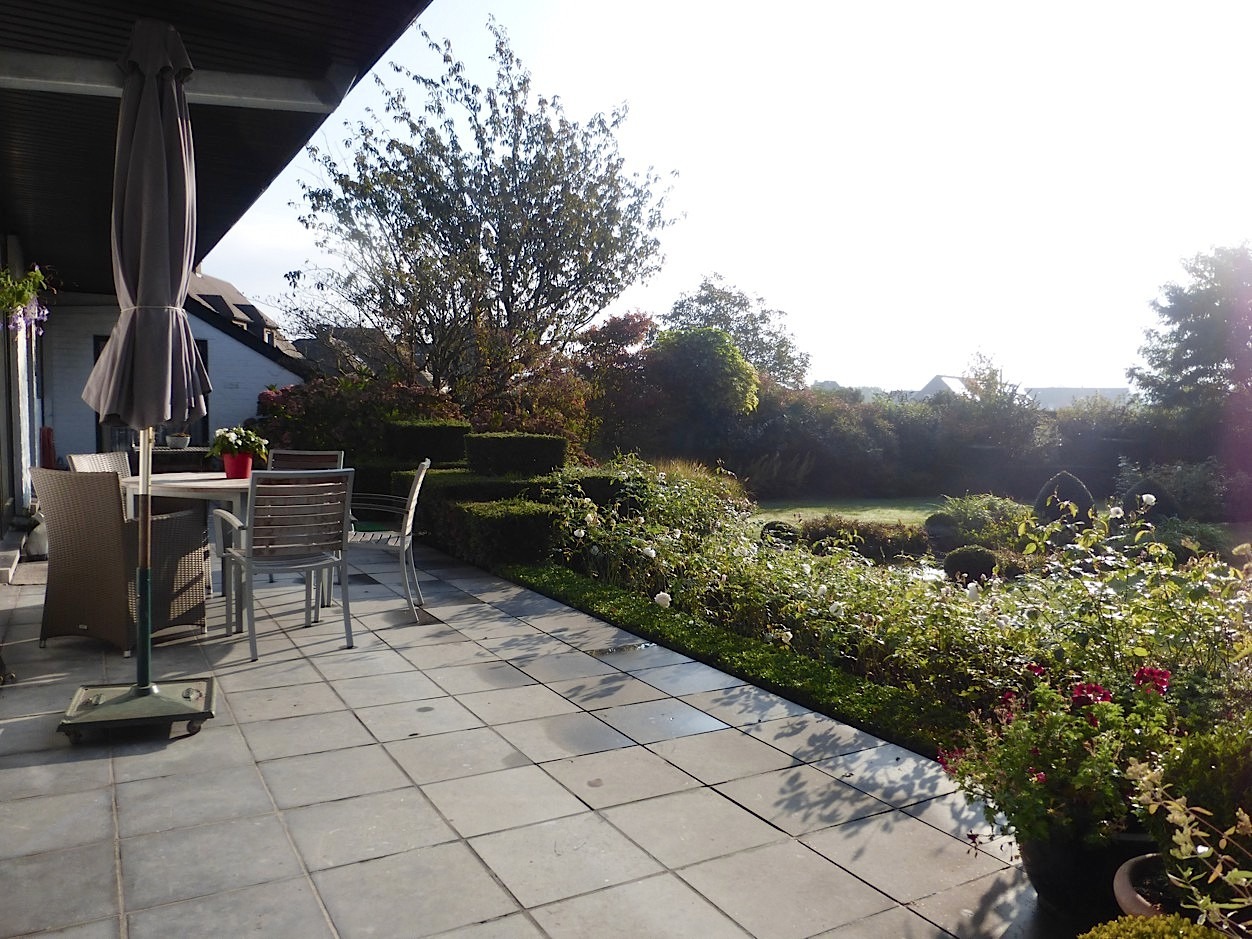 Zowel vanuit de living als de keuken kunnen we naar het grote terras, van waarop we een mooi zicht hebben op de prachtig aangelegde tuin met visvijver, vele gezellige hoekjes en een leuk speelbosje! Door de ideale zuidoriëntatie en de volgroeide tuin is het er genieten in alle rust en privacy!