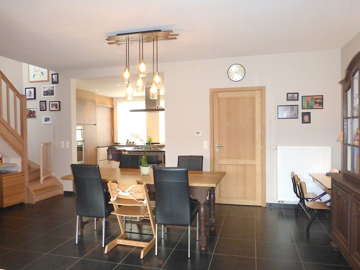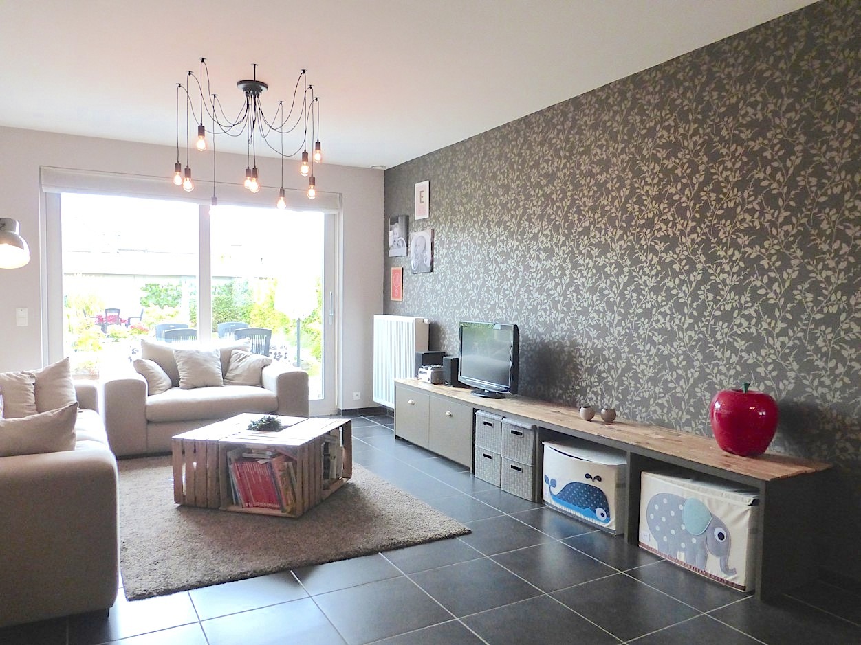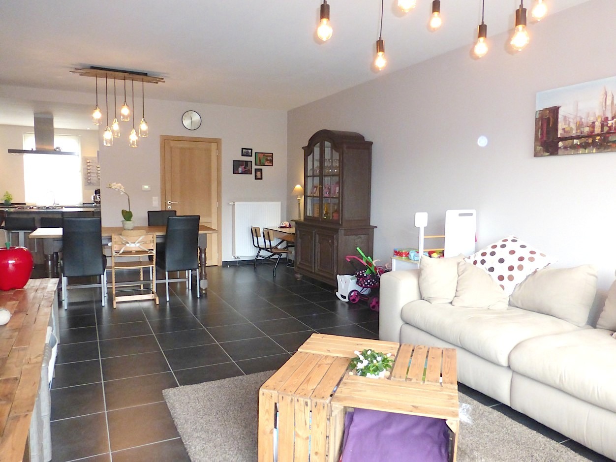 De voorgevel bepaalt al meteen de toon: een verzorgde woonst in een rustgevende, landelijke stijl... We komen binnen via een hal met apart gastentoilet om verder te gaan in de living. Door het grote schuifraam naar de tuin, de L-vorm en de open keuken hebben we een aangenaam ruimtegevoel. De keuken beschikt over een tof kookeiland, veel kasten en is volledig uitgerust.
