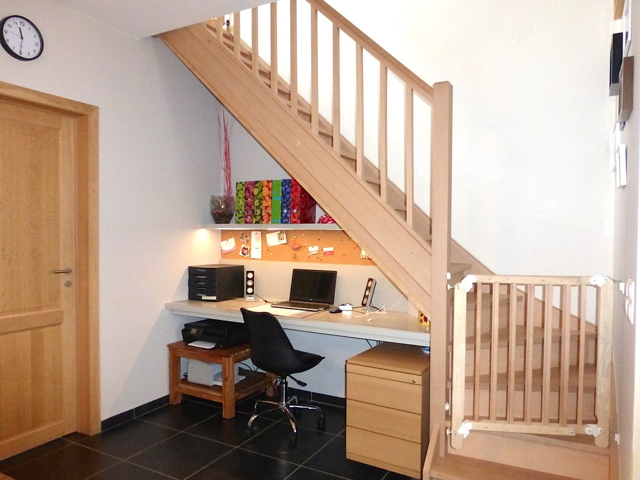 De ruimte onder de trap is ingericht als bureau: zeer handig!